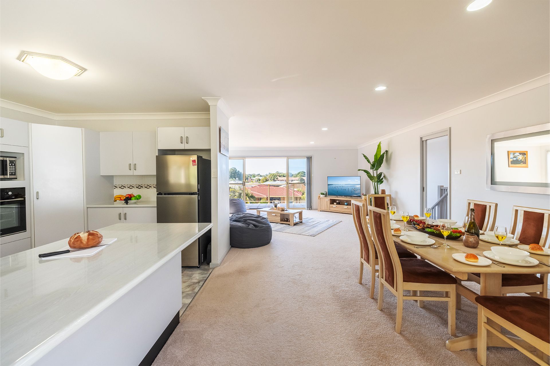 The kitchen is fully equipped and has complete cooking facilities including electric cooktop, wall oven, Air Fryer, microwave, family size fridge/ freezer and dishwasher, there is even a DeLonghi coffee pod machine available. The enclosed back deck area has dining for six people, electric BBQ and is perfect for the beloved fur baby to sleep – the owners provide a small dog bed and bowls.