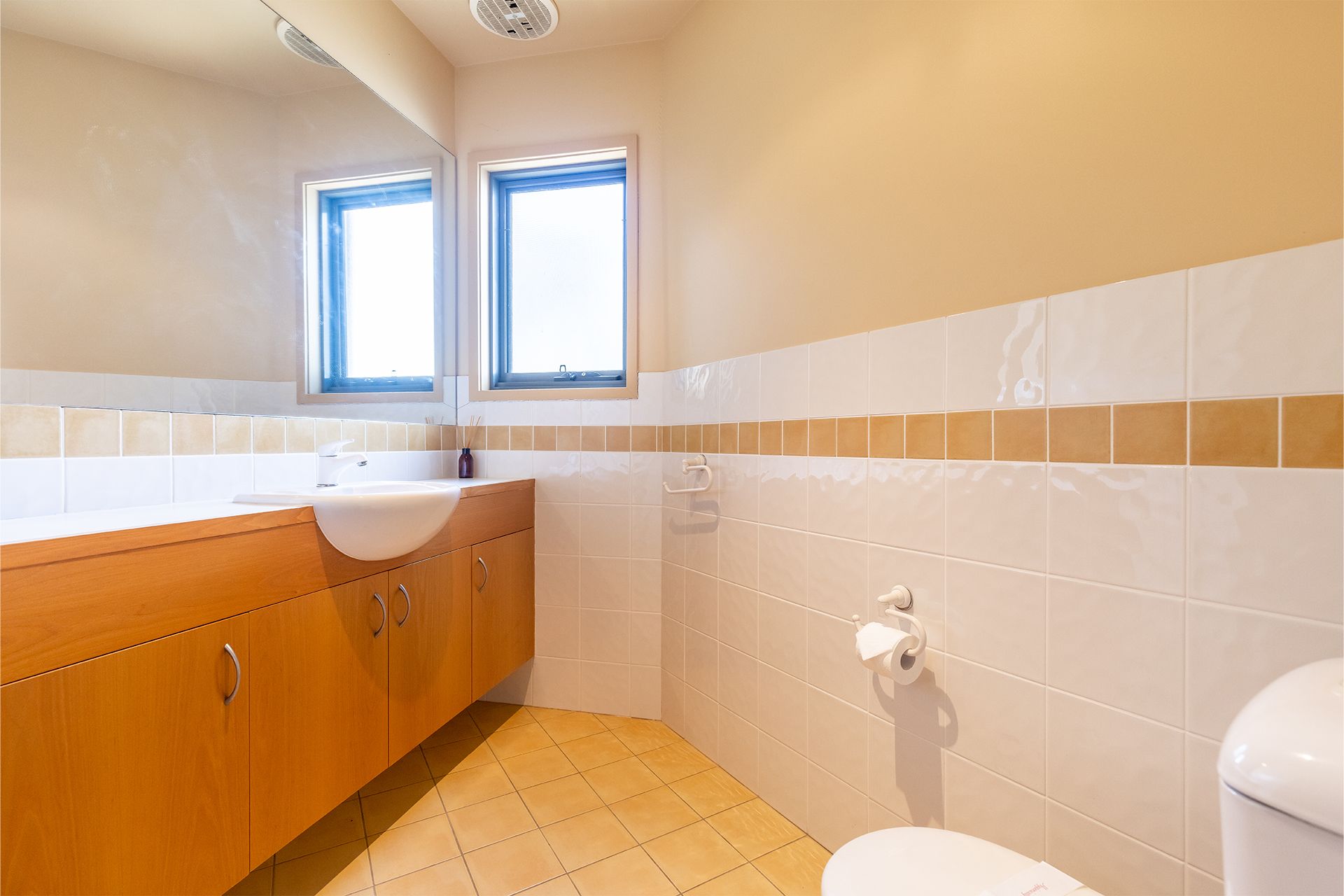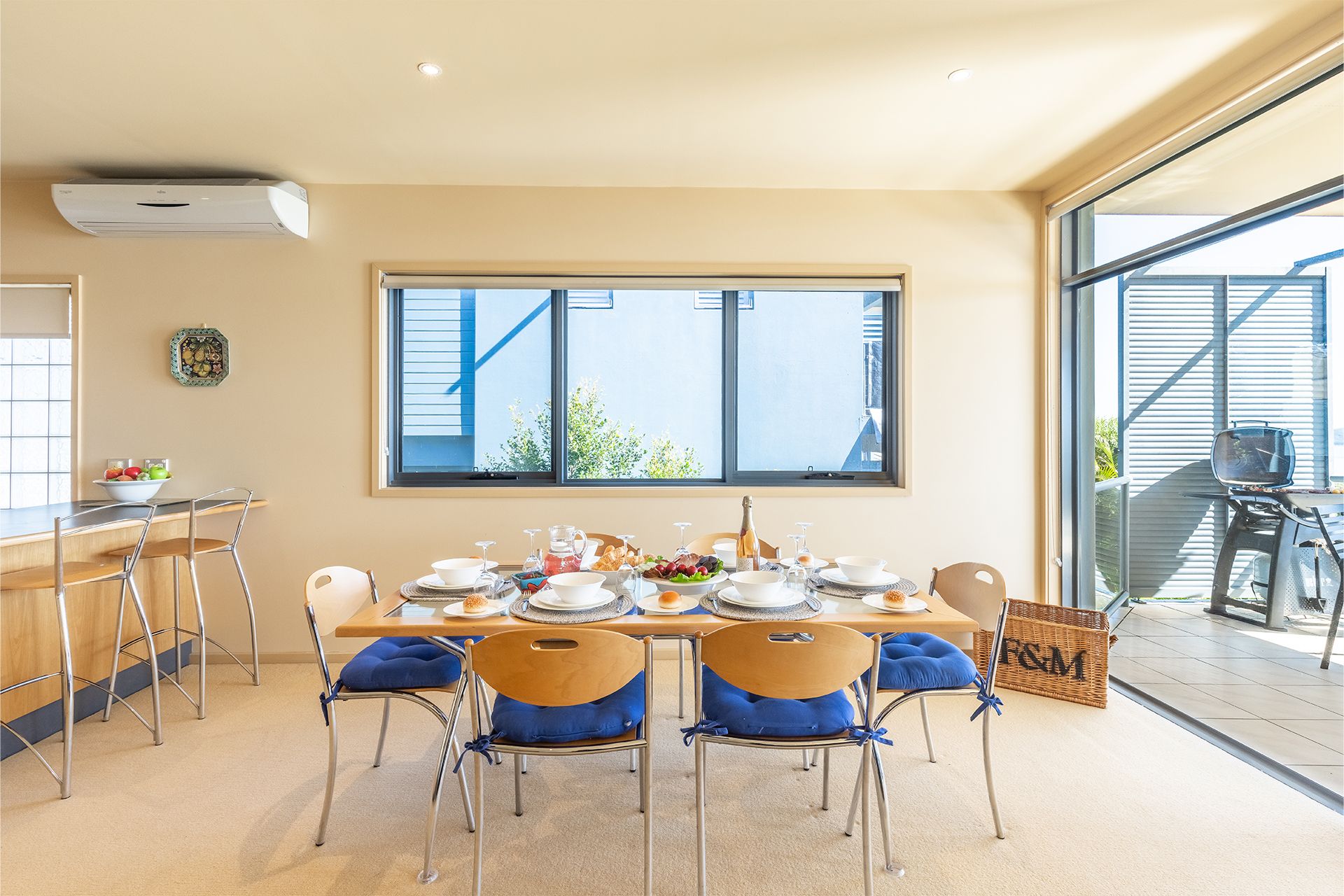On the middle section of the split-level design is a spacious open plan living area featuring a split system air conditioner, Smart TV, DVD and CD player, games, books, and Wi-Fi. Opening off this dining/ living area is an undercover outdoor alfresco area where there is a gas BBQ and dining furniture. What better way to sit back, relax and take in the beautiful relaxing surrounds.