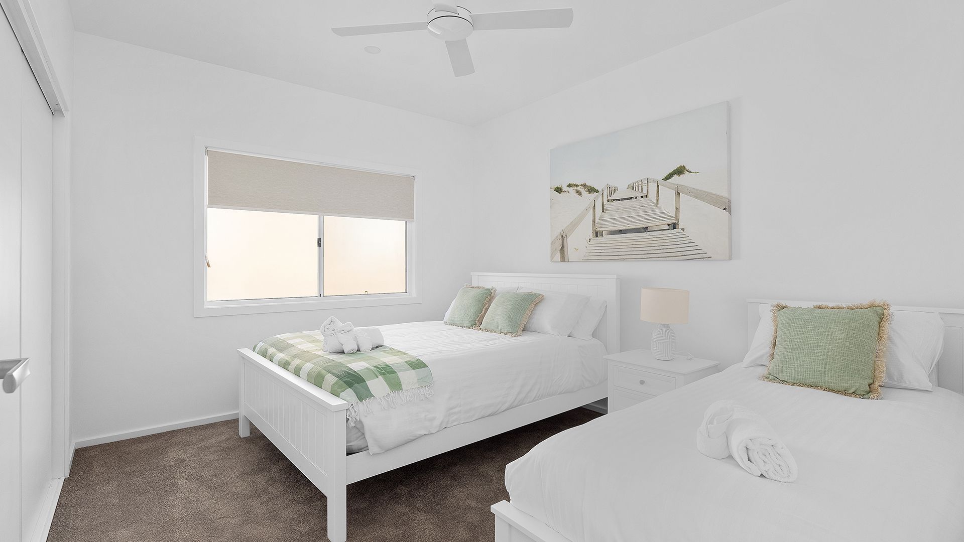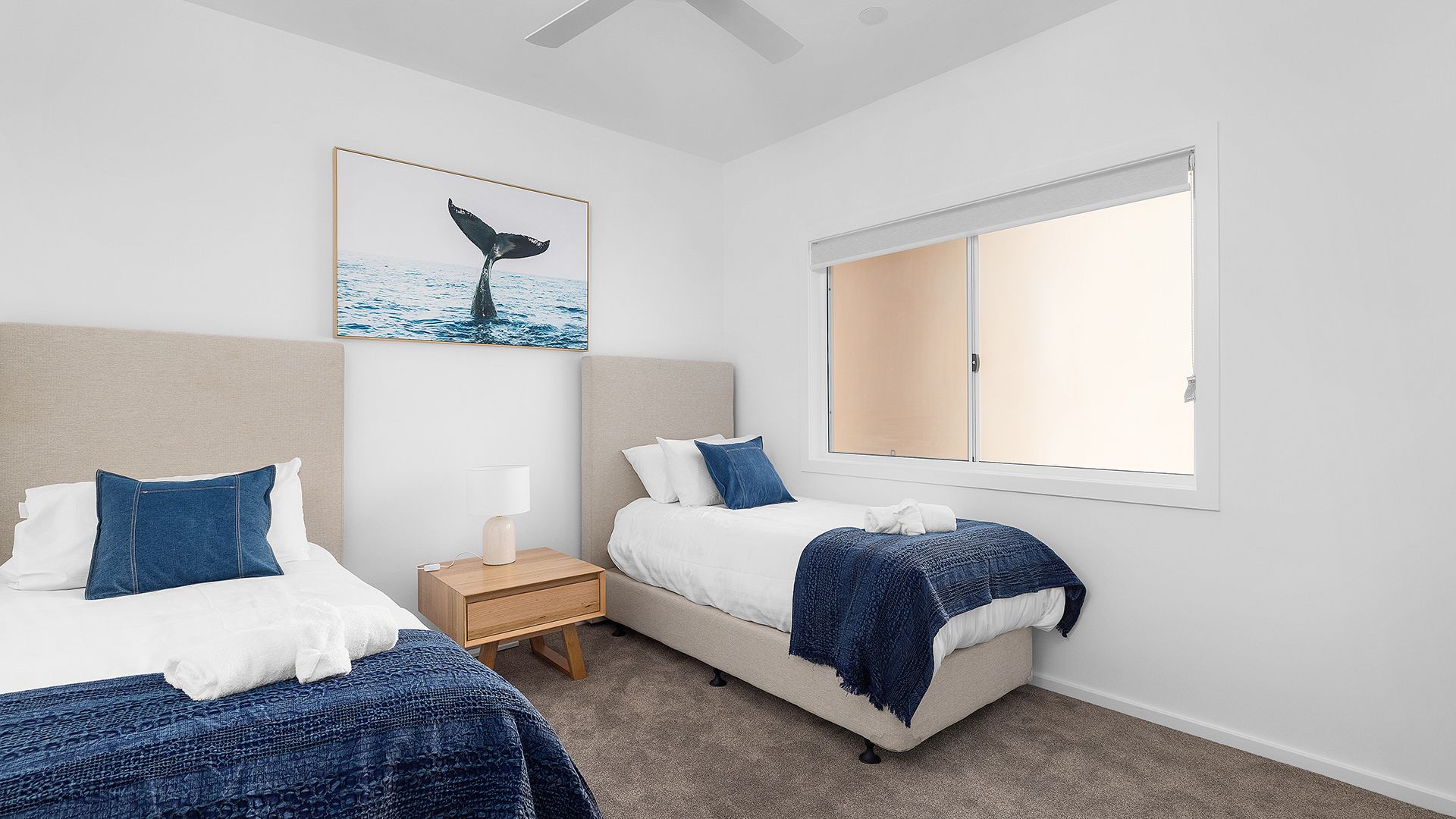 Bedroom 3 (upper level) – 2 x Single Beds + Ducted Air Conditioning + Ceiling Fan + Linen + Bed Making provided