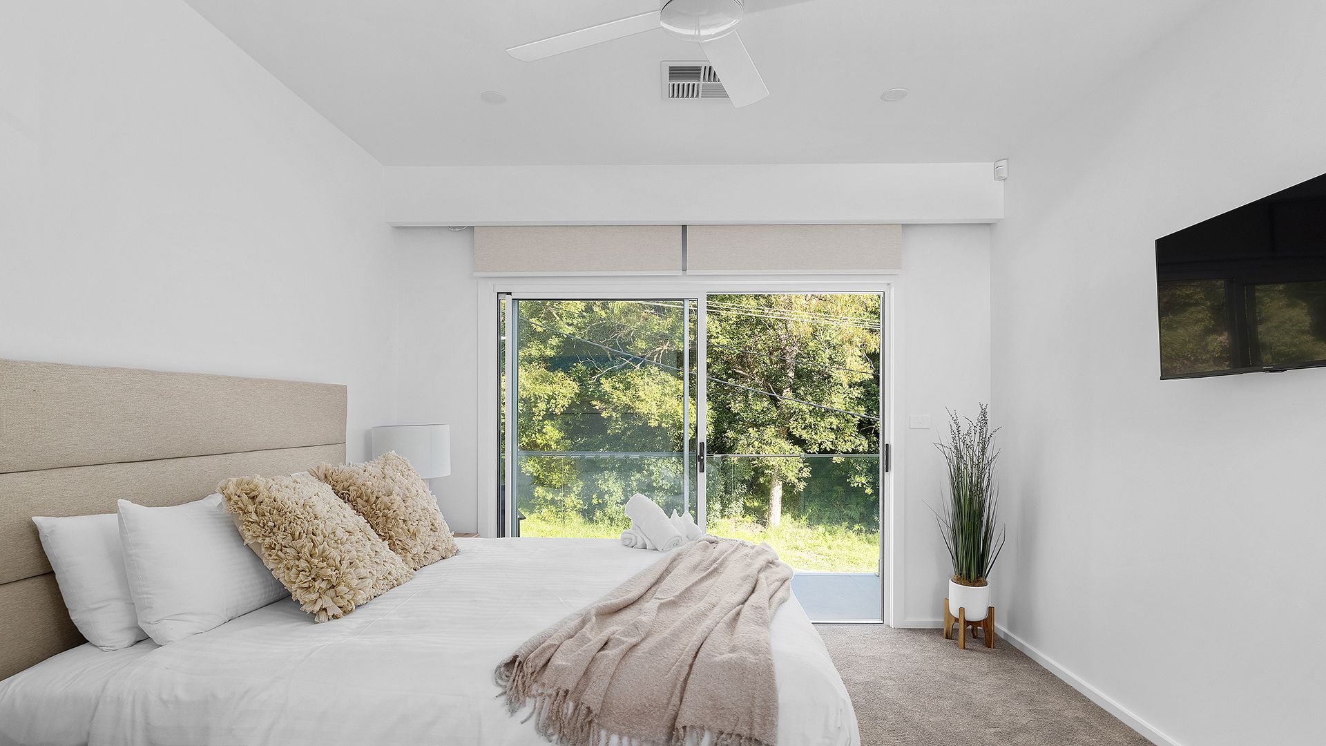 Bedroom 2 (upper level) – King Bed + Ducted Air Conditioning + Ceiling Fan + TV + Ensuite + Linen + Bed Making provided