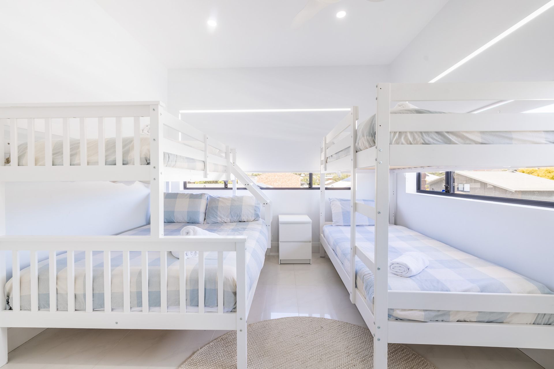 The master suite envelopes you with its tranquillity, featuring a Queen-size bed and an ensuite that is a realm of relaxation, the main bathroom is also located upstairs and has its very own spa bath. The second bedroom is a haven of luxury with a Queen-size bed and the third bedroom, perfect for the youngest guests with a Tri-bunk (double underneath and single above) and single bunk with single bed below and single bed above, the fourth bedroom also features a Queen bed. Each bedroom flaunts the essence of a holiday home with its refreshing ambience and design.