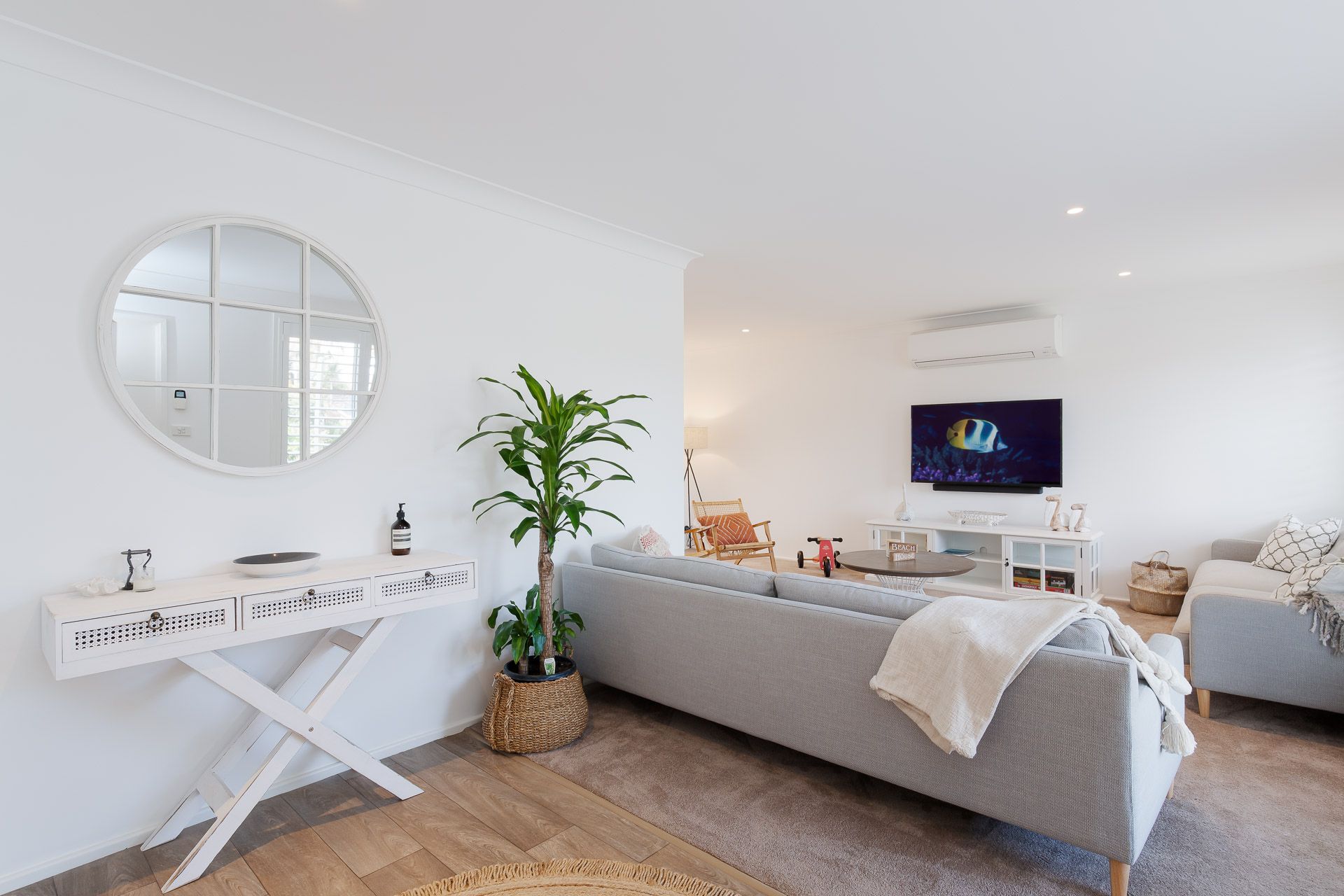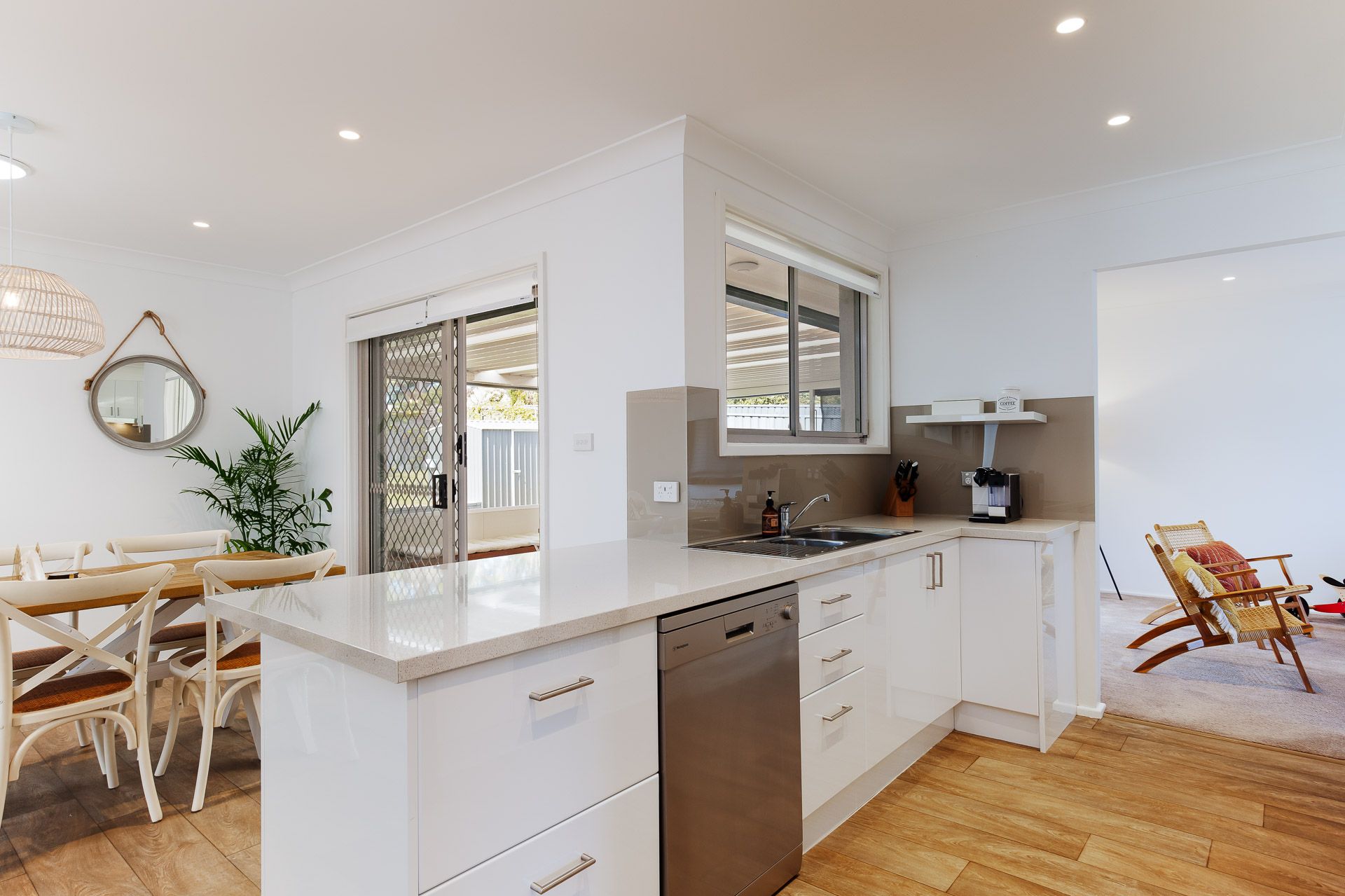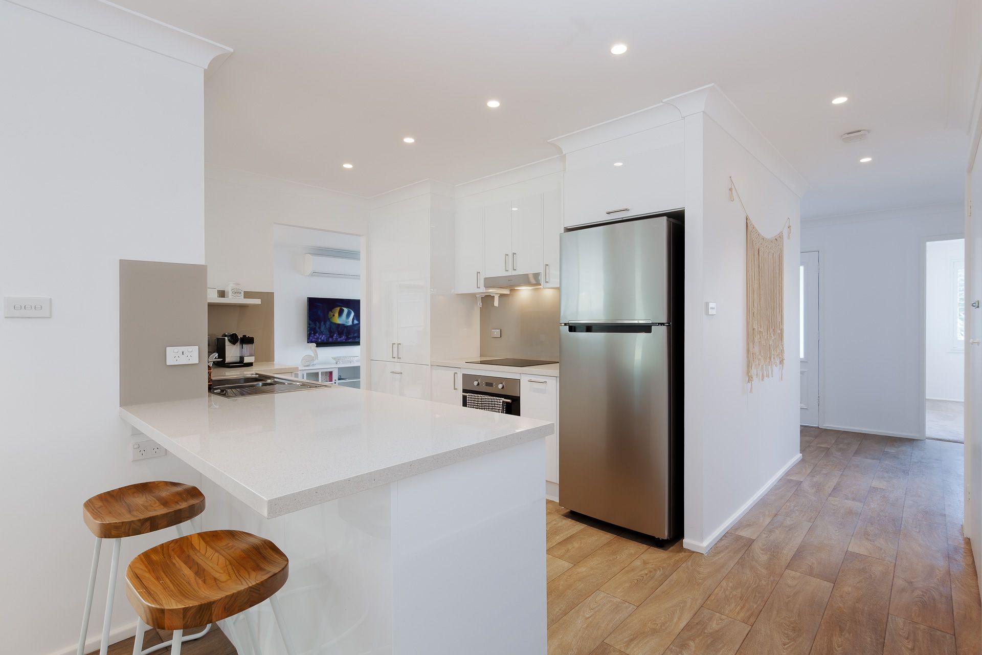 Entering the home you’ll be positioned in the open-plan living hub with stylish furnishings and chic fixtures with the accents of comfortable soft neutral finishes that make for a luxurious and welcoming ambience. The living area has a split system air-conditioner, free WIFI and a large wall mounted SMART TV.