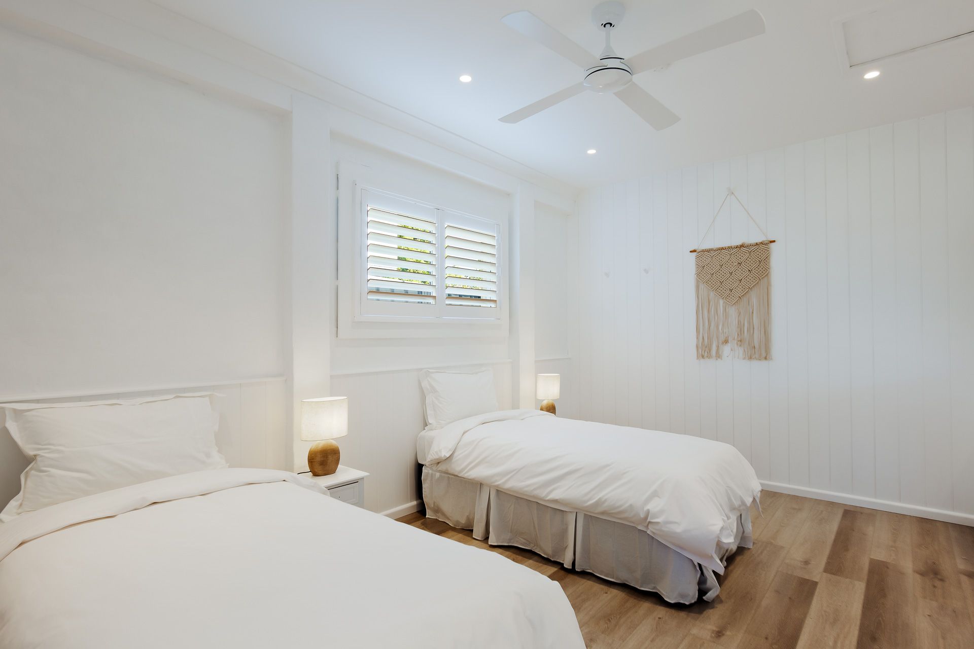 Bedroom 4 (sleepout) – Queen Bed + 2 x Single Beds + Ceiling Fan + Linen + Bed Making