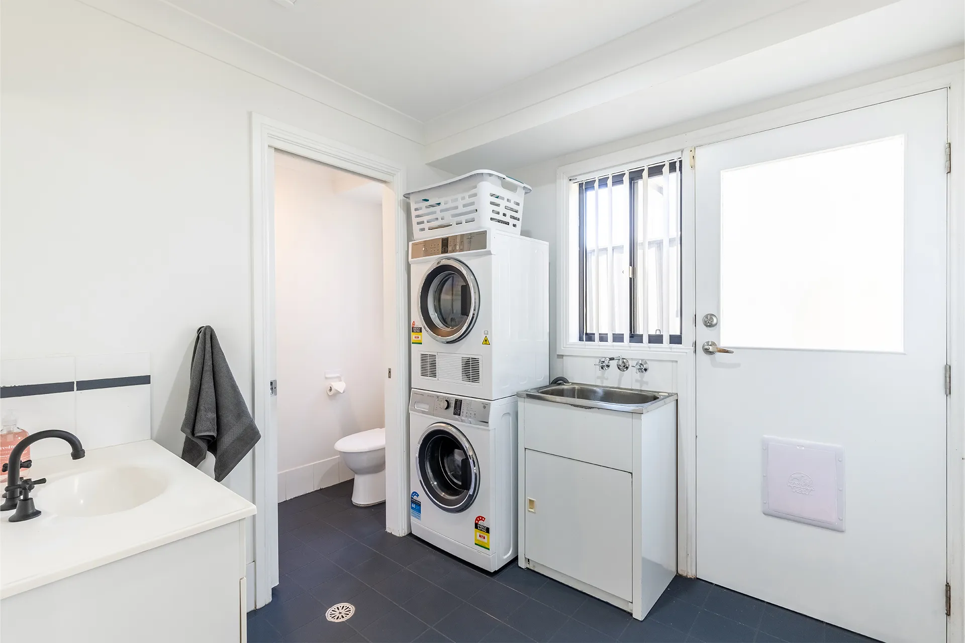 A large internal laundry is equipped with a front loader washing machine and dryer. An iron and ironing board is also provided. A third toilet and shower are connected to the internal laundry with direct access from the side of the house so you can quickly rinse off after a enjoyable day at the beach.