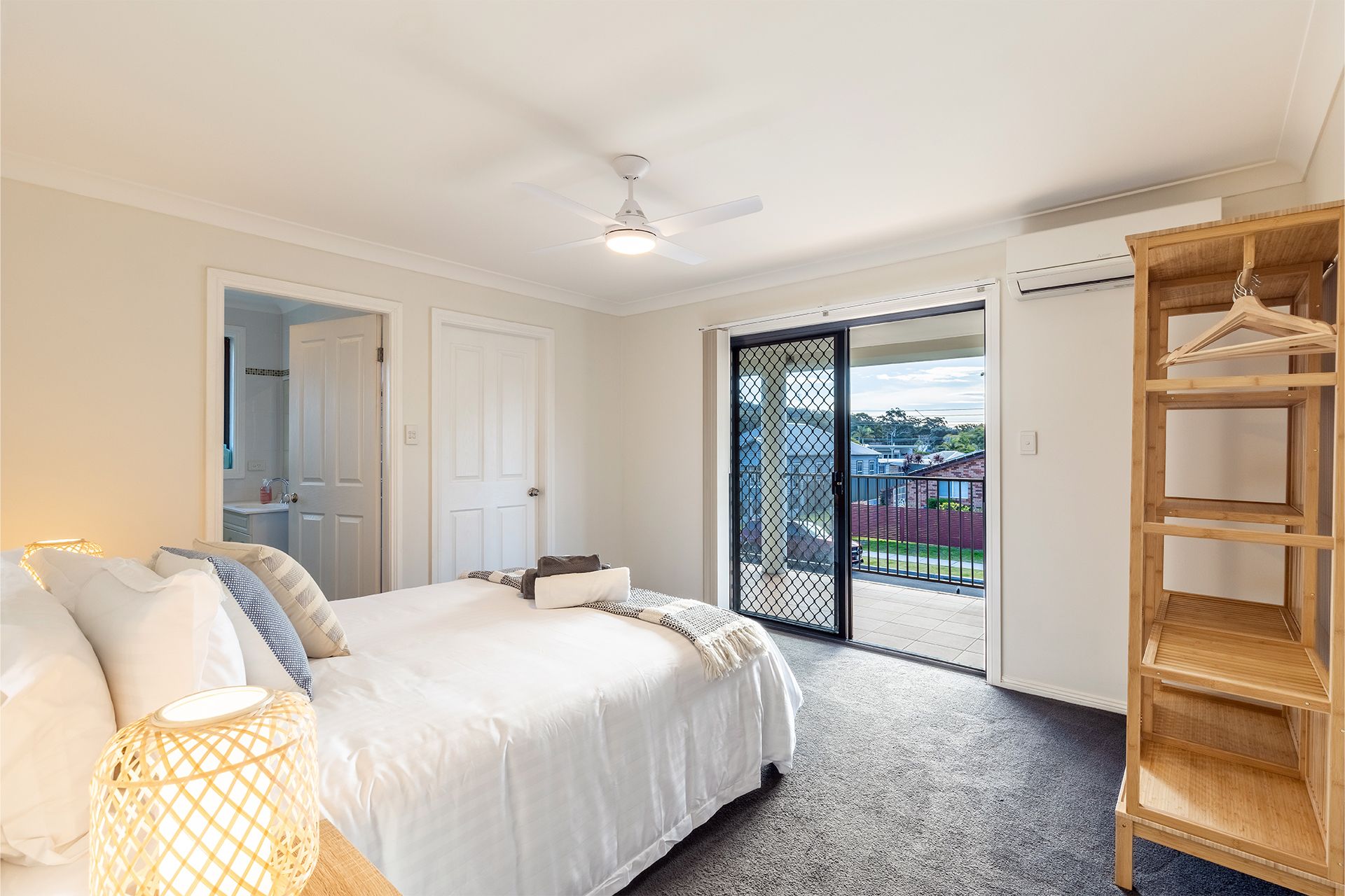 Bedroom 1 (upstairs) - Queen Bed + Split System Air Conditioning + Ceiling Fan + Balcony Access + Ensuite + Linen + Bed Making