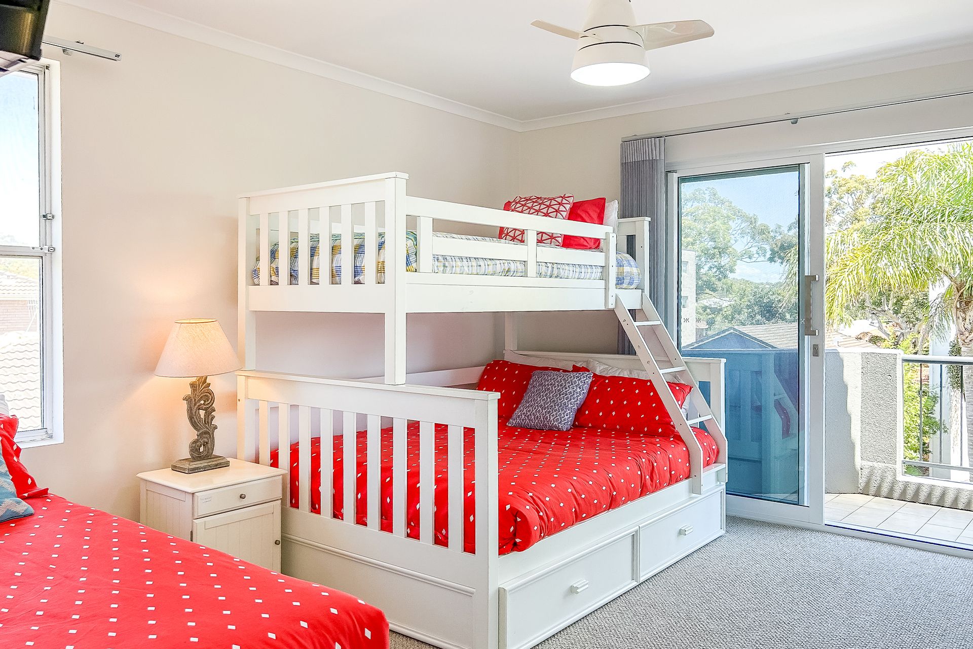 Bedroom 3 - King Single Bed + Tri Bunk (double underneath/ single above) + Trundle + Split System Air Conditioner + Ceiling Fan + TV