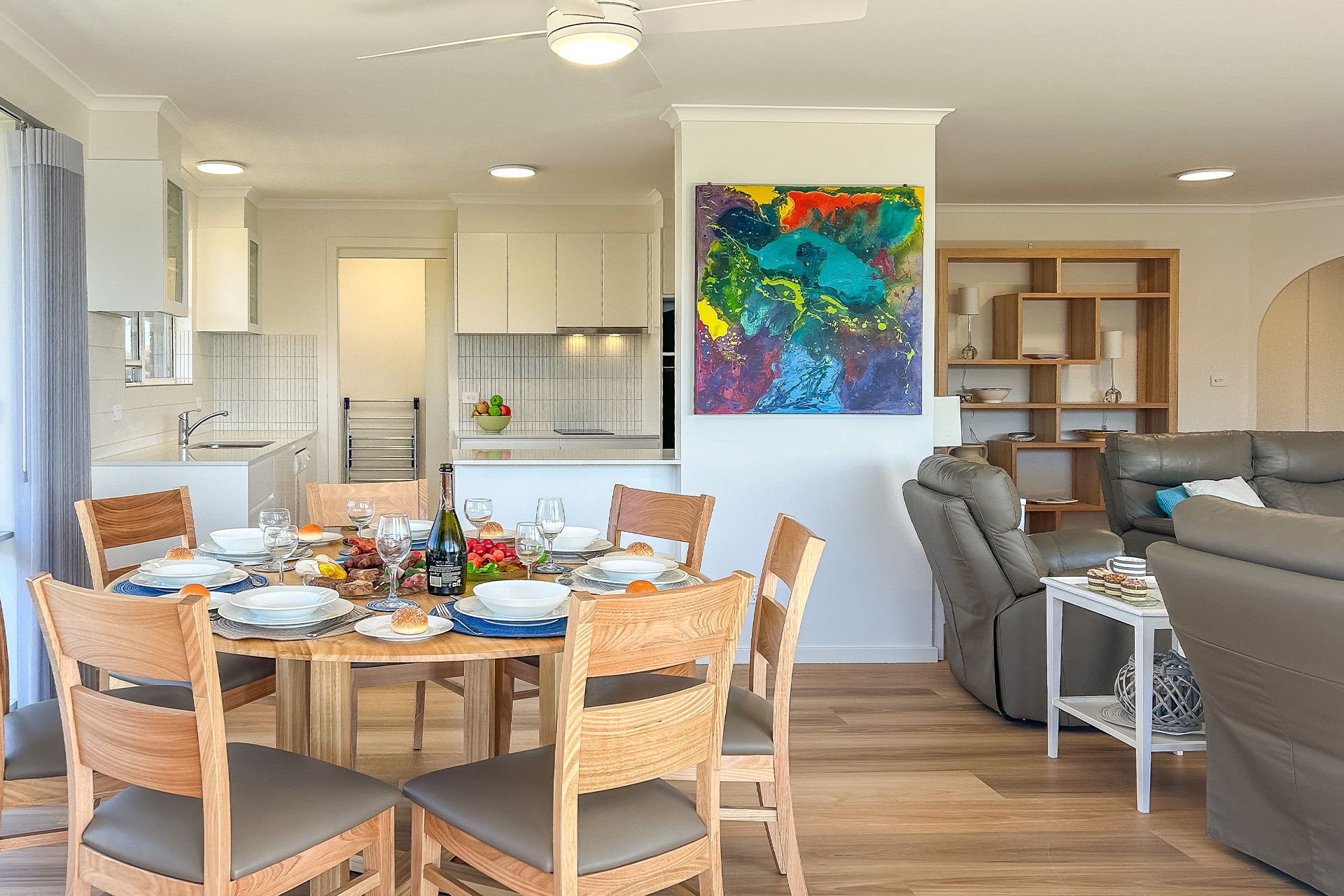 The unit has a spacious living/ dining area with superior flooring, split system air conditioner, ceiling fans and floor to ceiling windows to capture the amazing water views. The unit also provides a large smart TV, free unlimited WIFI, games and books to keep everyone entertained. Glass sliding doors lead out onto the large wrap around balcony so you can enjoy alfresco dining at its best with the amazing water views and beautiful sea breezes.