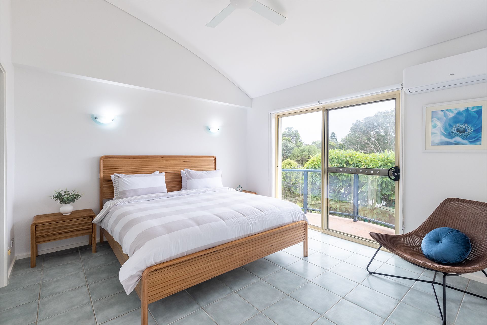 Bedroom 1 (upstairs) – King Bed + Ensuite + Split system air conditioner + Ceiling Fan + Balcony