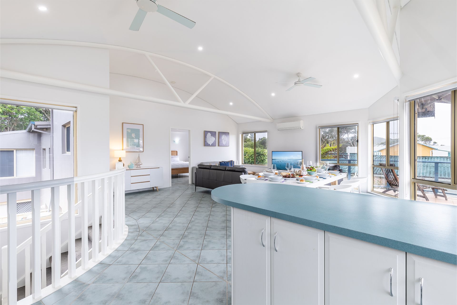 With a trendy layout thoughtfully designed to comfortably accommodate up to 8 guests, Baia Villa boasts three beautifully appointed bedrooms and two spacious bathrooms. The main bedroom located upstairs has a King size bed, balcony access, split system air conditioner and ensuite with a shower, toilet, and vanity. The second and third bedrooms, both with split system air conditioners, are located downstairs long with the main bathroom set with a large corner bath, shower, toilet, and vanity.