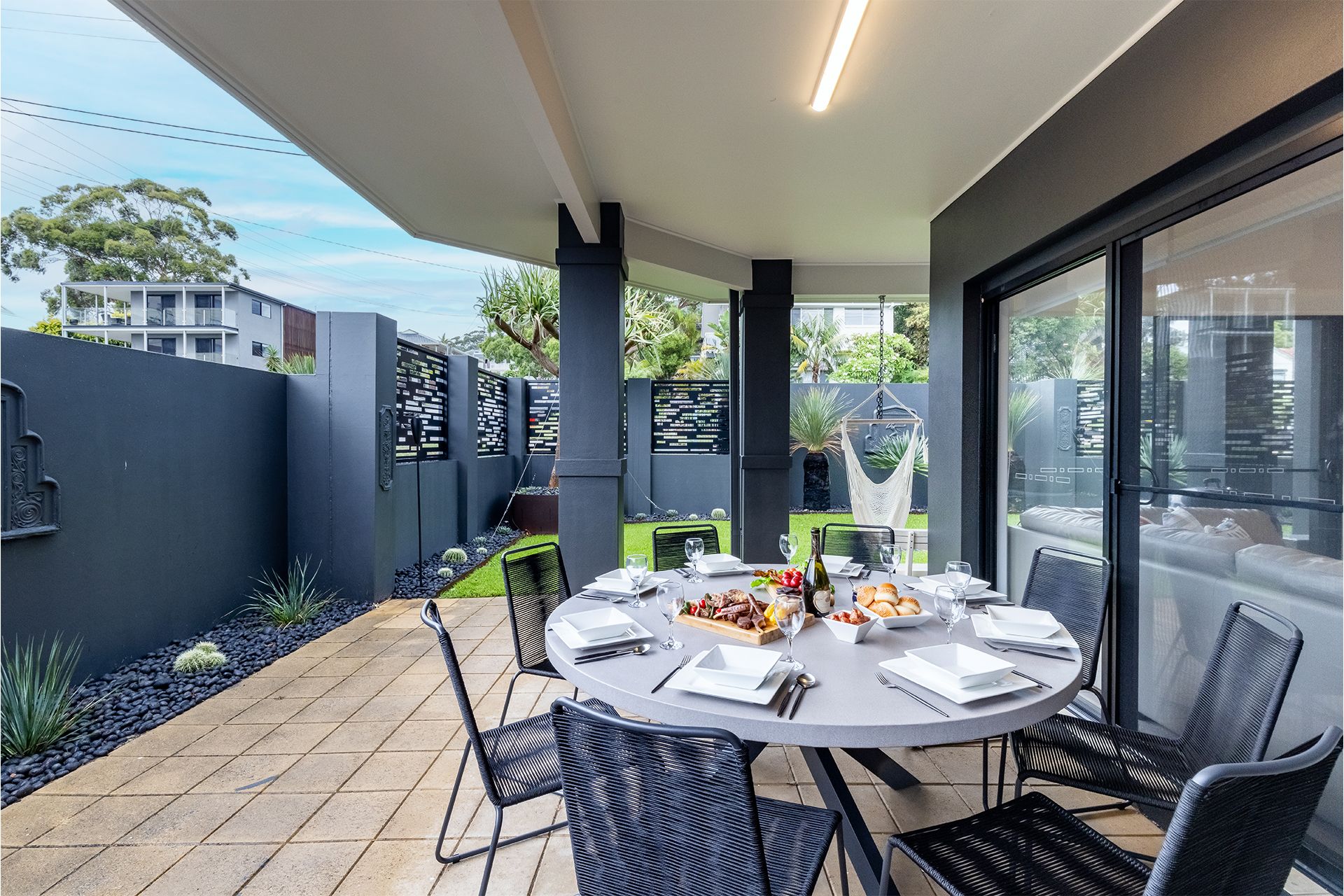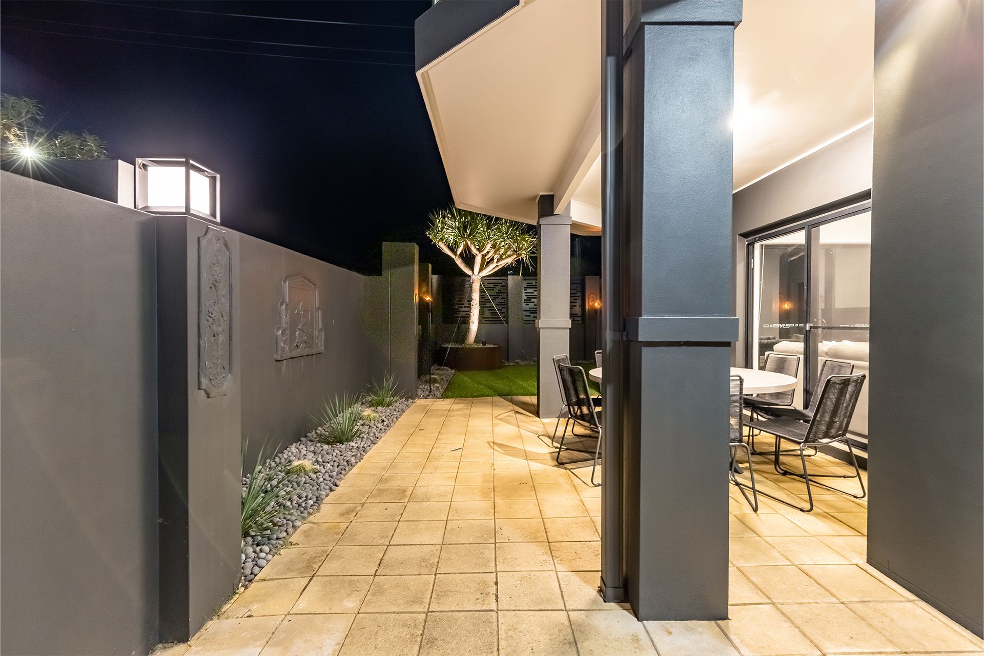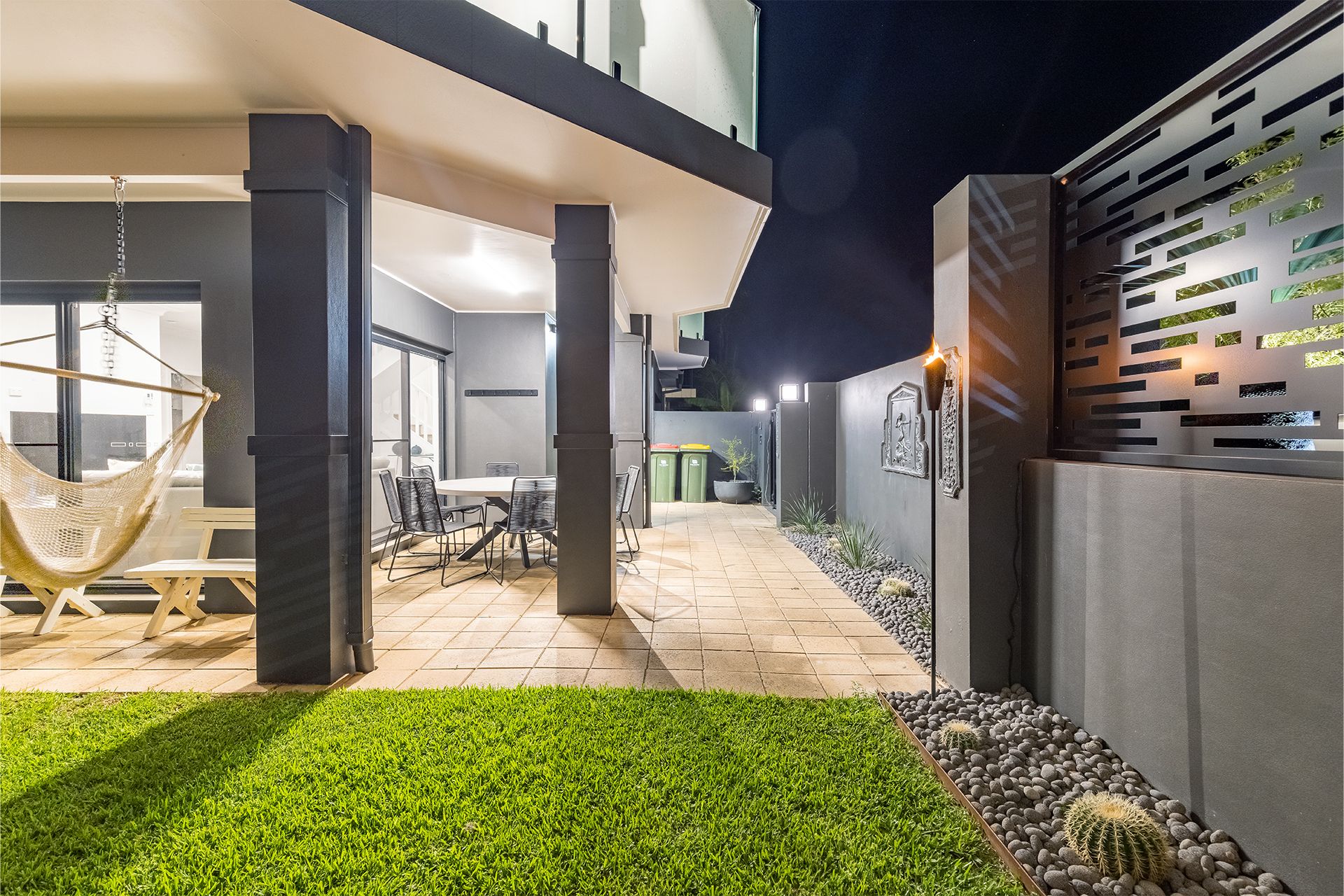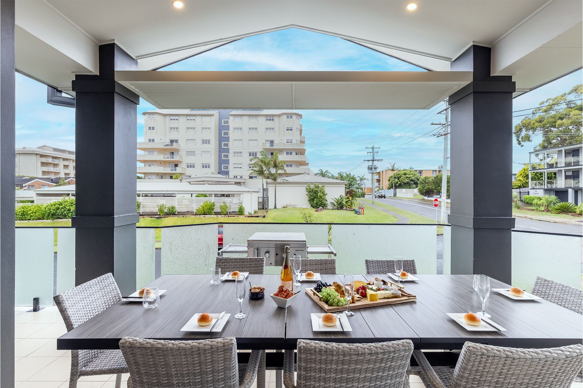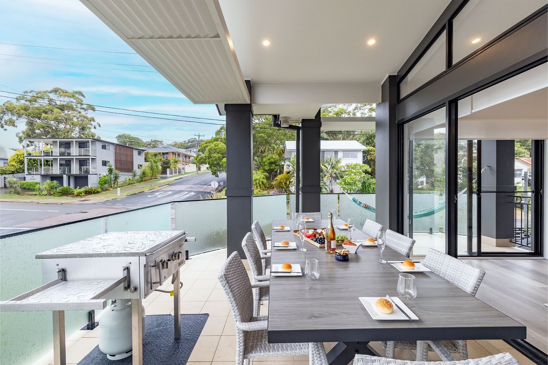 Beach Haven is tastefully furnished and spread over two levels with a lift for easier access to the upper level. The luscious palm greenery surrounds the property giving this beachy, relaxing vibe to all those who visit. Take in the outdoor areas with a table and chairs on the downstairs patio to seat 8, or upstairs on the balcony with another alfresco dining table and chairs for 8 people and gas teppanyaki plate BBQ overlooking the gorgeous lights throughout the garden. The manicured lawns wrap around the property and provide an outdoor shower and clothesline around the back.