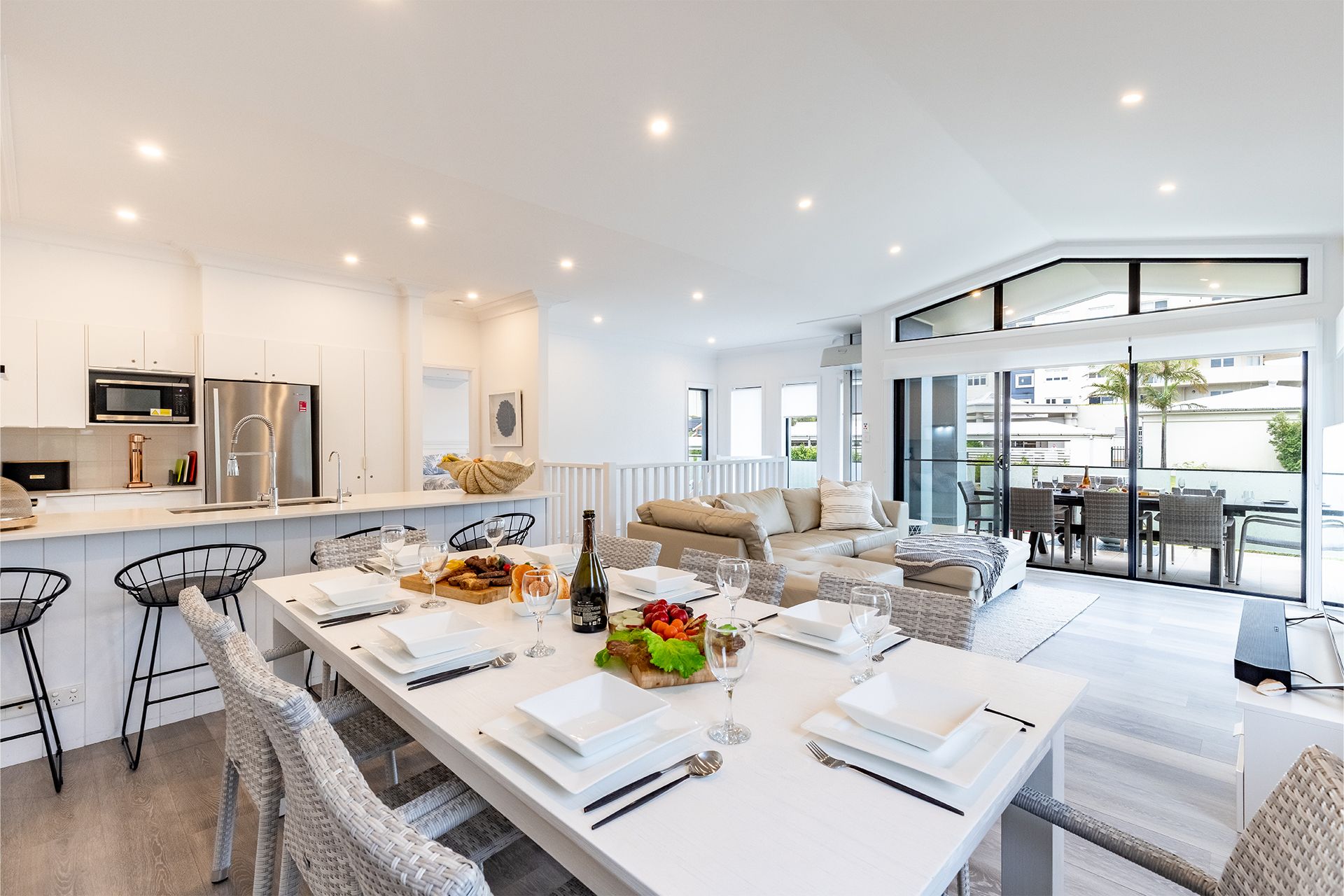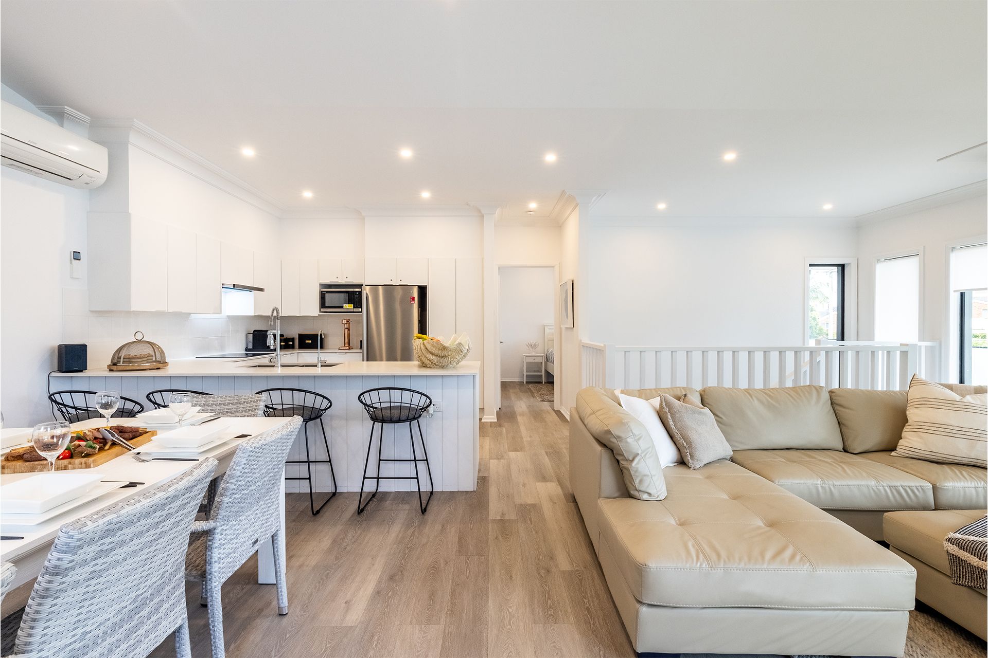 Travelling upstairs either by the staircase or lift will lead you to the open plan living/ dining area, fully equipped kitchen with complete cooking facilities including under bench oven, induction cooktop, microwave, dishwasher, DeLonghi Nespresso coffee pod machine (bring your own L'OR pods for some delicious coffee in the morning), family size fridge/freezer and plenty of bench space to prepare meals.