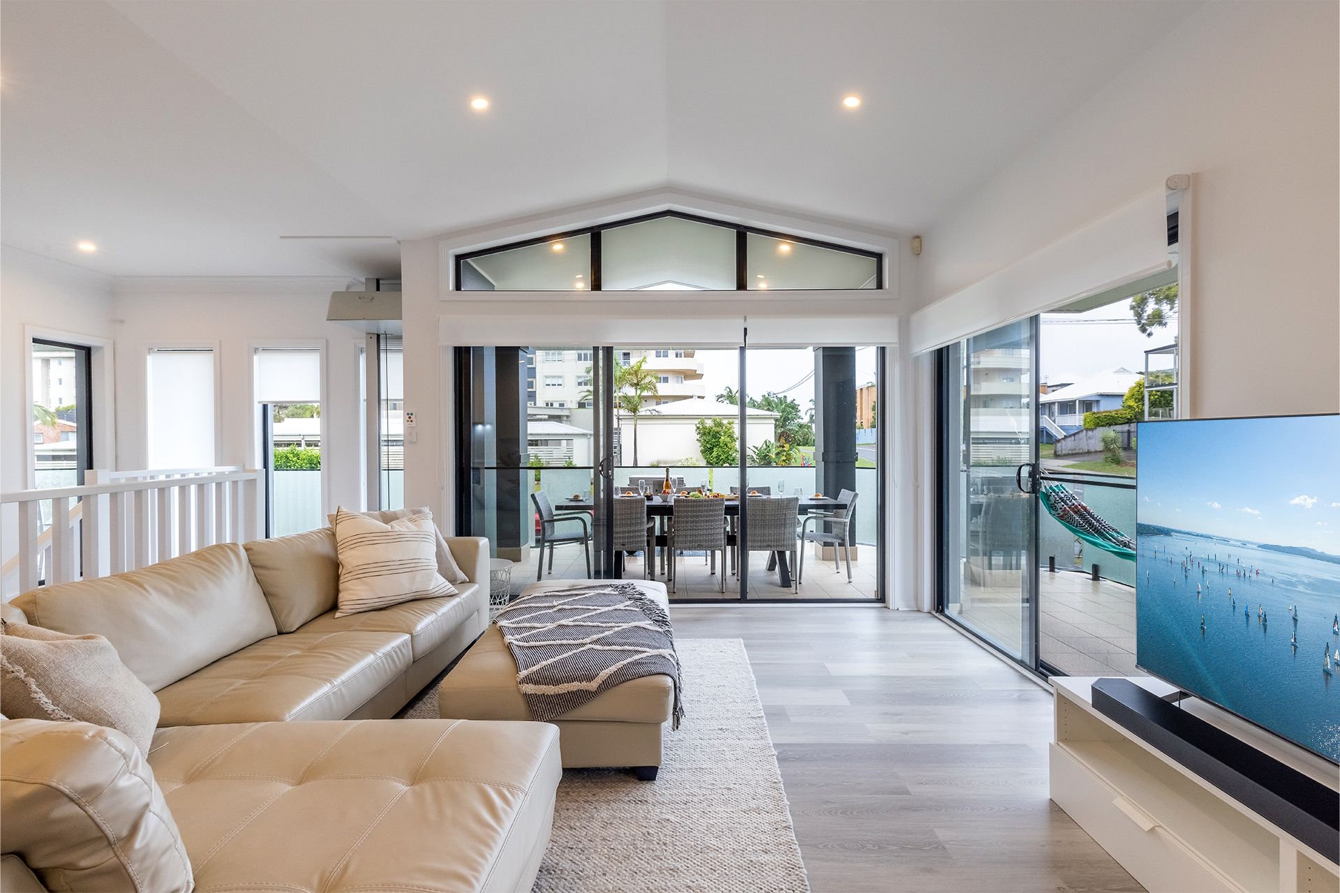 Once you've taken in the sun, head upstairs to the open plan living/ dining room accompanied by a large Smart TV, free Wi-Fi, split system air conditioning and soundbar. Downstairs has the second living area with a ceiling fan, Smart TV, PS4 station and sofa bed. There are two bedrooms both with ceiling fans, main bathroom with a bath, shower, toilet, and vanity provided and laundry equipped with a front loader washing machine and dryer.