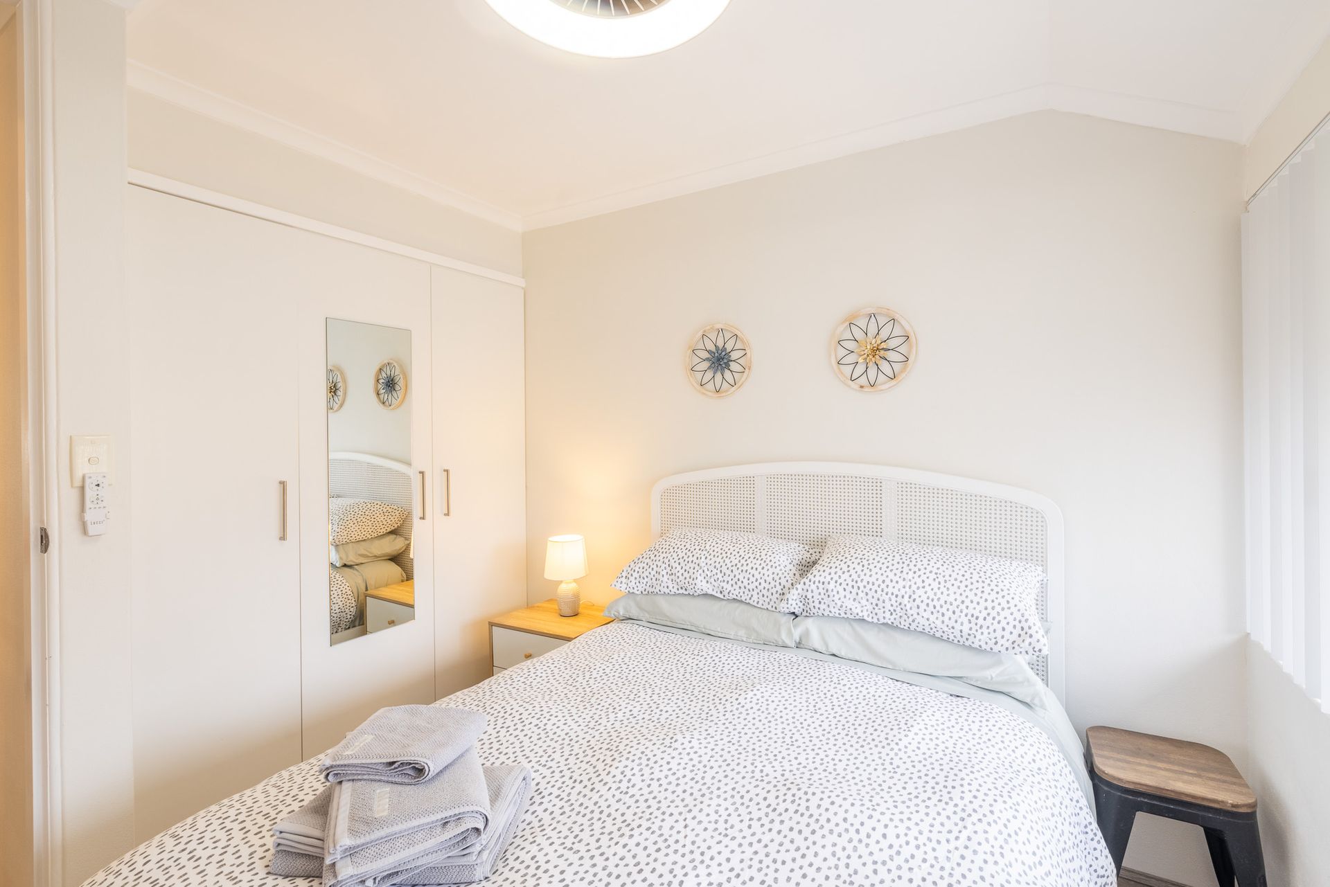 Bedroom 1 (upstairs) – Queen Bed + Ceiling Fan + Linen + Bed Making