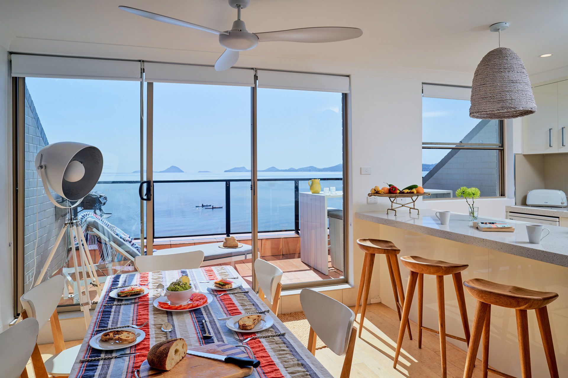 Located on the second floor, this waterfront apartment captures refreshing sea breezes and offers uninterrupted, elevated views across the water to the iconic twin headlands of Tomaree and Yacaaba.