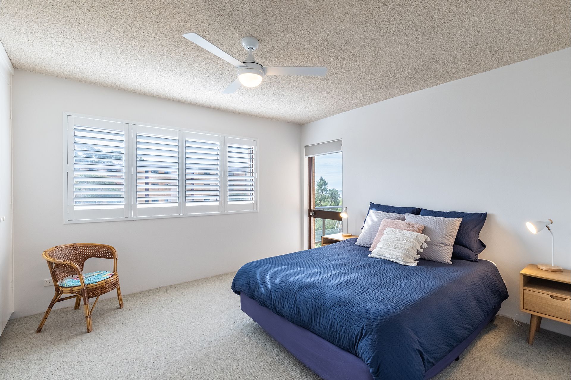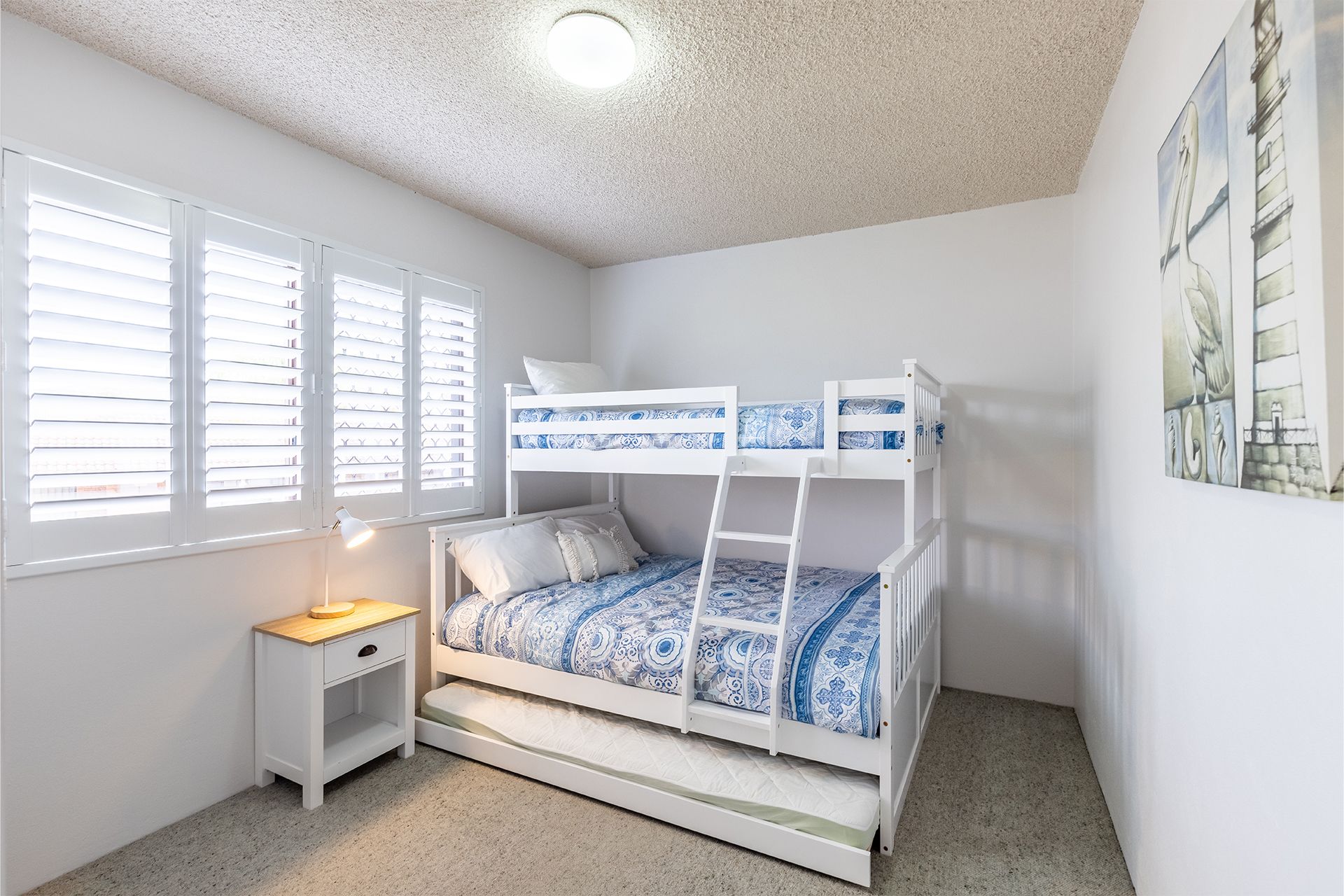 Two bedrooms with the main bedroom having a Queen-size bed, built-in robe, ceiling fan, water views, and access to the main balcony to allow the beautiful sea breeze to flow through, whilst the second bedroom has a timber tri-bunk (double underneath/ single above) and built in trundle.