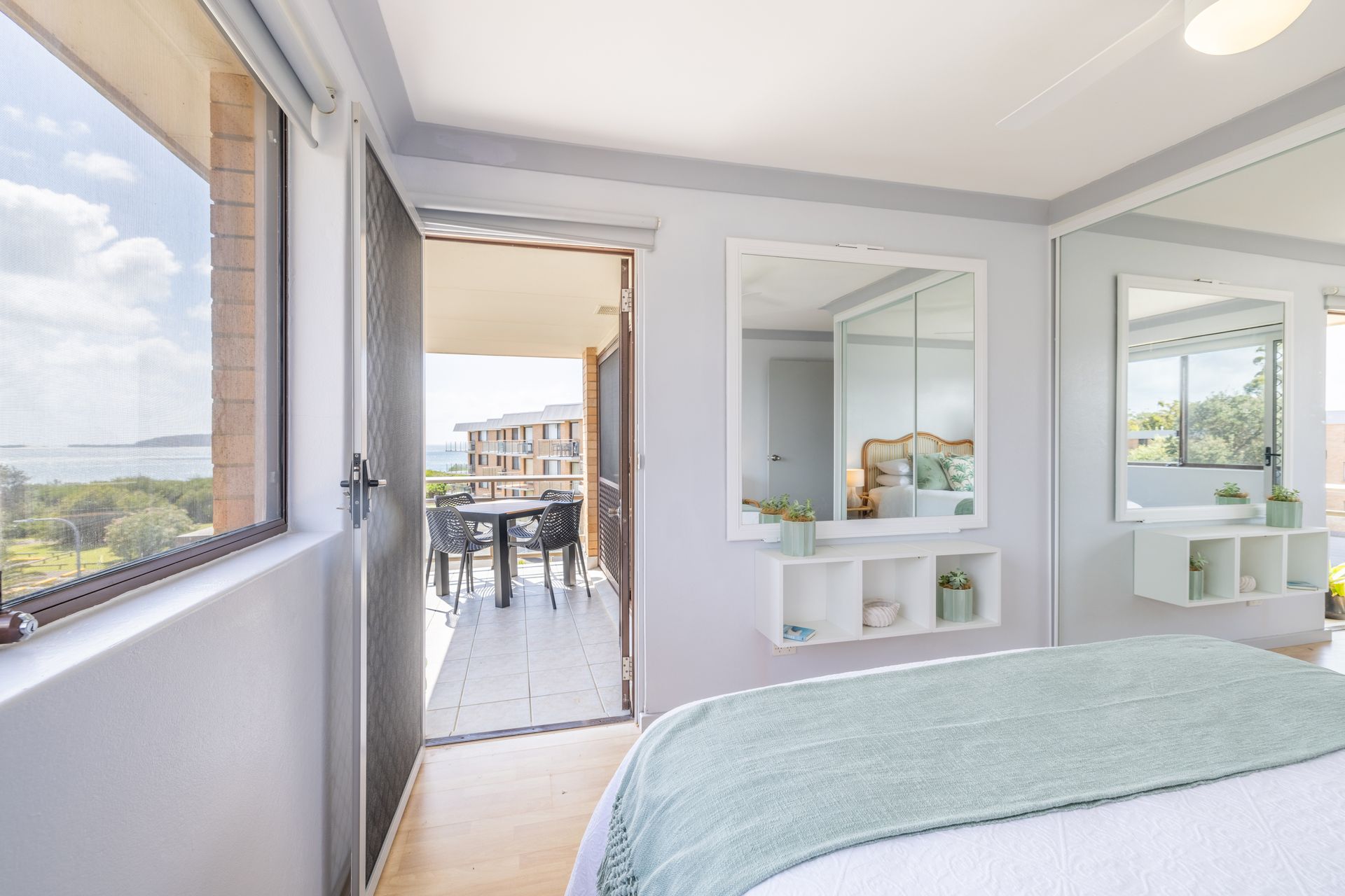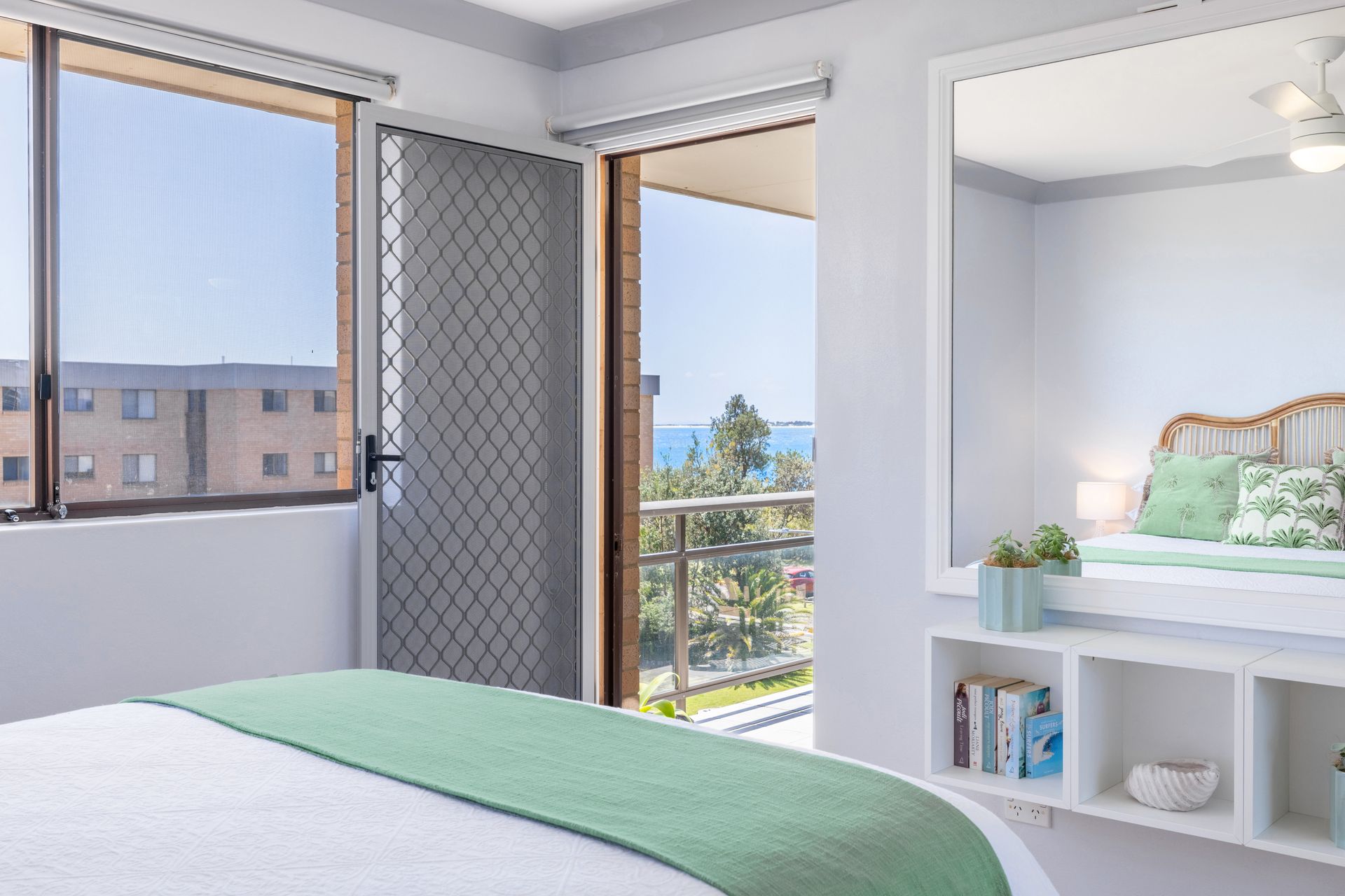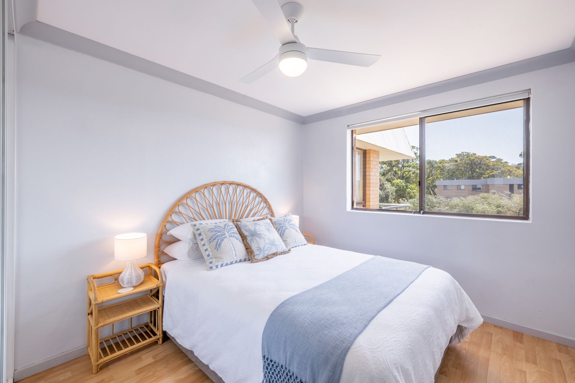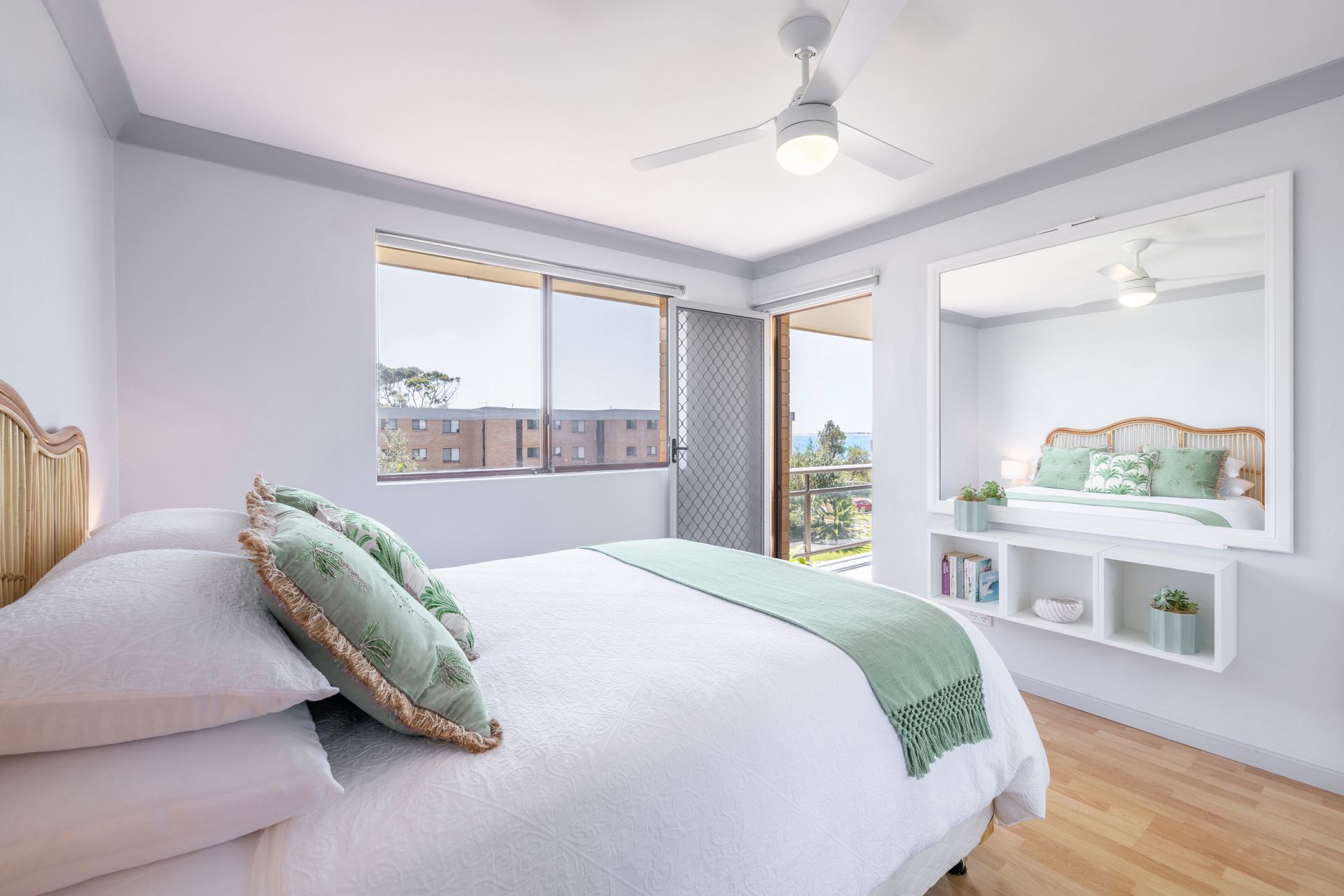 Bedroom 1 – Queen Bed + Ceiling Fan + Balcony Access