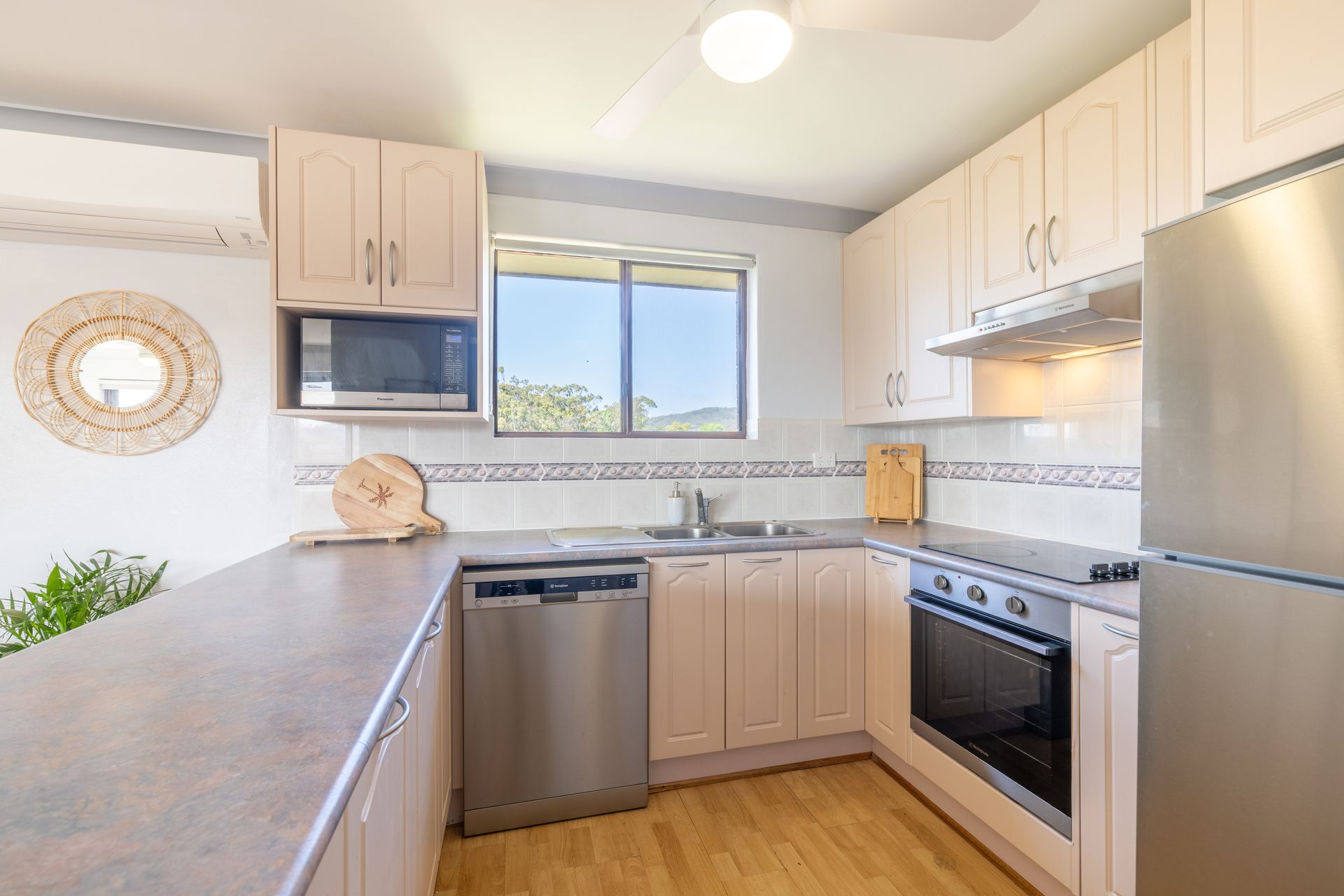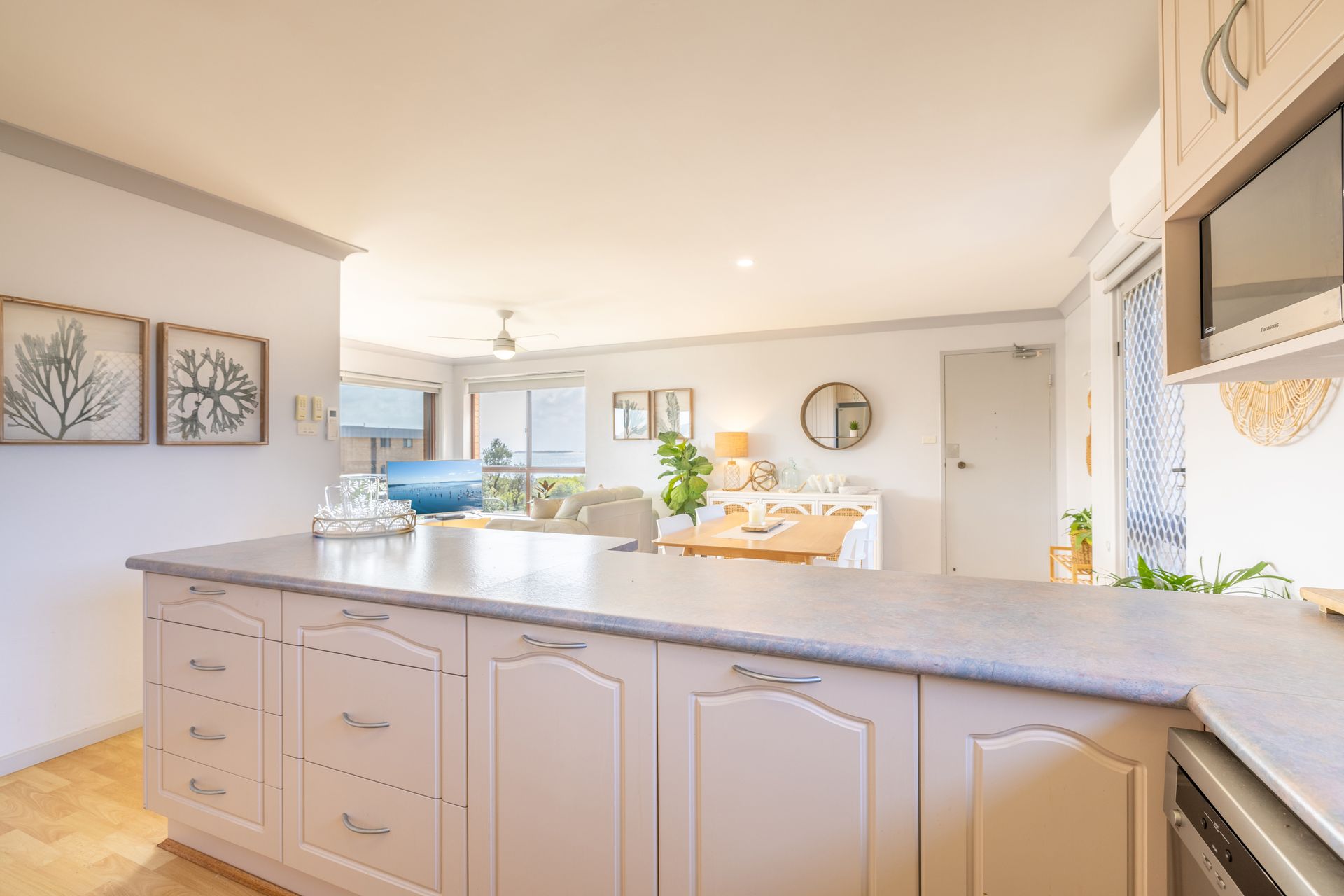 Immerse in the comfort of two elegant bedrooms, complete with ceiling fans for those balmy nights. The main living area, with its big screen smart TV, split system air conditioning, and plush seating, is perfect for a cosy movie night in. If you're a food lover, you'll appreciate the fully equipped kitchen, complete with a dishwasher, microwave oven, and Nespresso coffee machine.