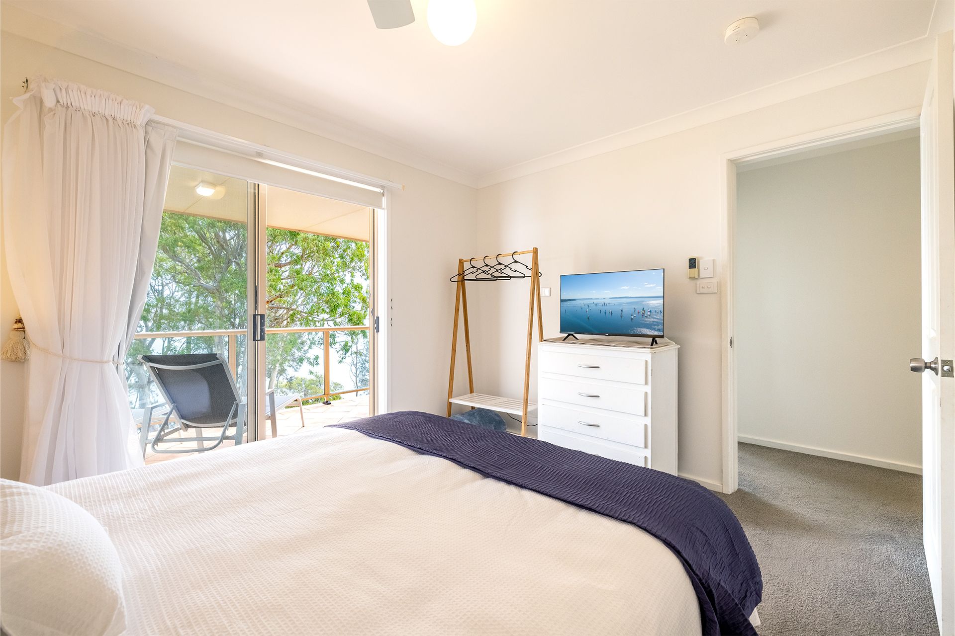 Bedroom 4 (upstairs) – Queen Bed + Split System Air Conditioner + Ceiling Fan + Smart TV + Balcony Access