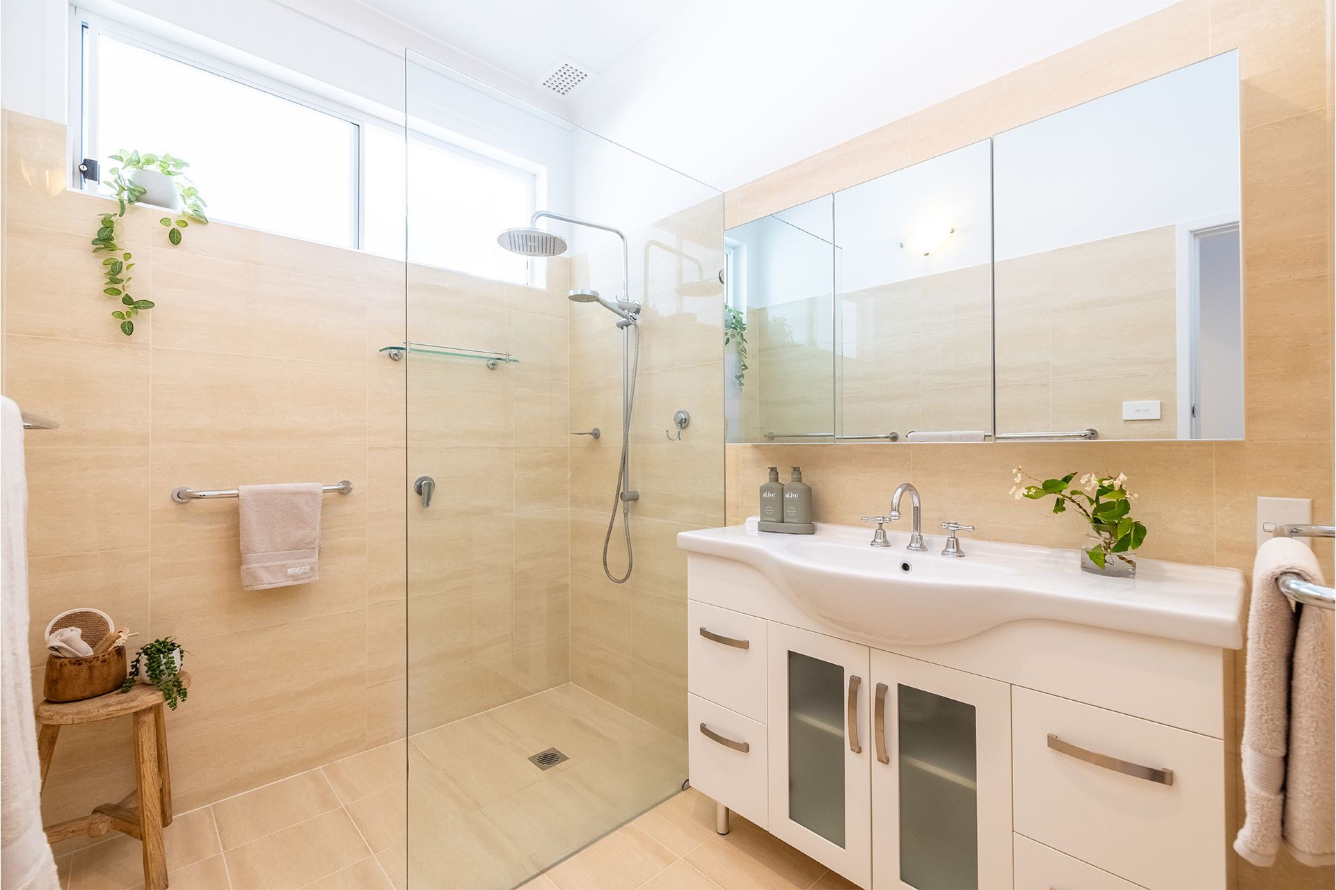 A centrally placed, well-lit bathroom is equipped to provide convenience for every guest, beautifully fitted with modern amenities including a walk-in shower with rainwater showerhead that invites soothing, lingering showers or quick freshen-ups with equal ease.