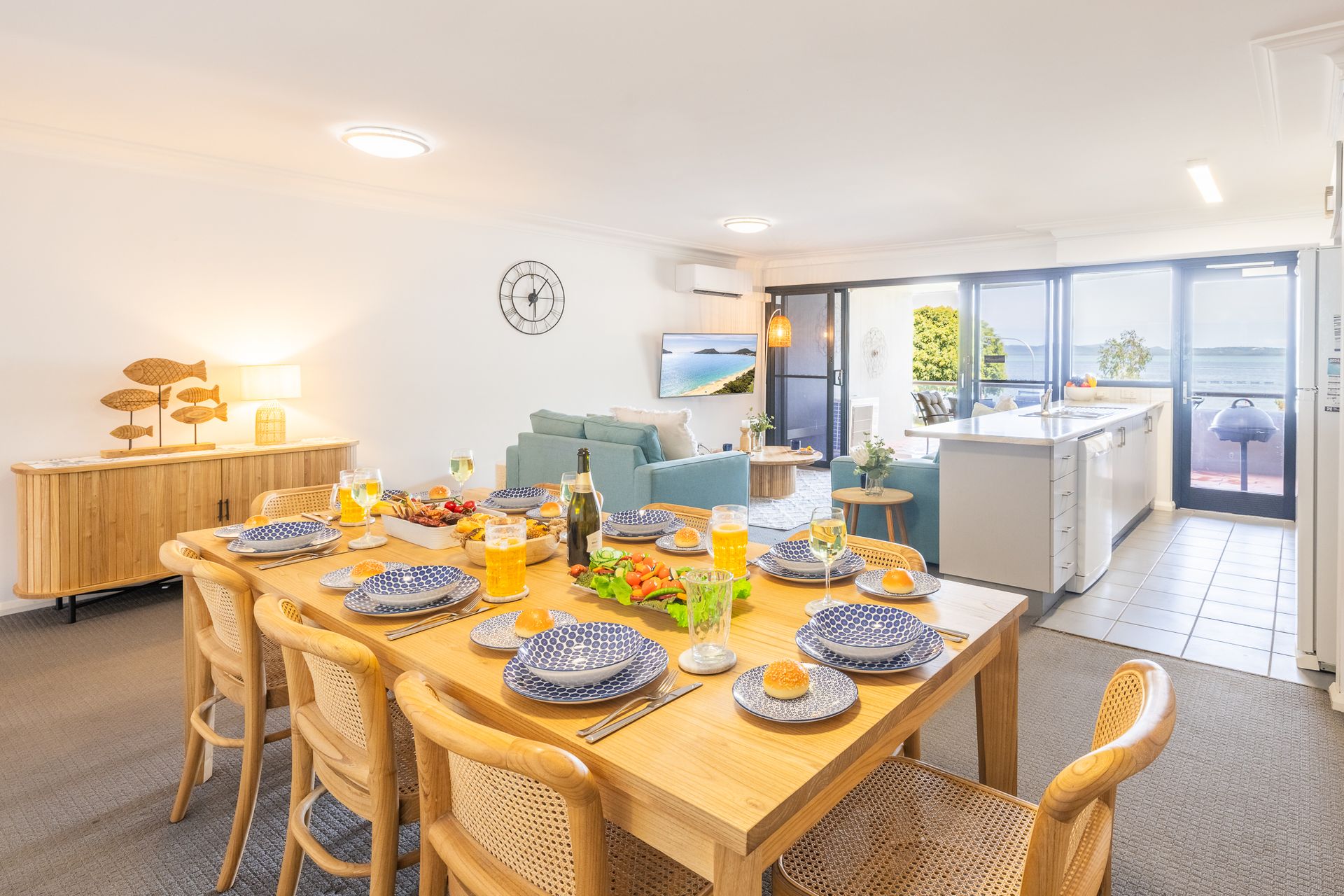 The property also houses a communal pool for your refreshment and a large deck area to melt your worries away. Across the road, Little Beach Reserve provides free BBQ and picnic table facilities, public toilets, and a boat ramp. You might even see a dolphin swim past!