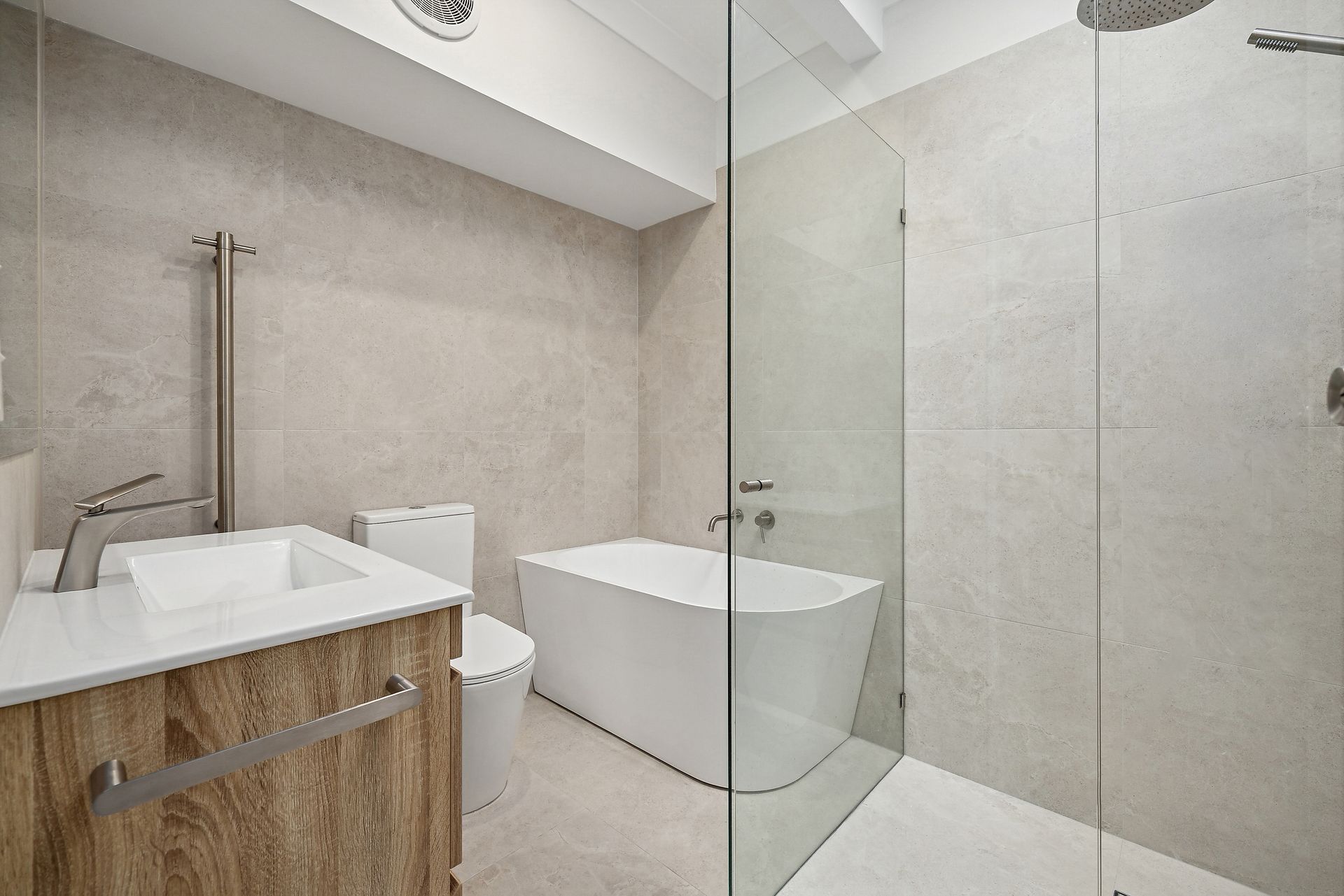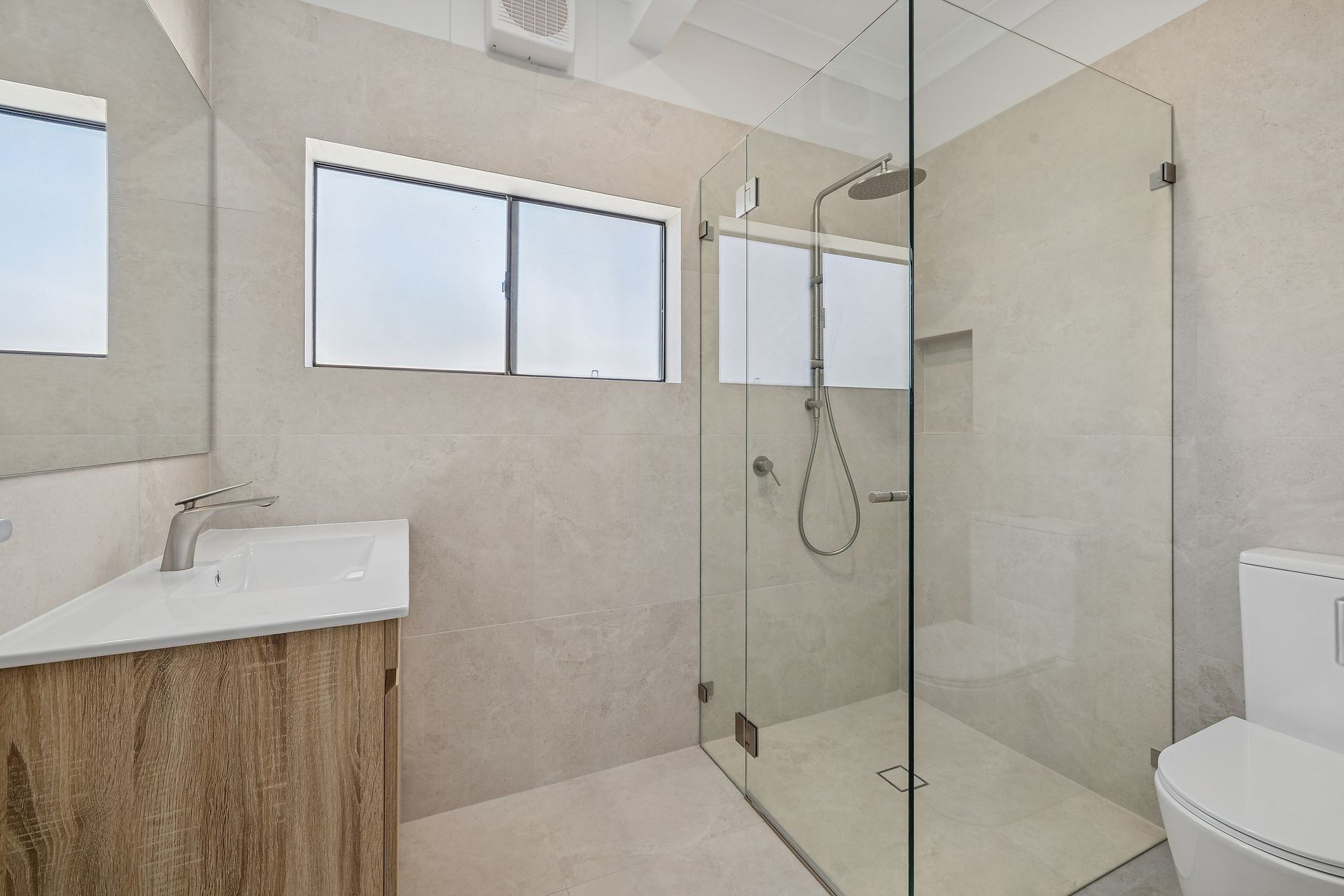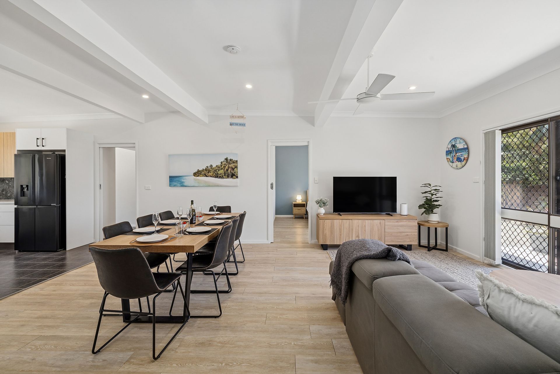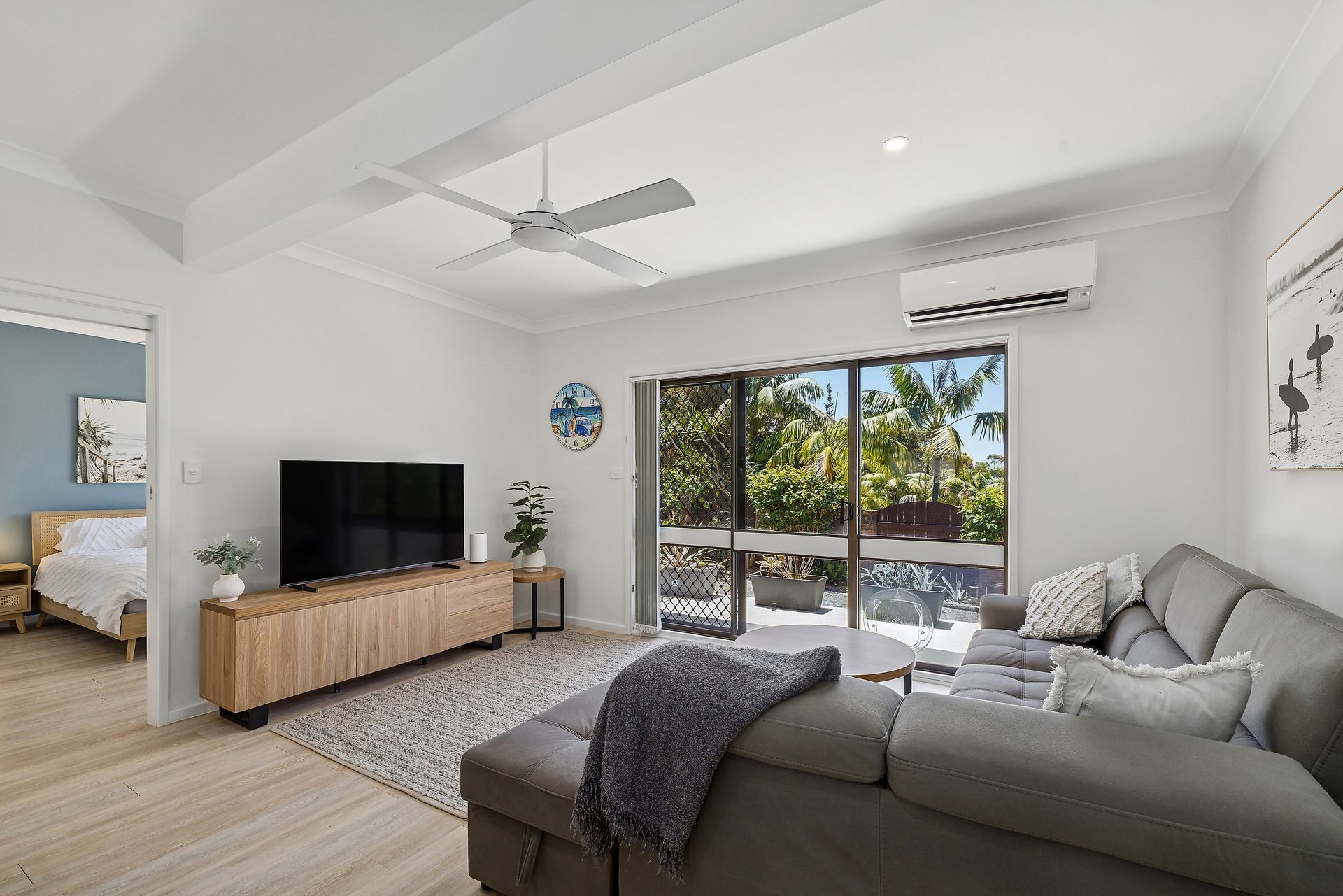 Bedroom 2 - Queen Bed + Ceiling Fan + smart TV + Walk through Robe into bathroom shared with bedroom 3.