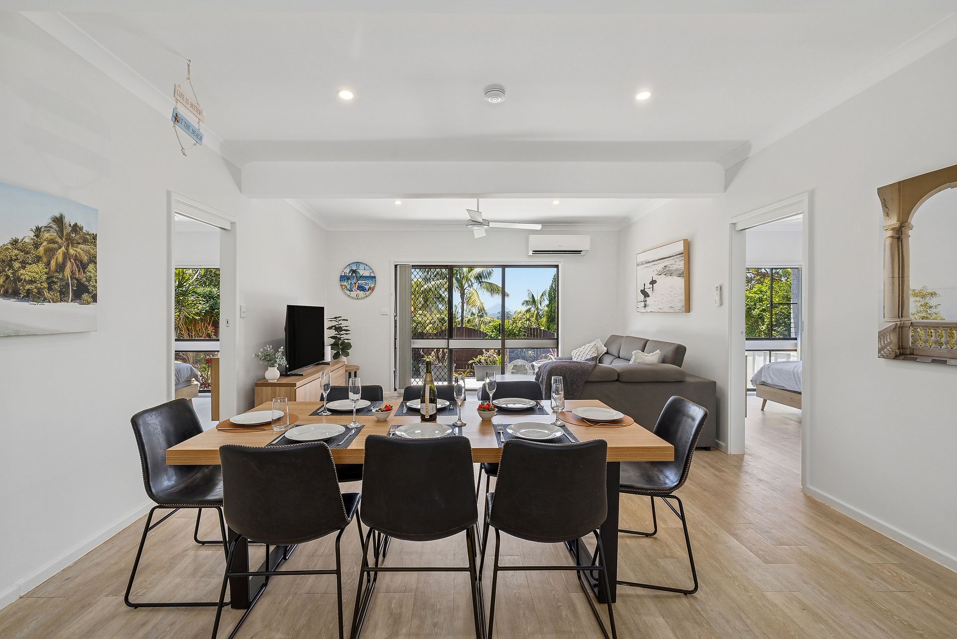 Bedroom 1 has a Queen Bed, split system Air Conditioner, Ceiling Fan and a bathroom which is accessed via the hallway. The main bathroom has a bath, shower, toilet and vanity and is also accessible for all guests. Bedroom 2 also has a Queen Bed, ceiling fan, smart TV and a hallway that runs between this bedroom and bedroom 3 providing access to the bathroom, this bathroom has a shower, toilet and vanity. Bedroom 3 provides a trio bunk with a double bed below and single bed above, plus a roll out trundle bed.