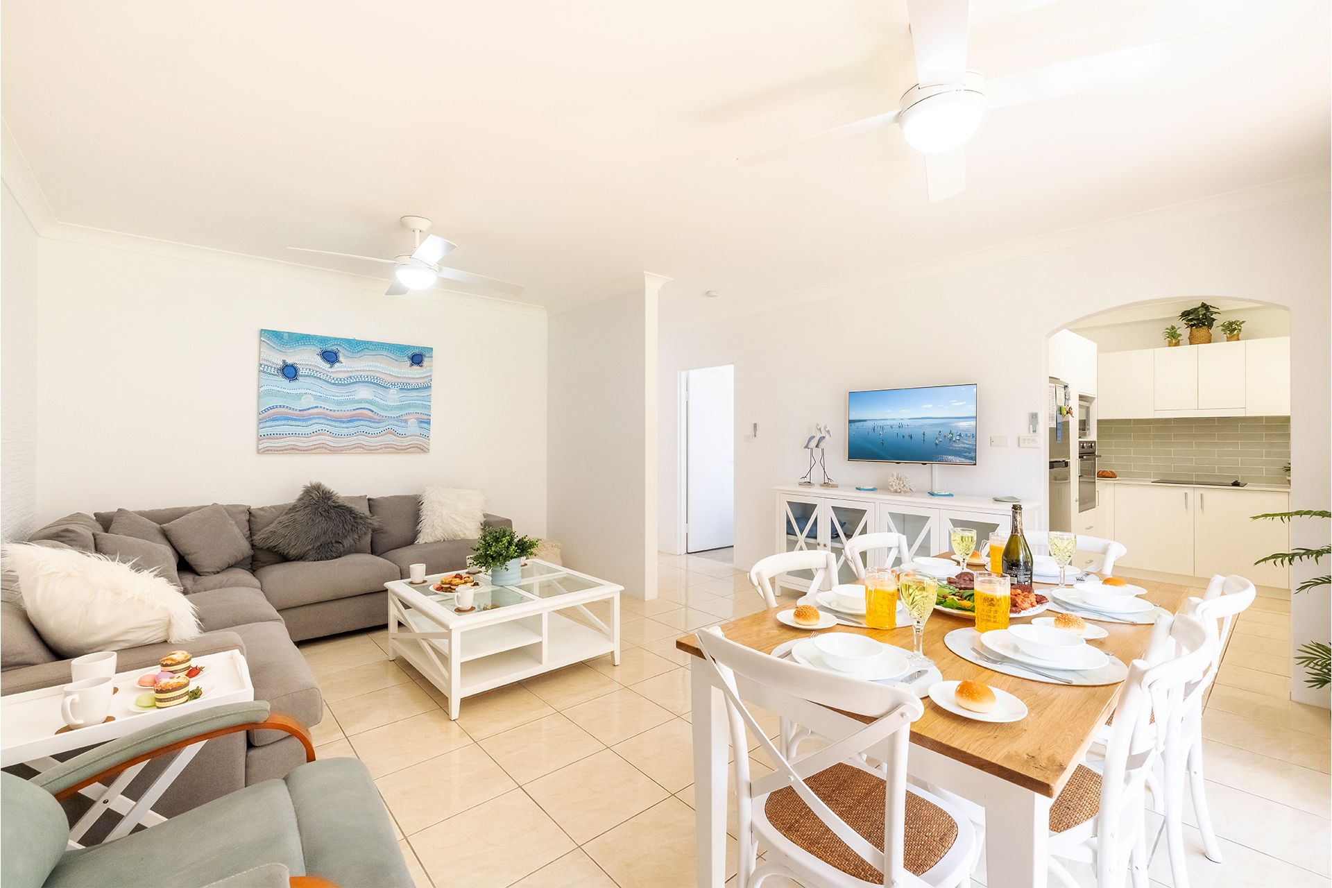 Located on the ground floor, the open plan living has a stunning fresh, relaxed feel with a split system air conditioning and ceiling fans to give you all the comforts you need. There is a large corner lounge, wall mounted Smart TV with unlimited Wi-Fi, books and games provided and dining for six people on the stylish dining suite. Leading off from the living area is the balcony with outdoor chairs and a Weber gas BBQ, a great spot to finish the day off and take in the peaceful surrounds whilst listening to the waves roll in and local birdlife.