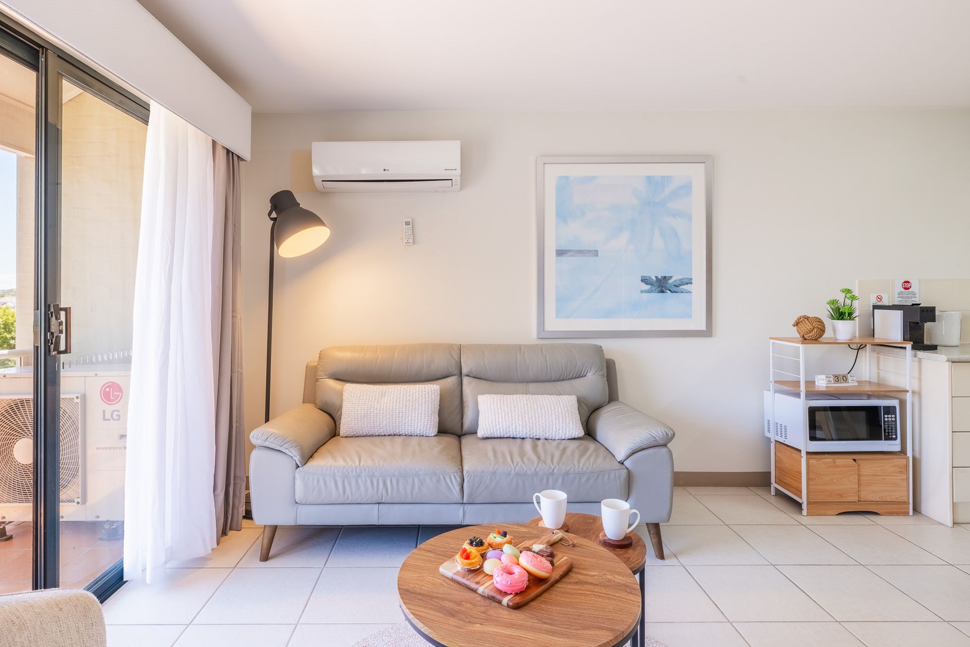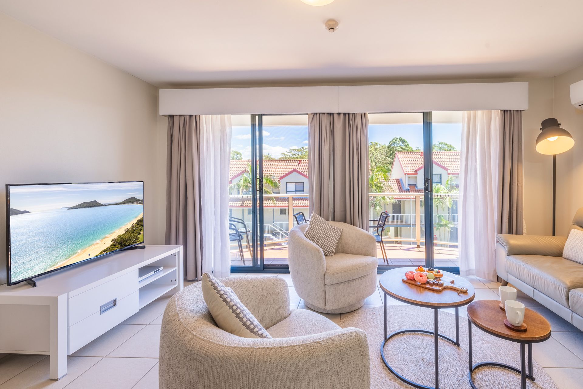 The apartment’s kitchenette has convenient appliances including a microwave oven, K-Fee coffee pod machine, family size fridge/ freezer, two electric hot plates, kettle and toaster – please note there is no oven. For those preferring to dine out, there is a fantastic restaurant onsite, Nostimo At The Bay or a quick 3-minute drive into the heart of Nelson Bay where you will find an array of restaurants and entertainment.