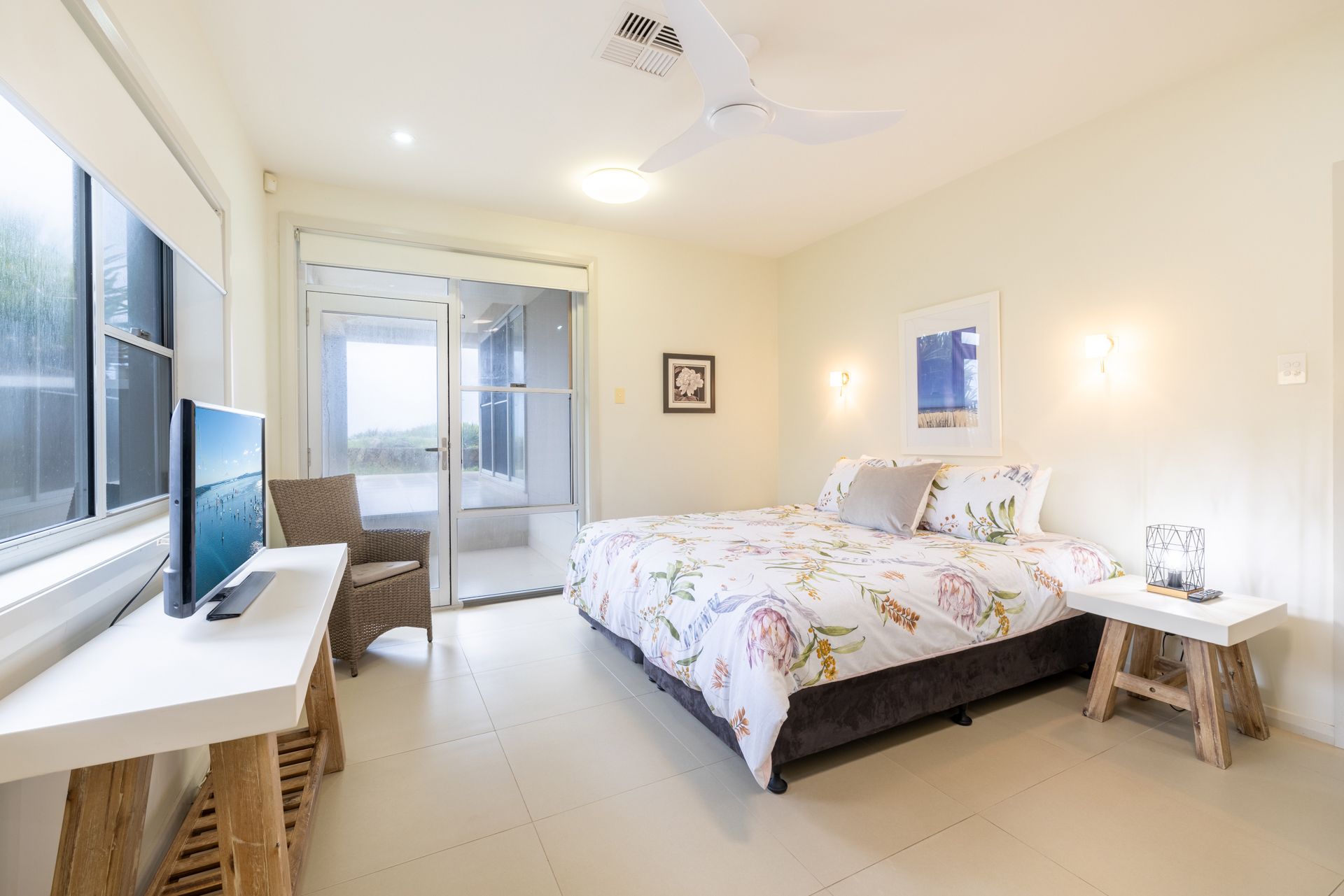 Bedroom 1 – King Bed + Ducted Air Conditioning + Ceiling Fan + TV + Ensuite + Patio Access