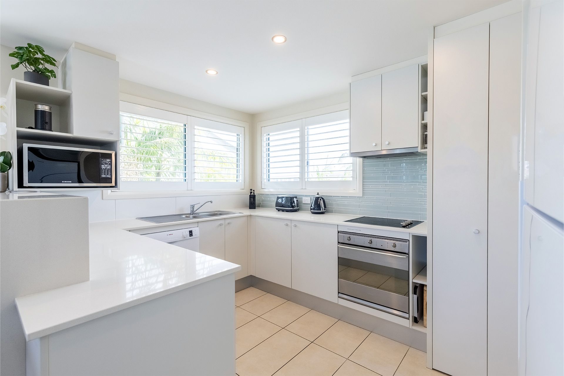 The modern kitchen is fully equipped with complete cooking appliances, microwave, dishwasher, and a Nespresso coffee machine with milk frother (BYO pods).