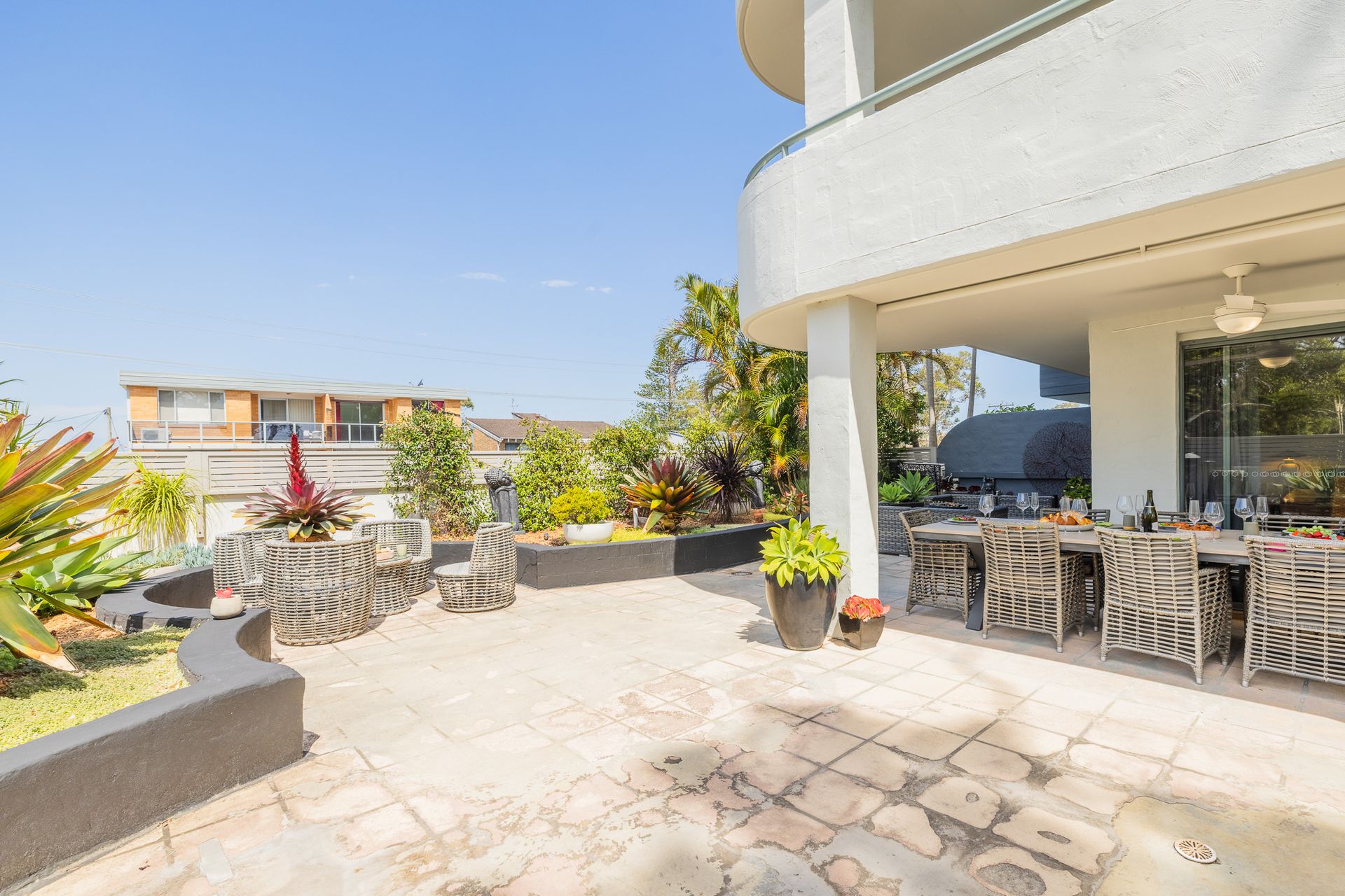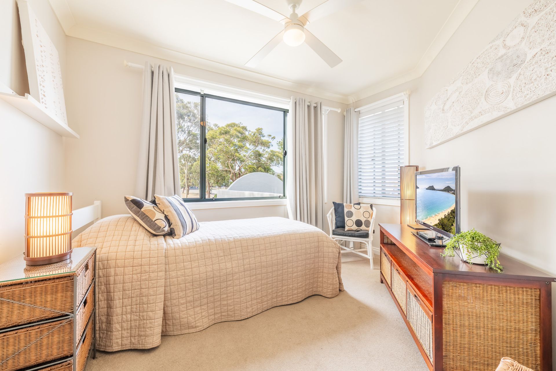 This beautifully furnished Soldiers Point holiday unit has a spacious open plan air conditioned living area with a fully equipped kitchen with dishwasher. The living area opens out to a huge sun drenched terrace with outdoor dining and lounge furniture and BBQ, a fantastic place for alfresco dining while enjoying the views across the park and Sunset Boulevard water views.