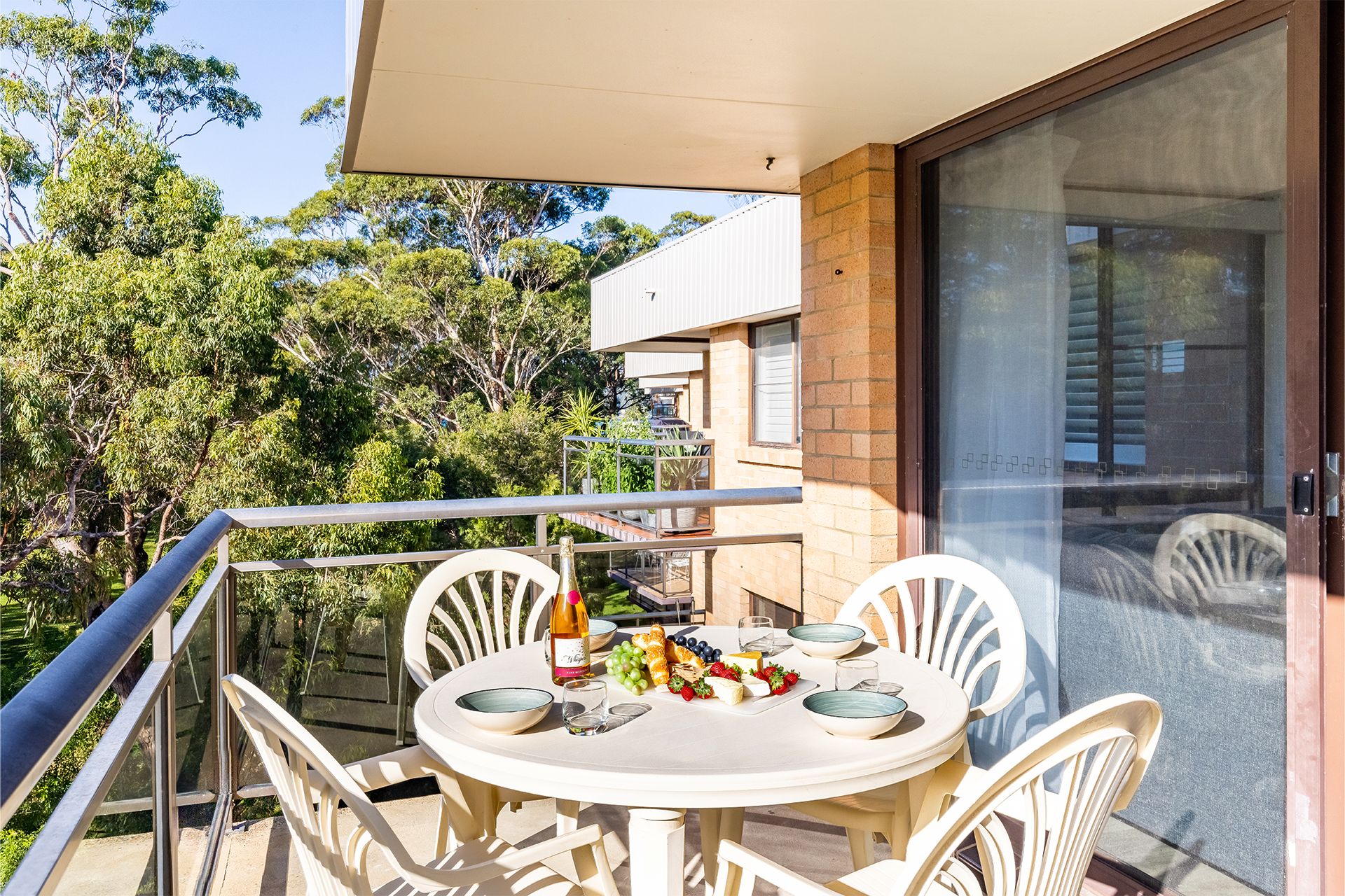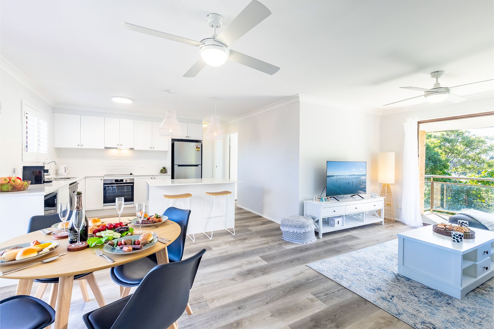 Unit 5 Shoreline has recently been renovated with stylish Hybrid flooring throughout and comfortable furnishings. The bonus of a top floor unit with water views looking through to Little Beach and filtered water views through the treetops to Shoal Bay beach from the front balcony.