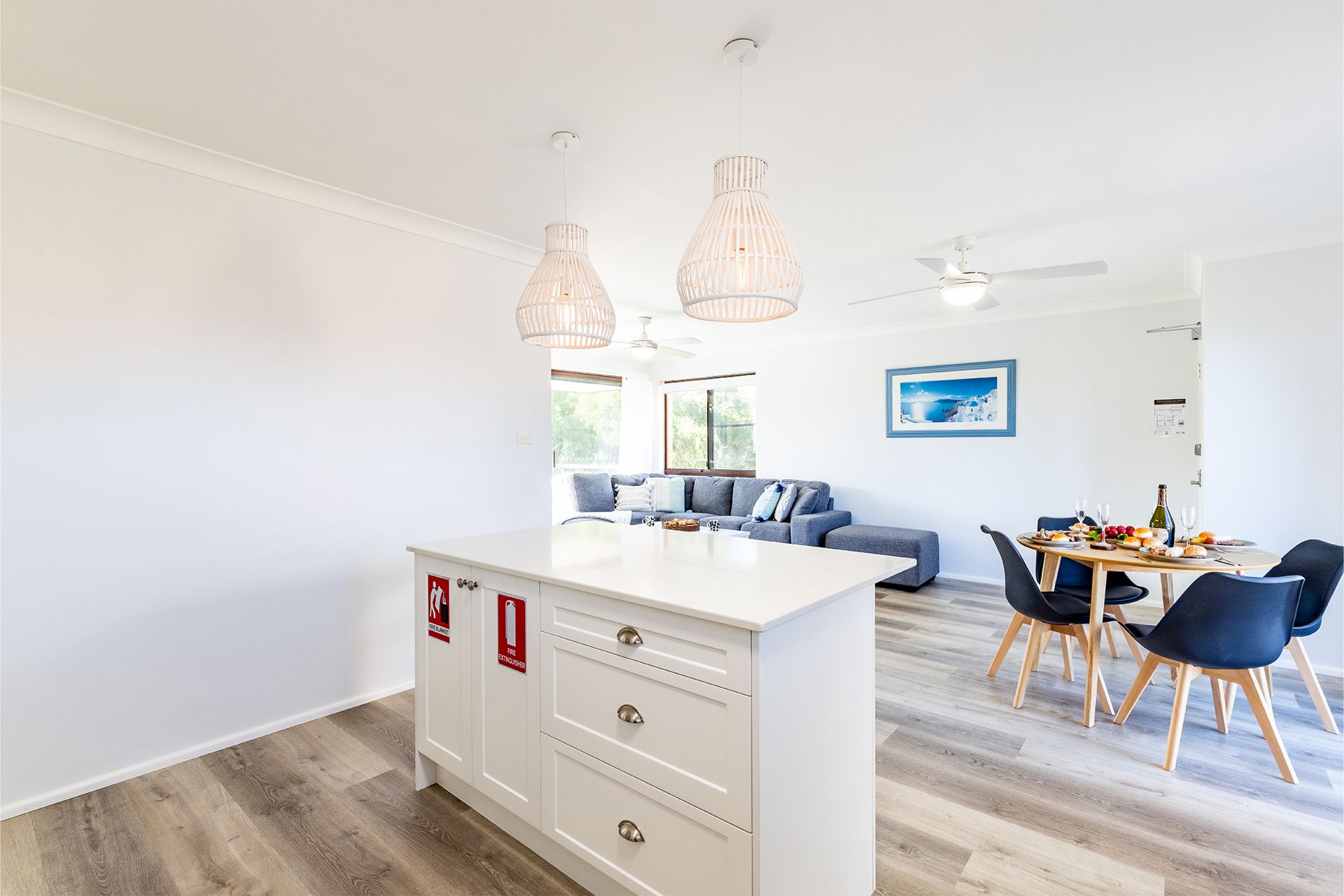 As soon as you enter the open plan living area, you will notice the space and luxury, the living area features a relaxing lounge suit, free unlimited Wi-Fi, large Smart TV, and ceiling fans to push the natural sea breeze through the unit via the front and back balconies. The front balcony opens out from the living area and has superb water views looking down too Little Beach and caters for alfresco dining.