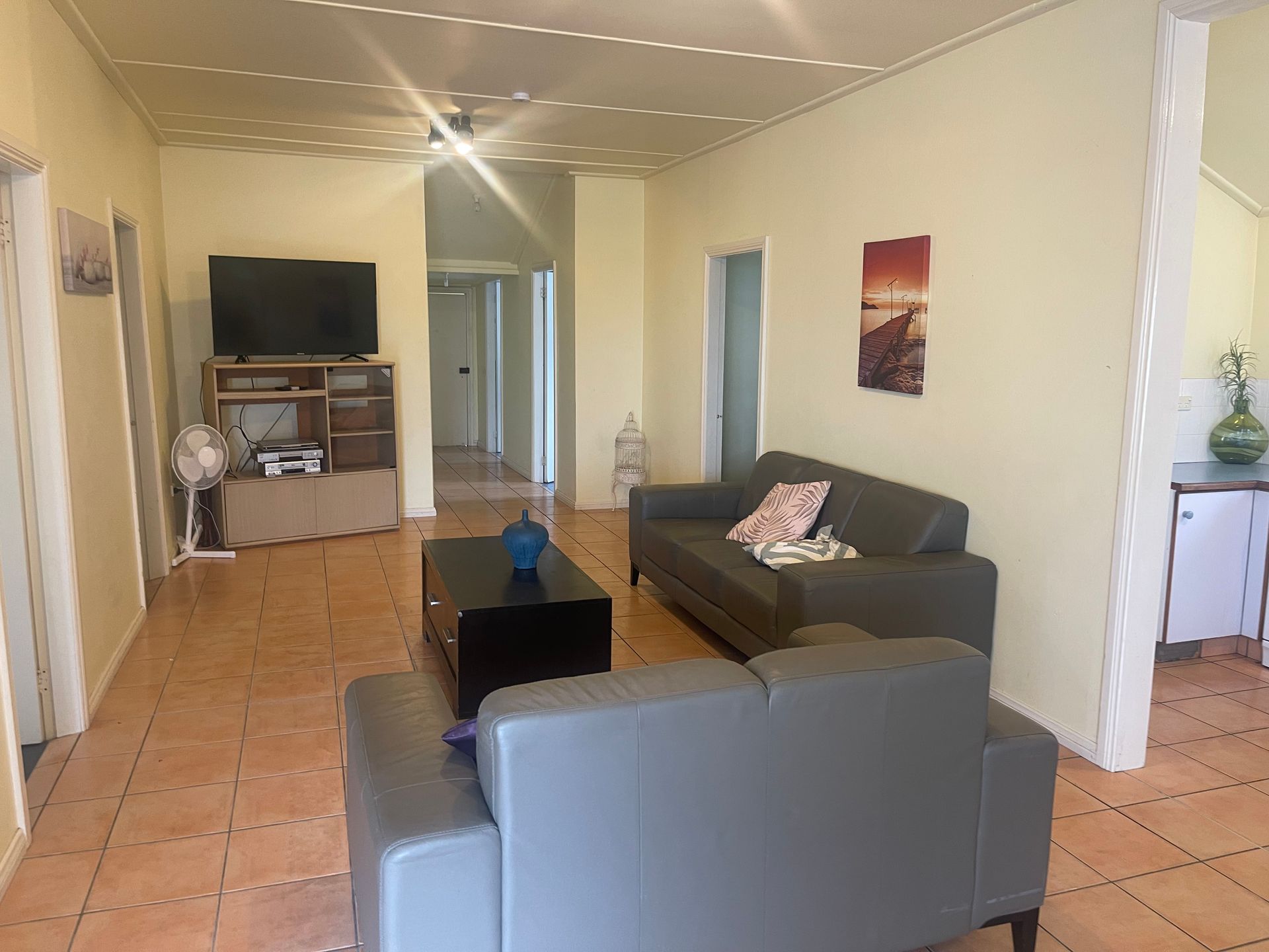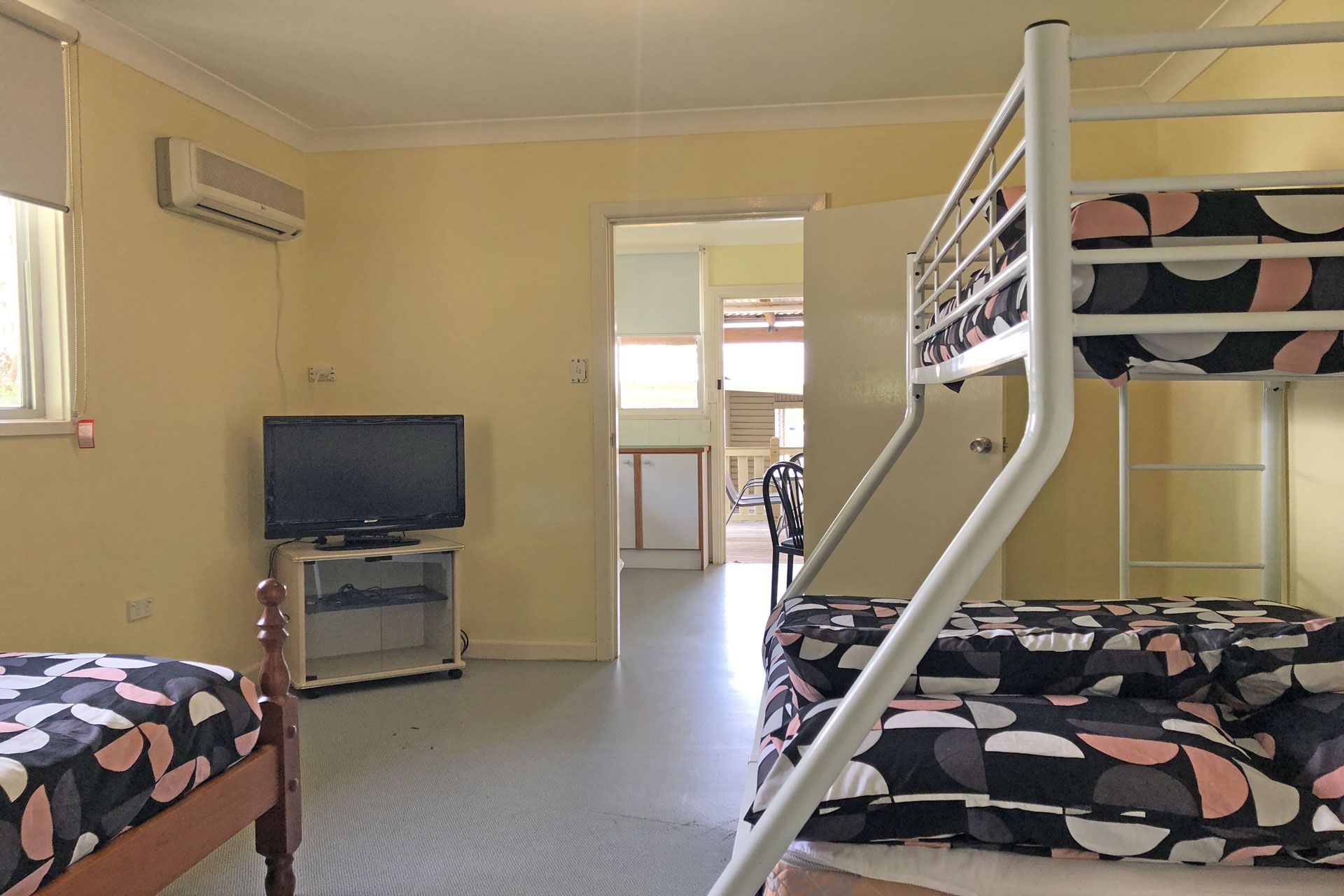 The air-conditioned (cooling facilities only) granny flat which is perfect for older teenagers or the extended family. It is fully self-contained and located at the rear of the property, it provides a kitchenette with a small fridge, microwave, bench-top mini oven with two hot plates plus dining for 4 guests. The open plan bedroom is equipped with a tri-bunk (double underneath/ single above), one single bed and a TV. The bathroom has a step-in shower, vanity and toilet.