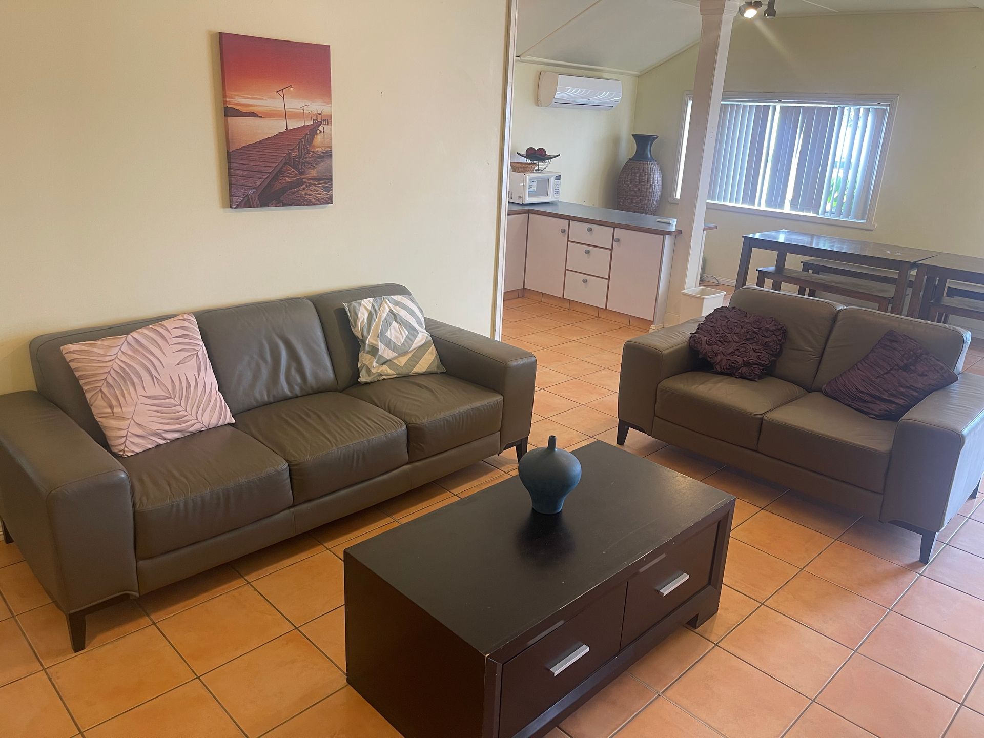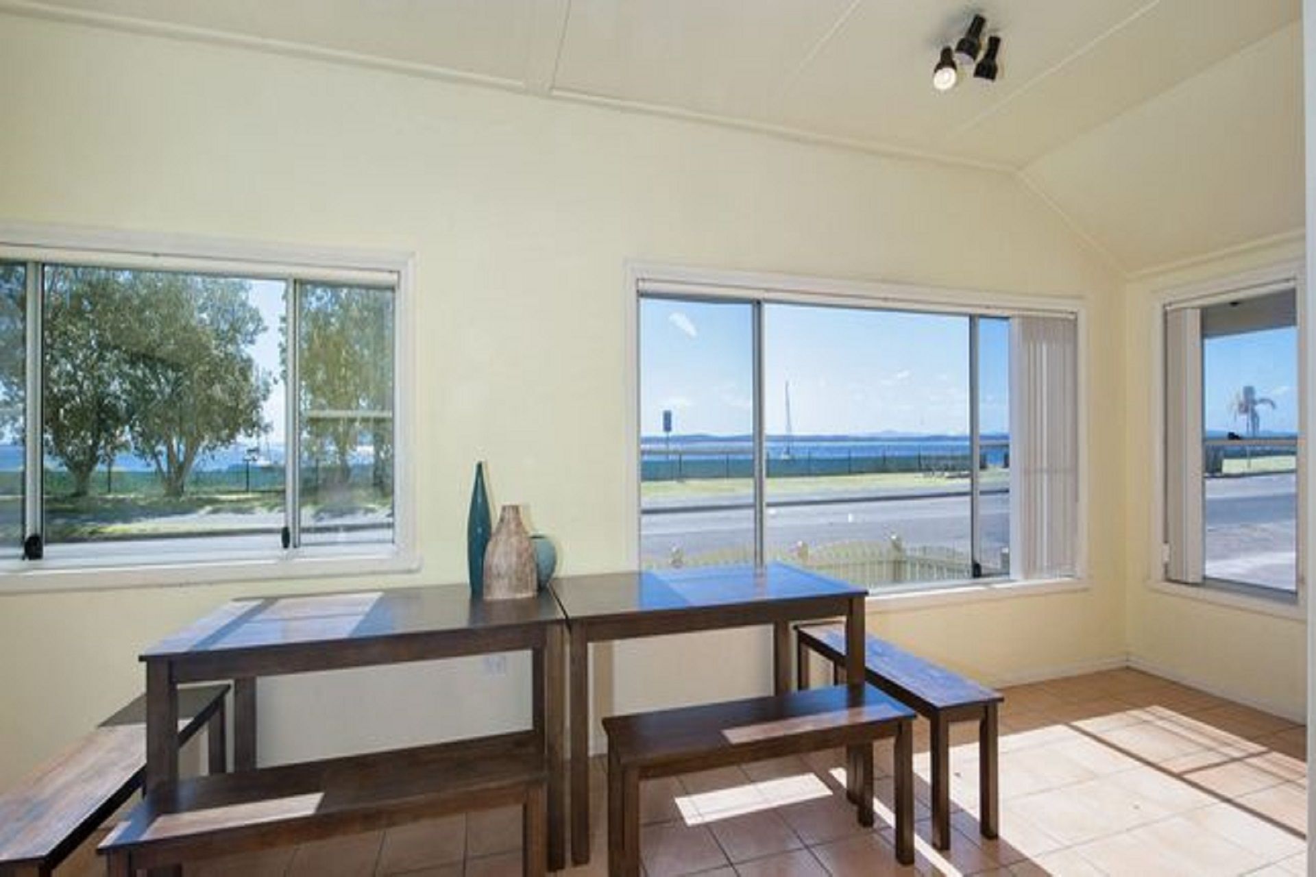 An open plan living / dining area is fitted with a split system air conditioner to keep you cool in the summer while our capable heating system guarantees warmth on cooler days. An expansive lounge area, equipped with a TV and a DVD player, provides ample entertainment options for night-time relaxation and sensational water views.