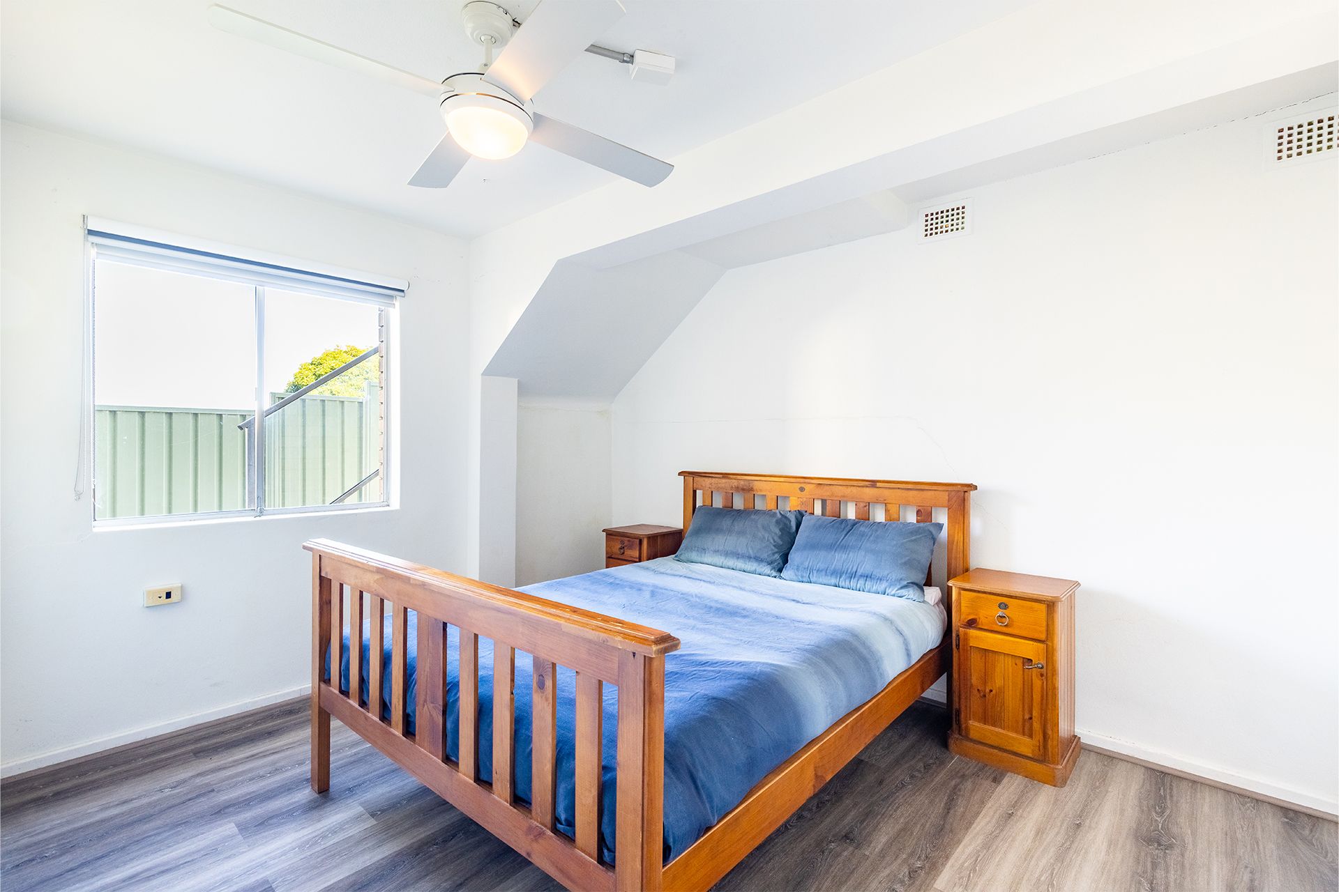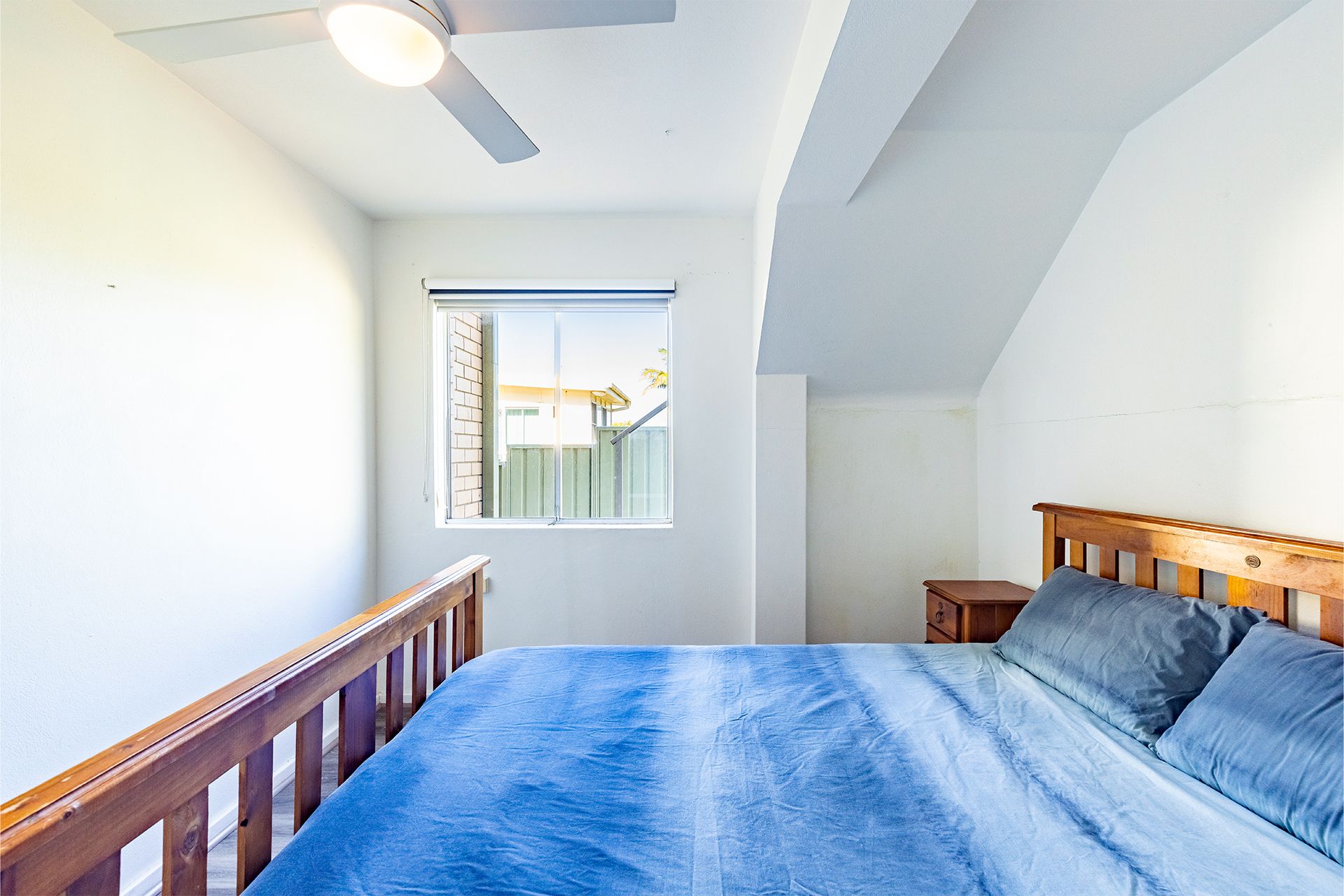 Bedroom 1 – Queen Bed + Ceiling Fan