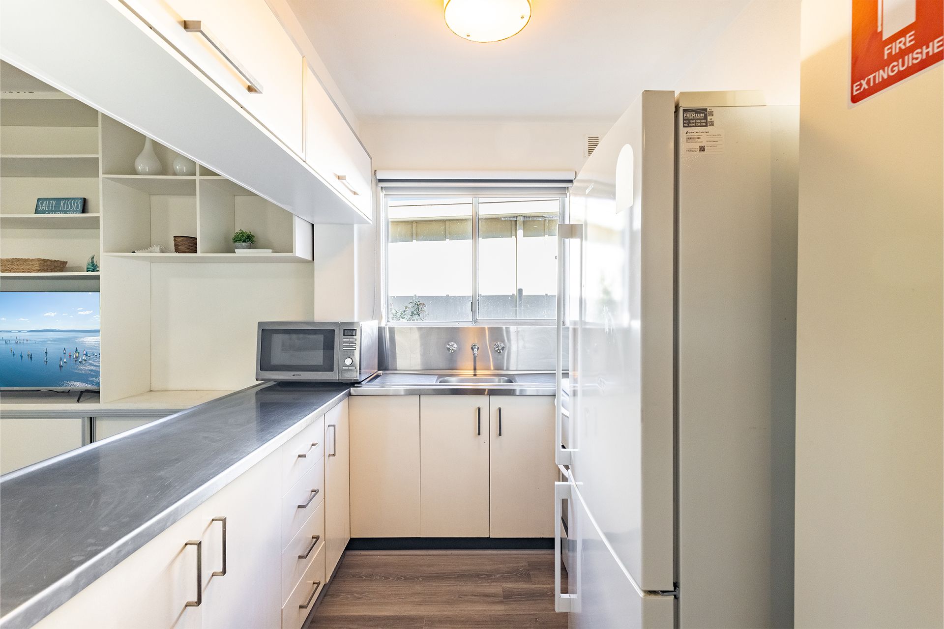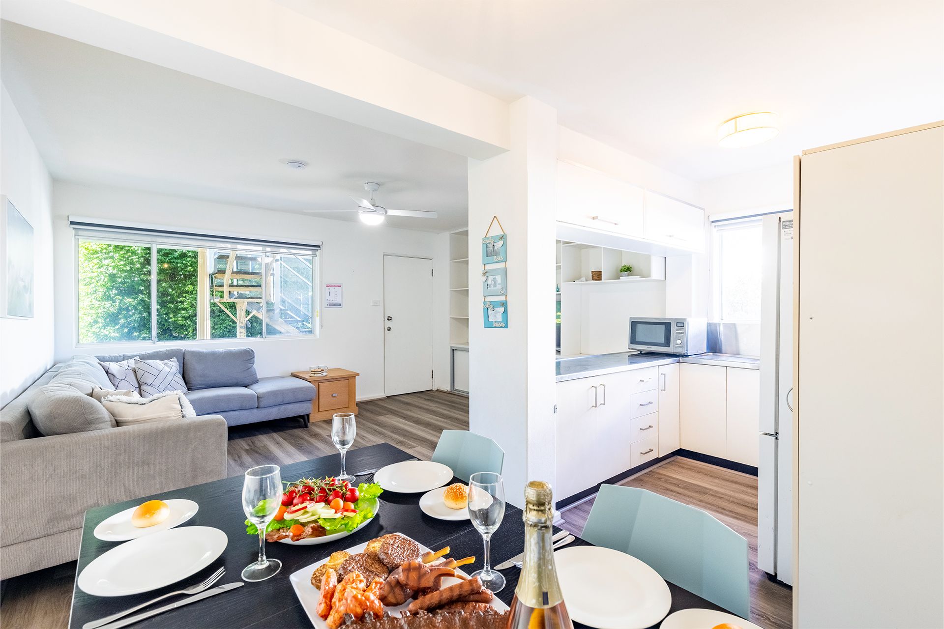 The unit features an open plan living/ dining area with a ceiling fan, Smart TV, and free unlimited Wi-Fi. There is also a fully equipped kitchen with complete cooking facilities including a free standing upright electric oven, microwave, and family size fridge/ freezer. The property provides two bedrooms with the main having a Queen bed and ceiling fan (please note there is no robe in this room), the second bedroom has a built-in robe and a tri-bunk with a double bed underneath/ single above.