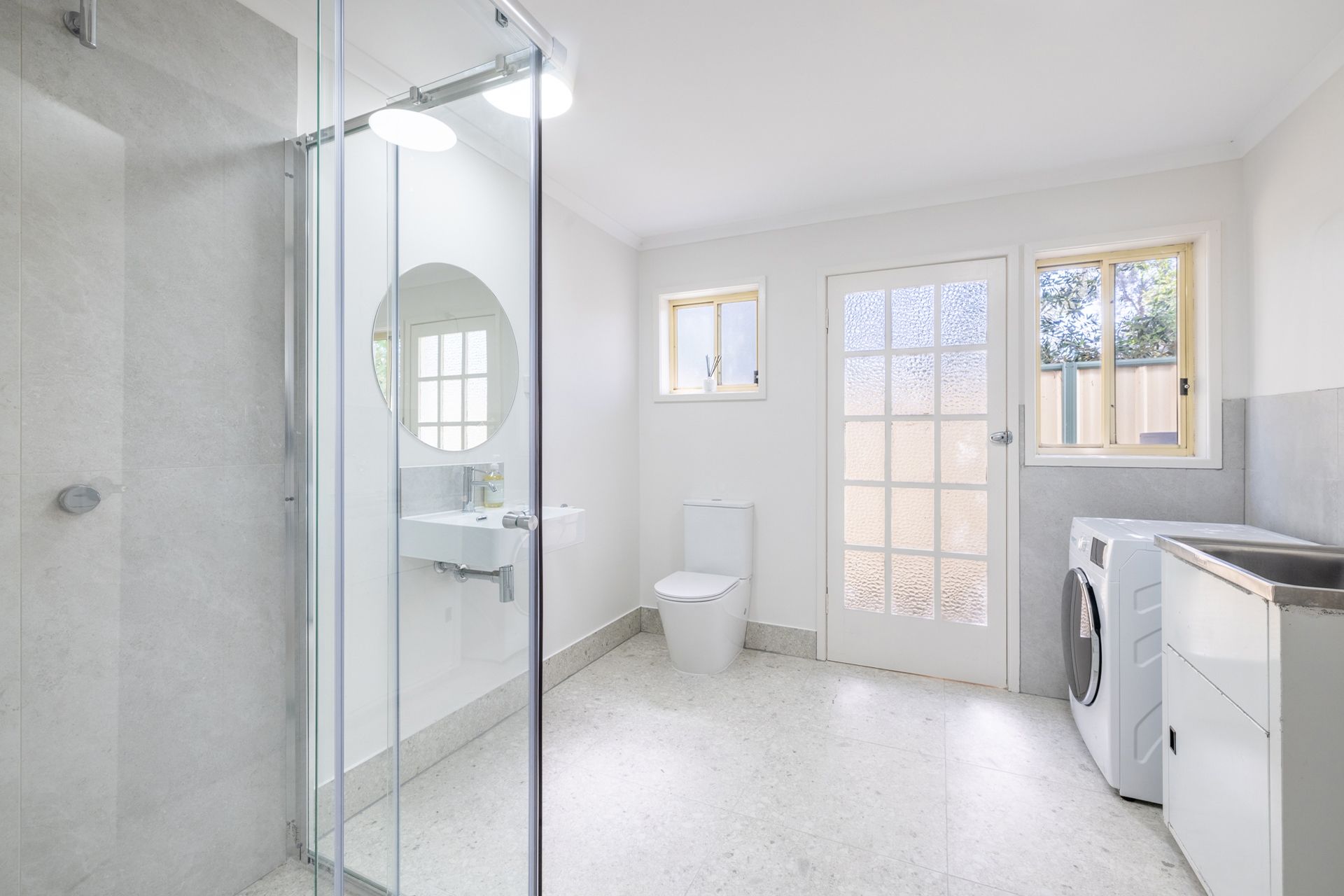 Downstairs you will find the fourth bedroom with a Queen bed and ceiling fan, plus an open plan bedroom area with Queen bed. There is an additional sitting area with Smart TV and ceiling fan, giving two separate spaces for entertainment. The laundry area also provides a stunning walk-in shower, toilet and floating timber vanity.