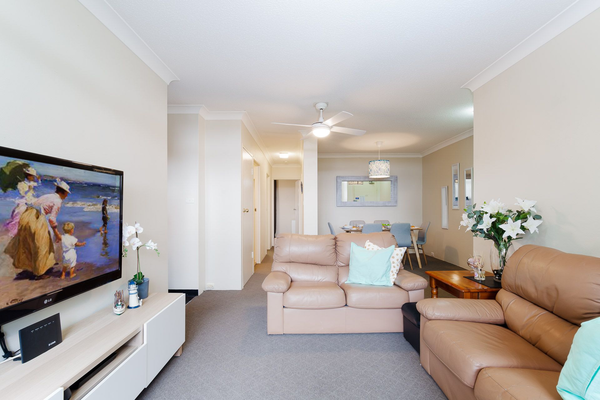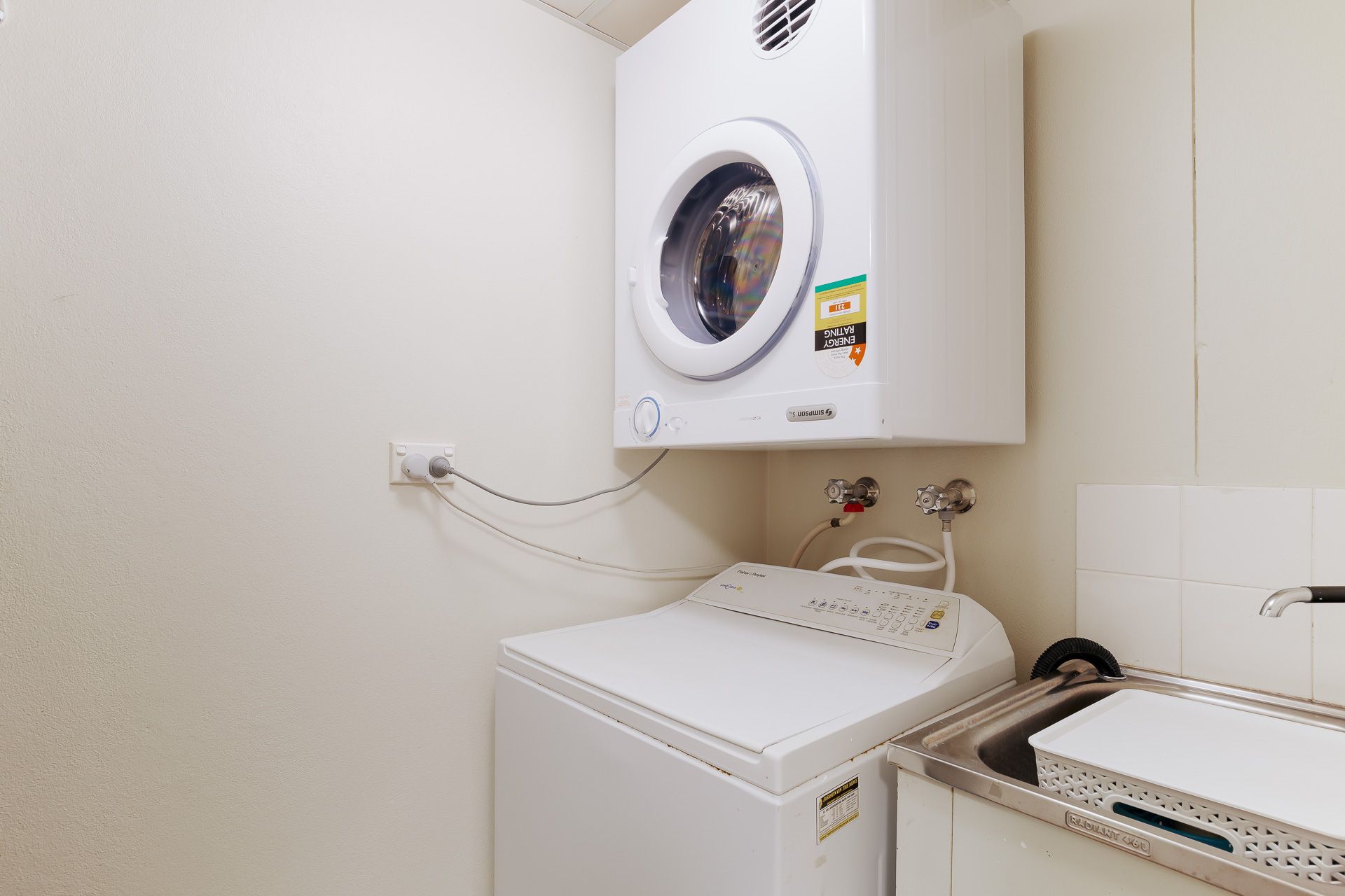 Two bedrooms both with balcony access and the main having a ceiling fan and the second having the second TV and large pedestal fan. The bonus of having a shower, bath and separate toilet and an internal laundry with a top loading washing machine and dryer is fantastic.