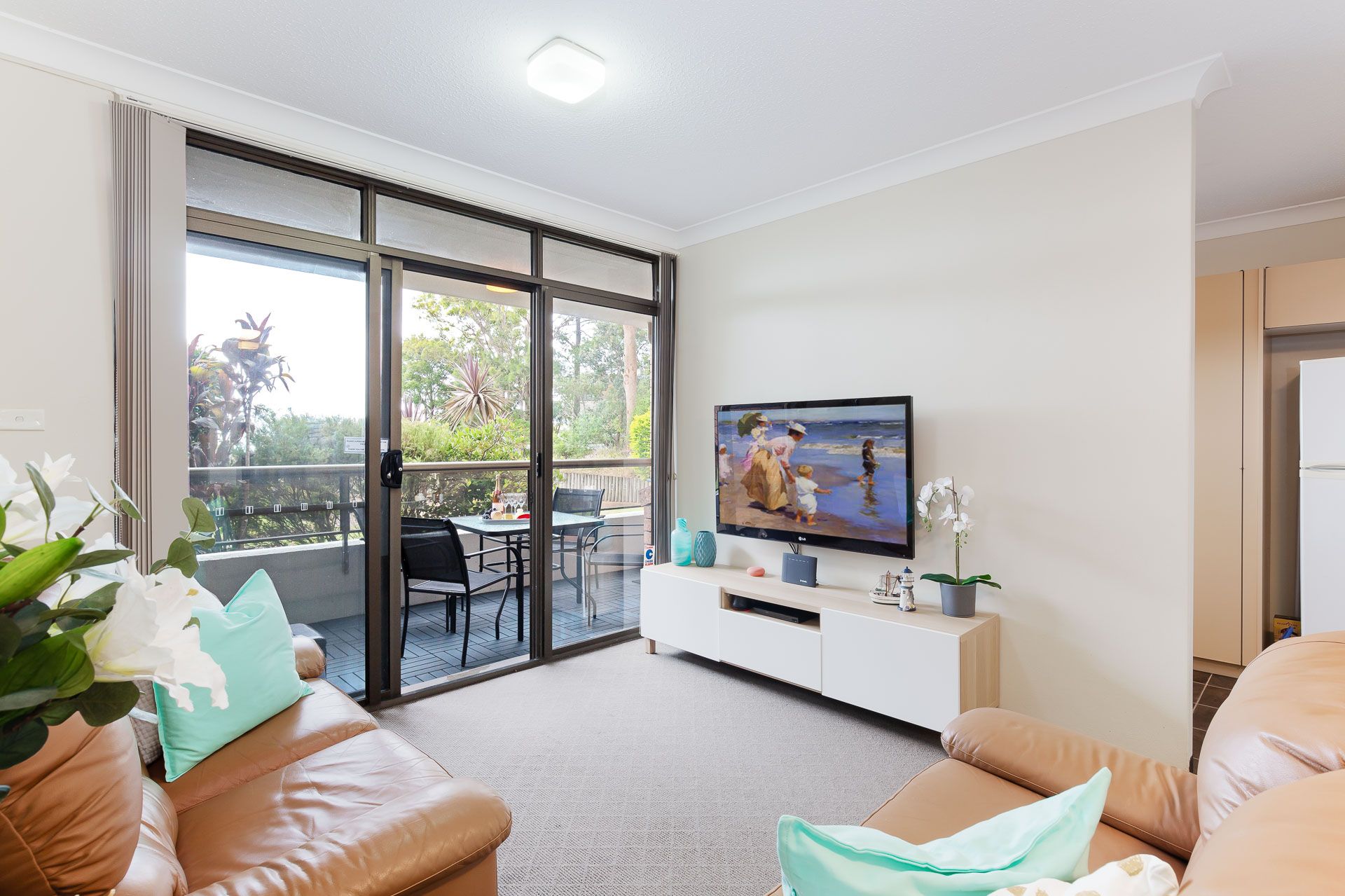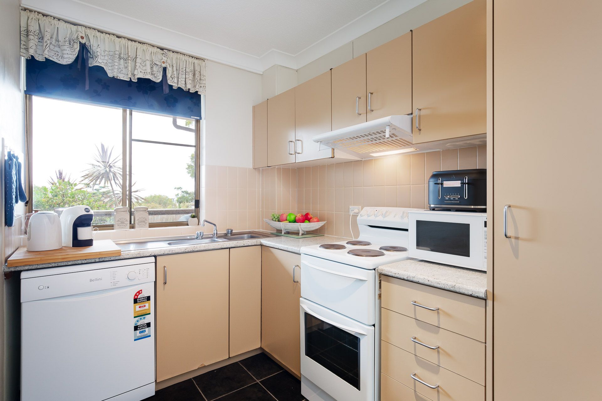 North facing with filtered water views and located on the ground floor with a sunny balcony out the front with a Weber Q BBQ and an open plan living area with split system Air Conditioner, large screen TV, DVD, streaming services, and unlimited high-speed Wi-Fi. Beautiful sea breezes flow through the unit due to having front and rear balconies. The fully equipped kitchen has a dishwasher, microwave, Lavazza A Modo Mio Coffee Machine and complete cooking facilities.