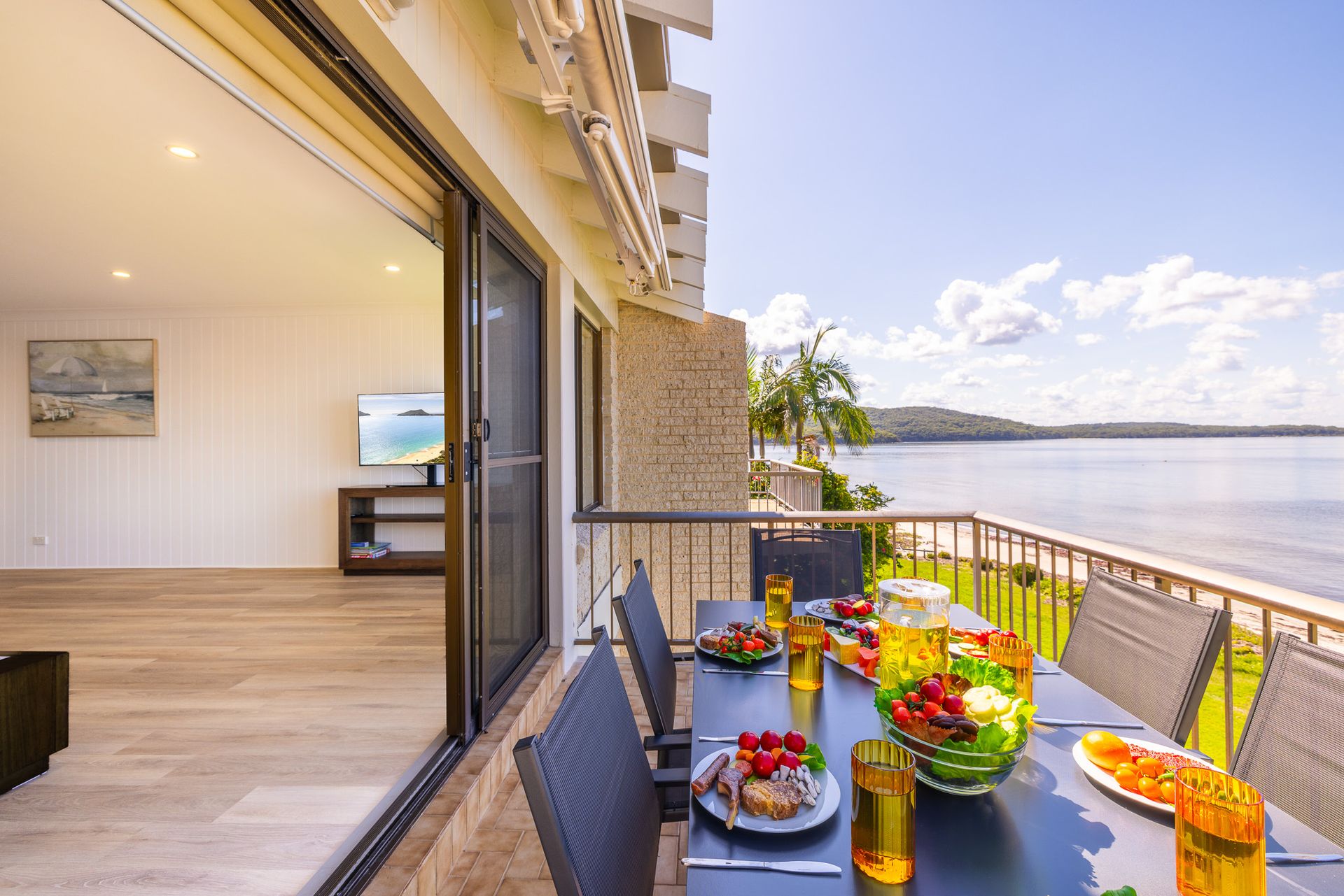 While the open-plan living area serves as a welcoming space to convene and share joyous moments, it provides air conditioning, a large screen TV, free unlimited Wi-Fi and assorted games for indoor entertainment. Flowing off the living area is the large wrap around balcony where you can dine while embracing the stunning waterfront or in the formal dining area off the kitchen. In addition, essentials like an internal laundry with front loader washing machine and dryer, and single open car space are taken care of.