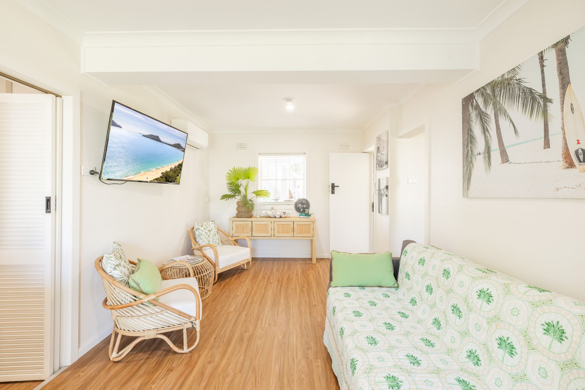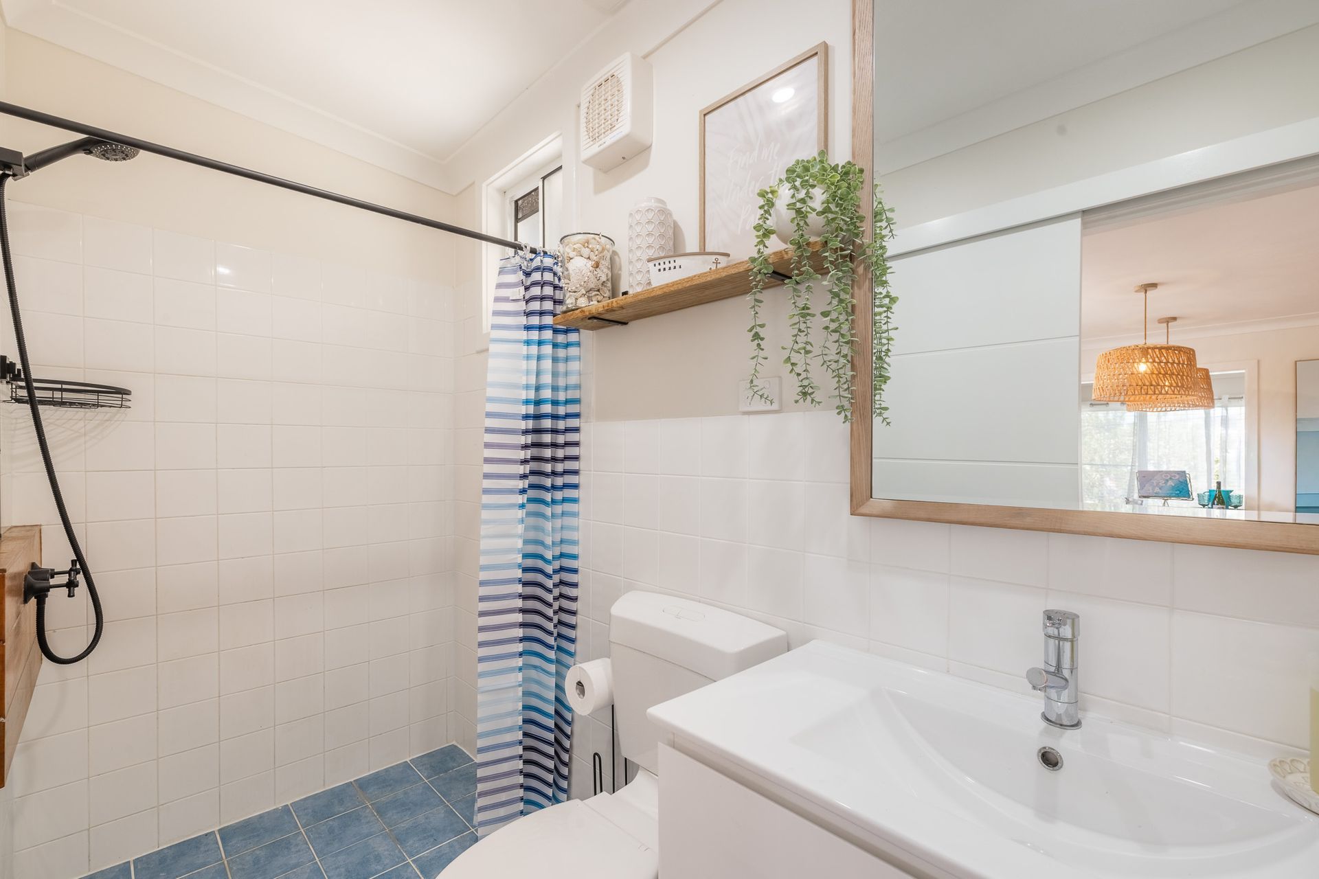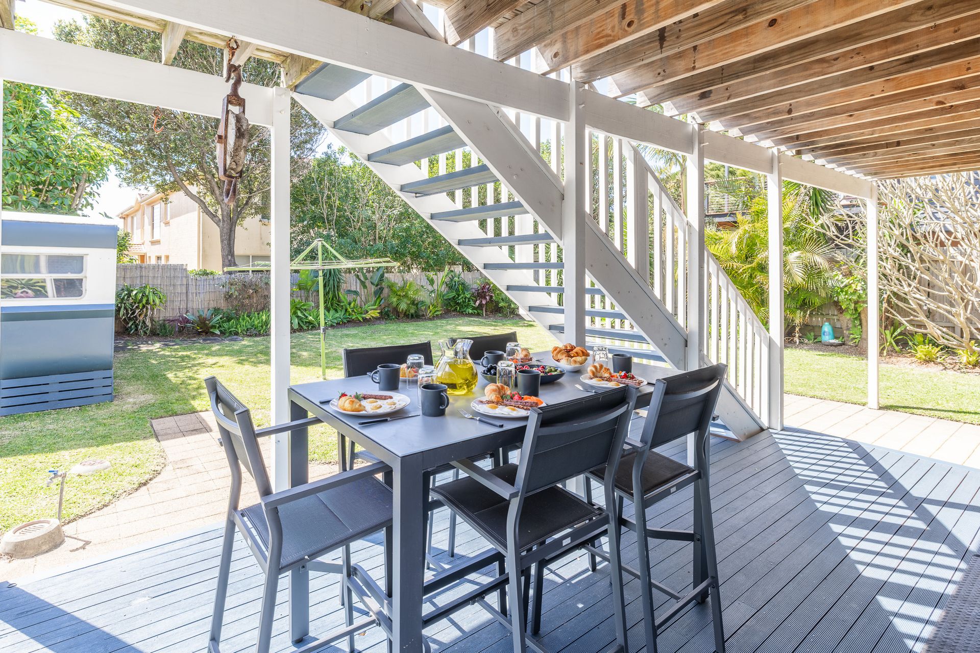 The spacious floor plan includes external stairs leading upstairs to two open plan living areas, kitchen, three bedrooms with ceiling fans and bathroom with shower, toilet, and vanity. The living areas offers a stylish haven to retreat from the sun, featuring a big screen smart TV, comfortable lounge seating, and split system air conditioning for year-round comfort. Preparing meals become a true delight in the fully equipped kitchen, featuring appliances such as a dishwasher, microwave oven, induction cooktop, family size fridge with a water dispenser and an all-important De’Longhi coffee pod machine. Dine and delight in the convivial atmosphere in the intimate dining area or enjoy the outdoor alfresco dining whilst taking in the magic of the serenity.