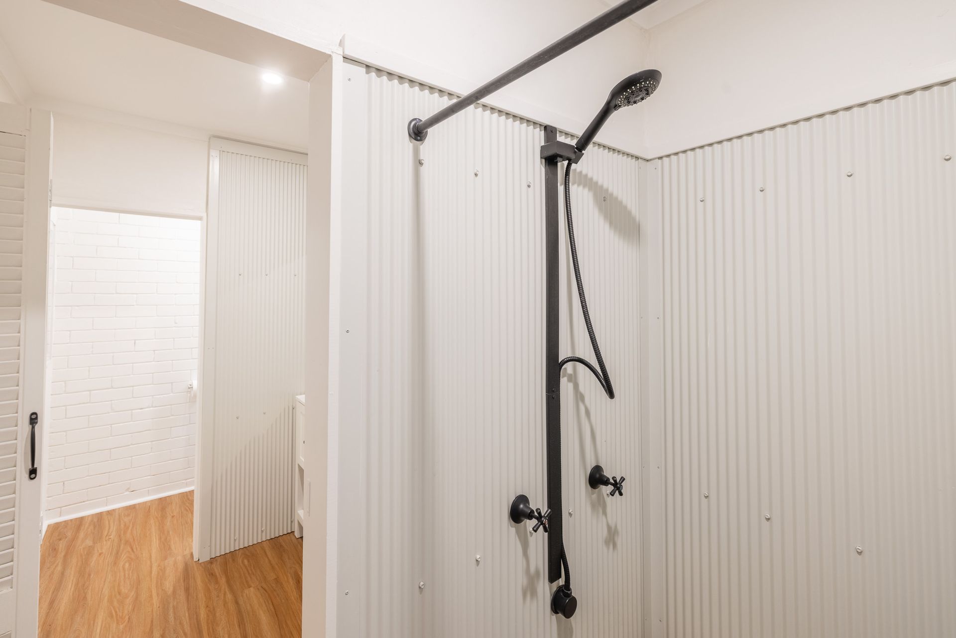 Bedroom 4 – Queen Bed + Ceiling Fan + Portable Hanging Rack + Living Area with Air Conditioning + Bathroom