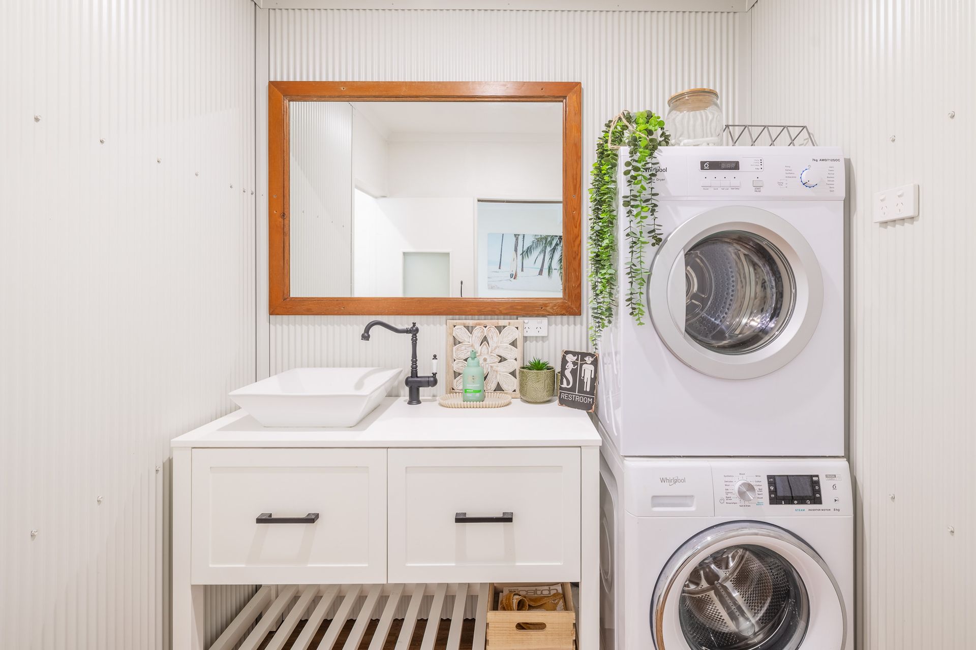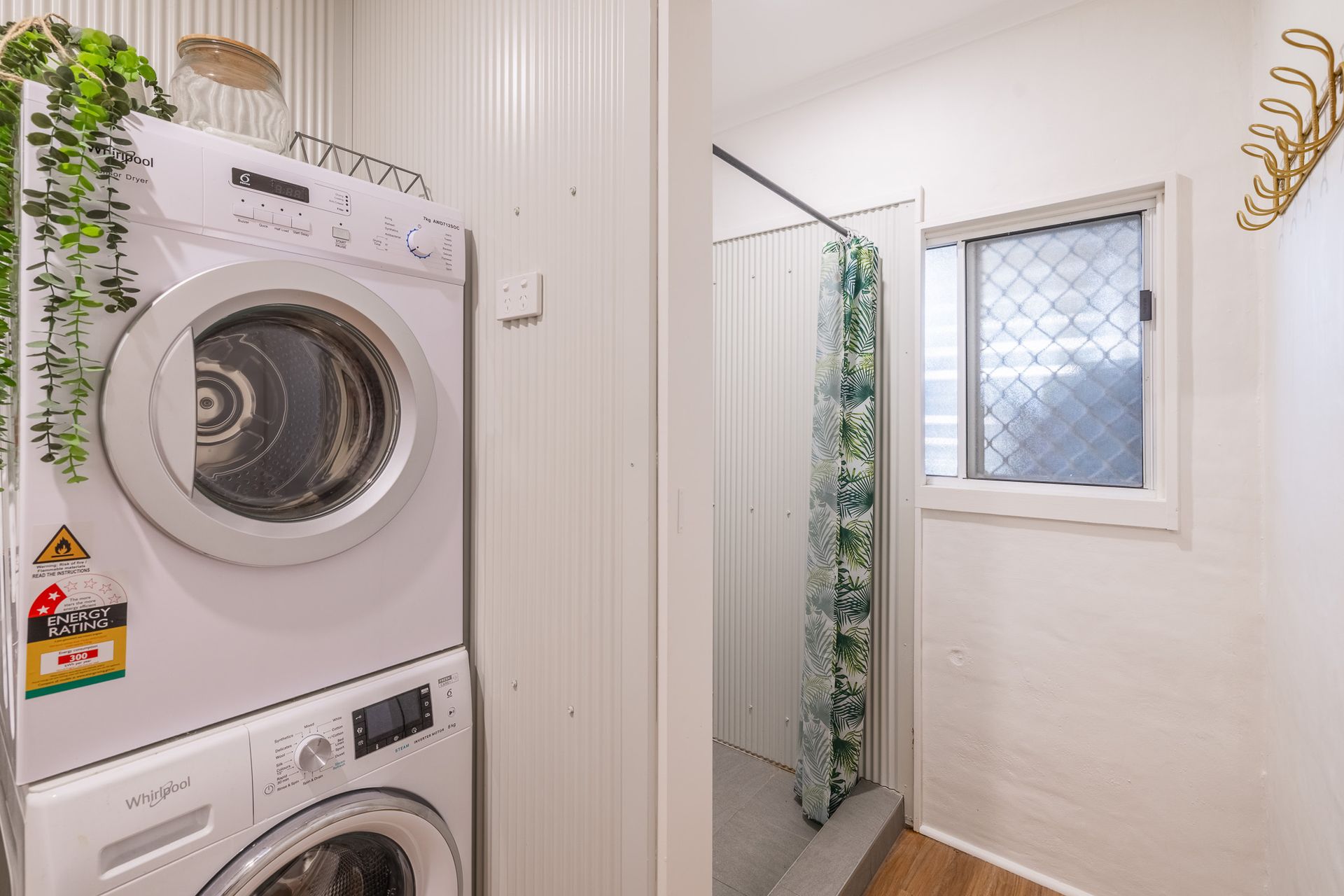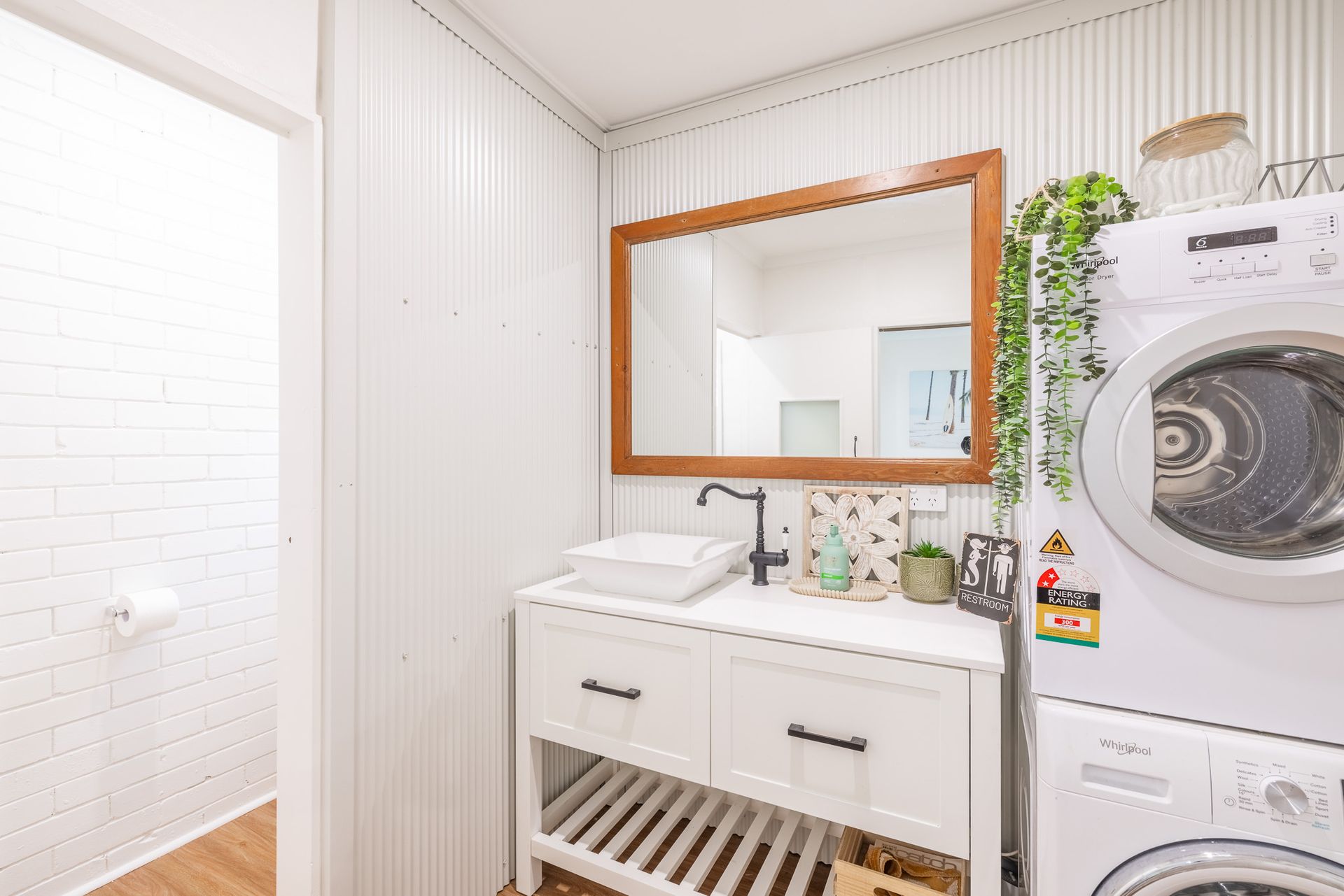 • Downstairs Internal laundry with front loader washing machine + dryer located in bathroom