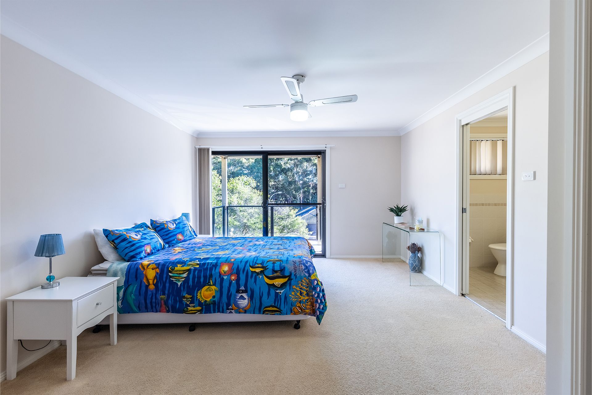 Bedroom 1 (upstairs) - Queen Bed + Ensuite + Ceiling Fan + Balcony Access + Port-a-Cot