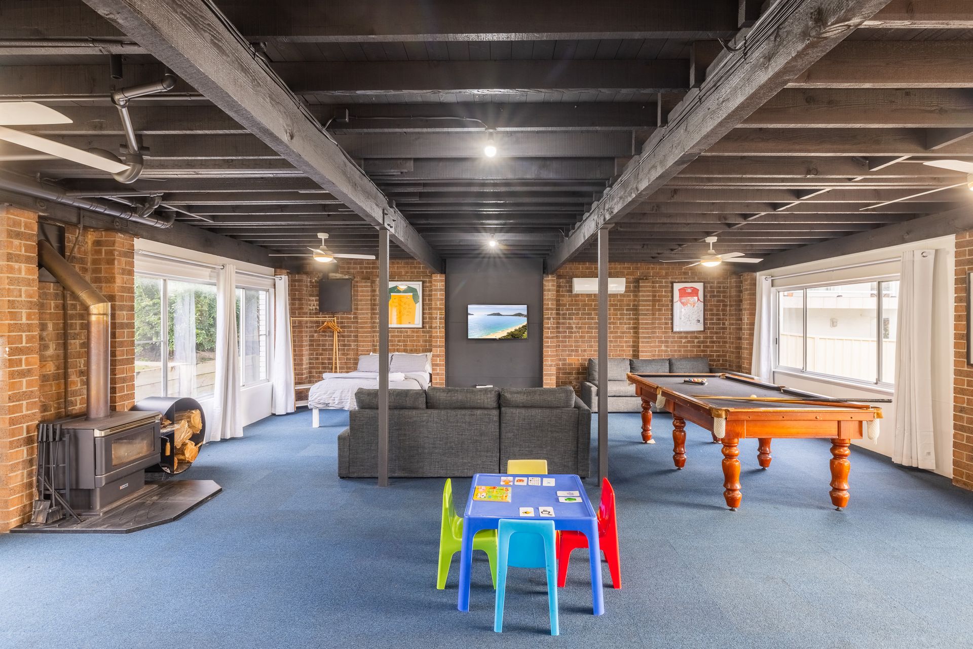 Bedroom 4 (downstairs) – Queen Bed + Split System Air Conditioner + Ceiling Fan + Timber Fireplace + Linen + Bed Making + Open Plan Games Area with bar fridge and sink.
