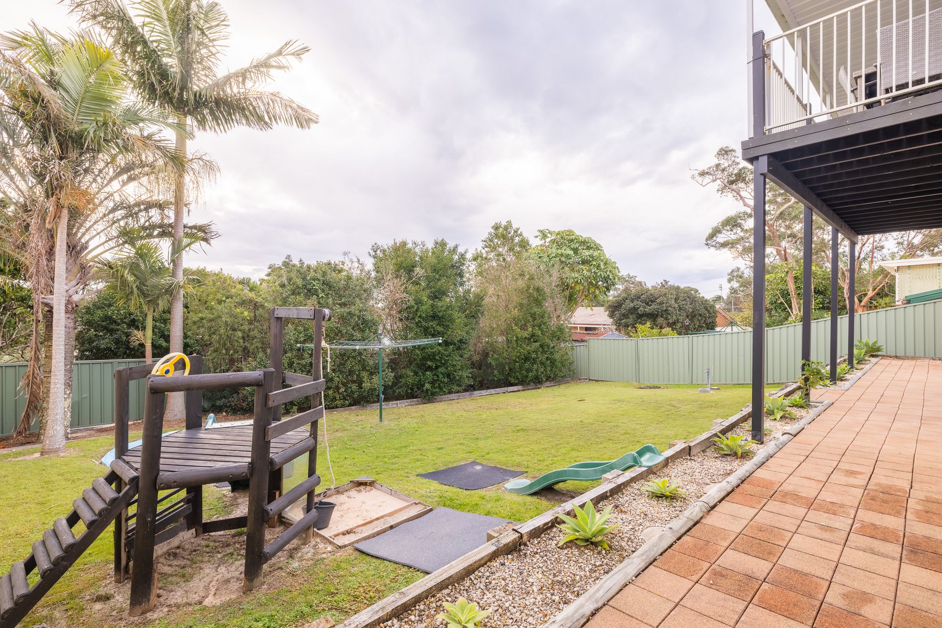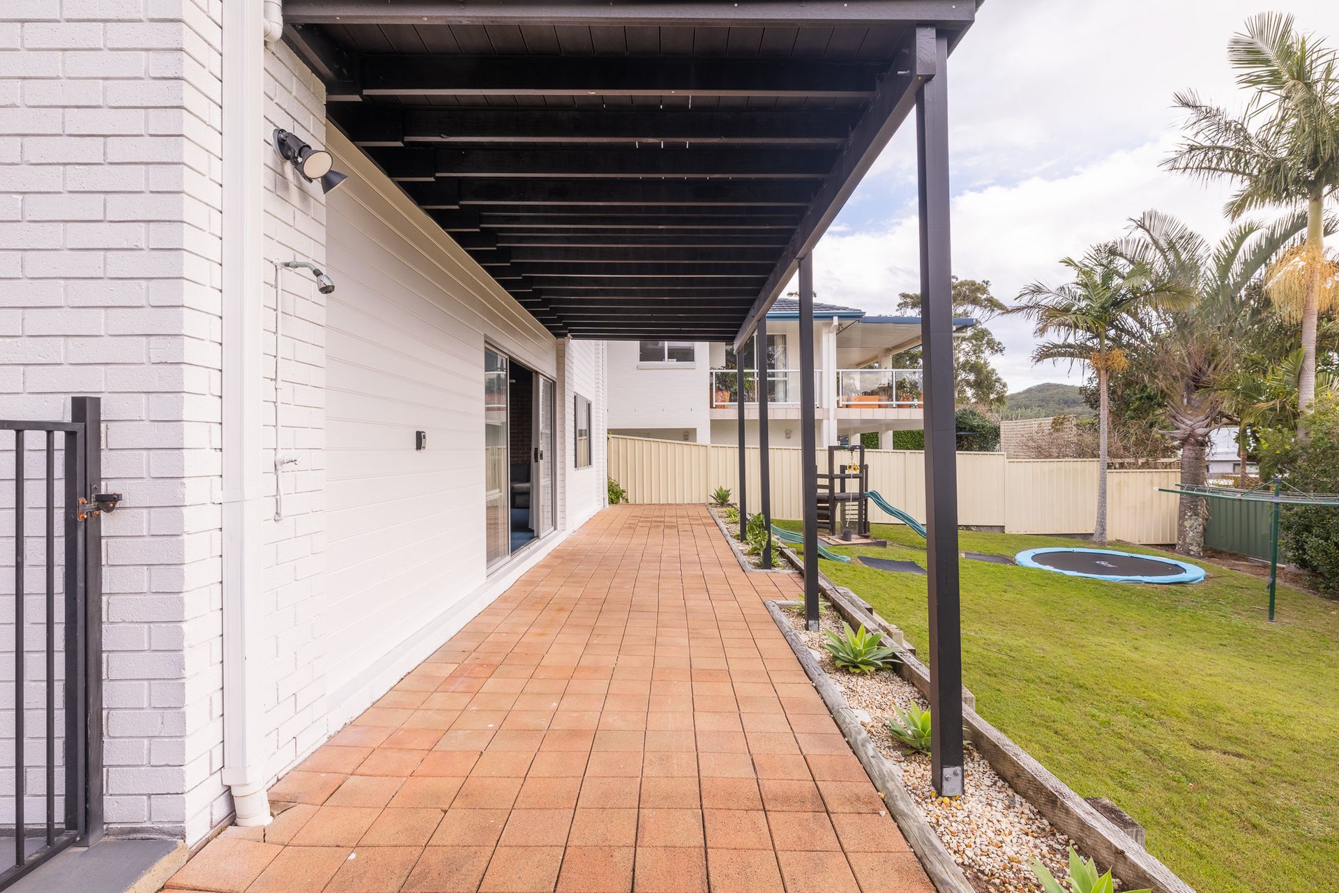 • Enclosed back yard with trampoline, sandpit, slide, outdoor shower