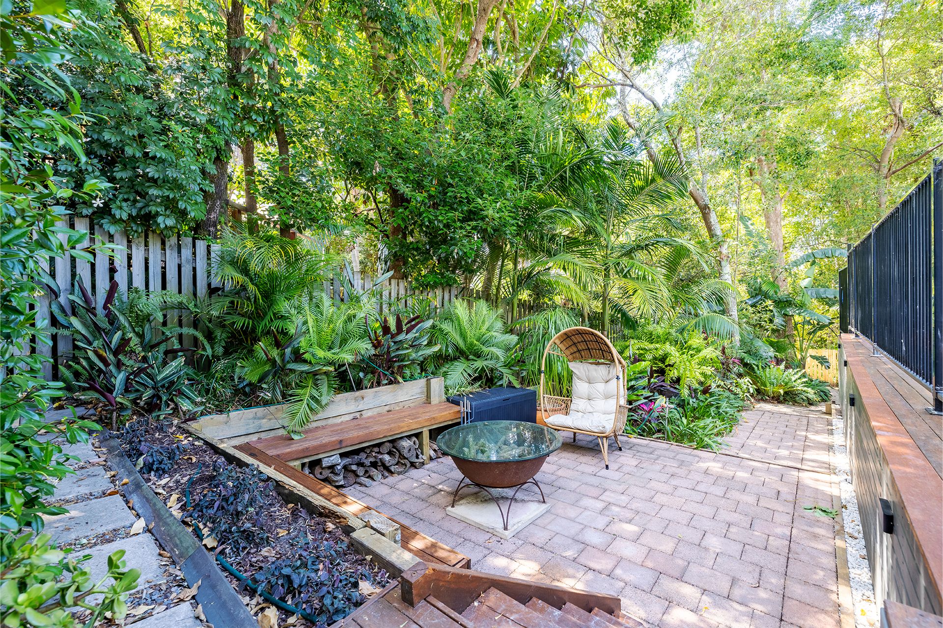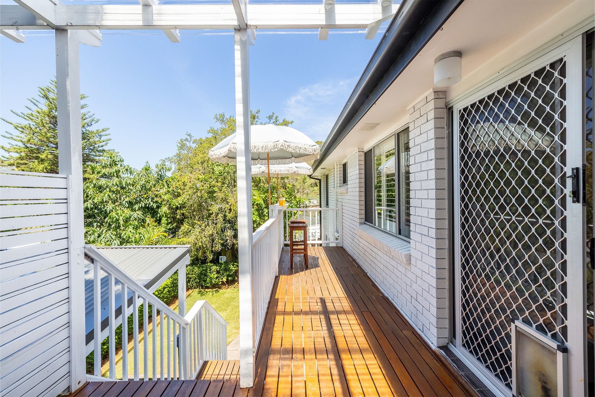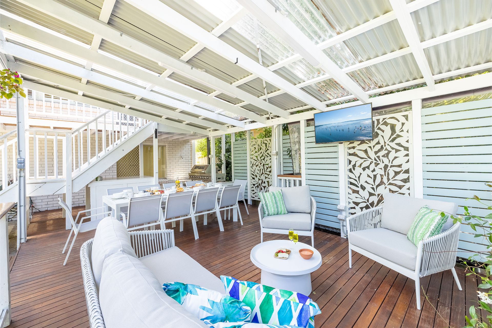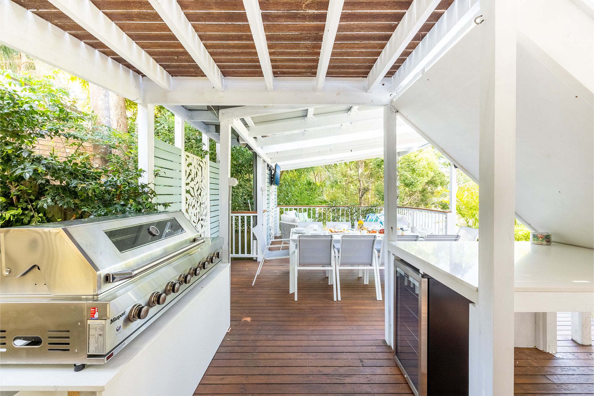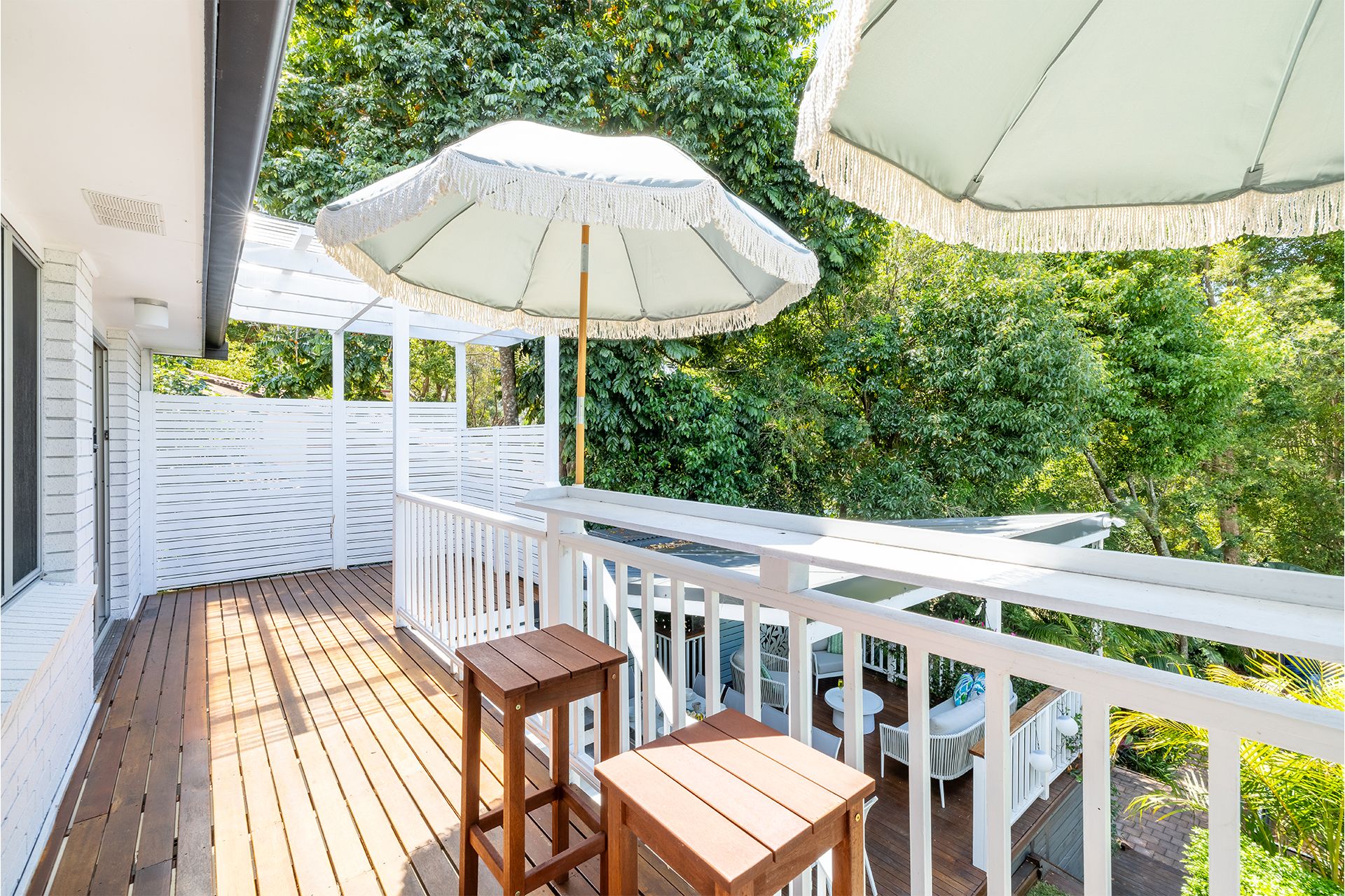 Opening off from the living area is the upper deck area where you can enjoy the garden and pool views from the bar area and stools, shaded by large umbrellas that can easily be set up for your convenience.