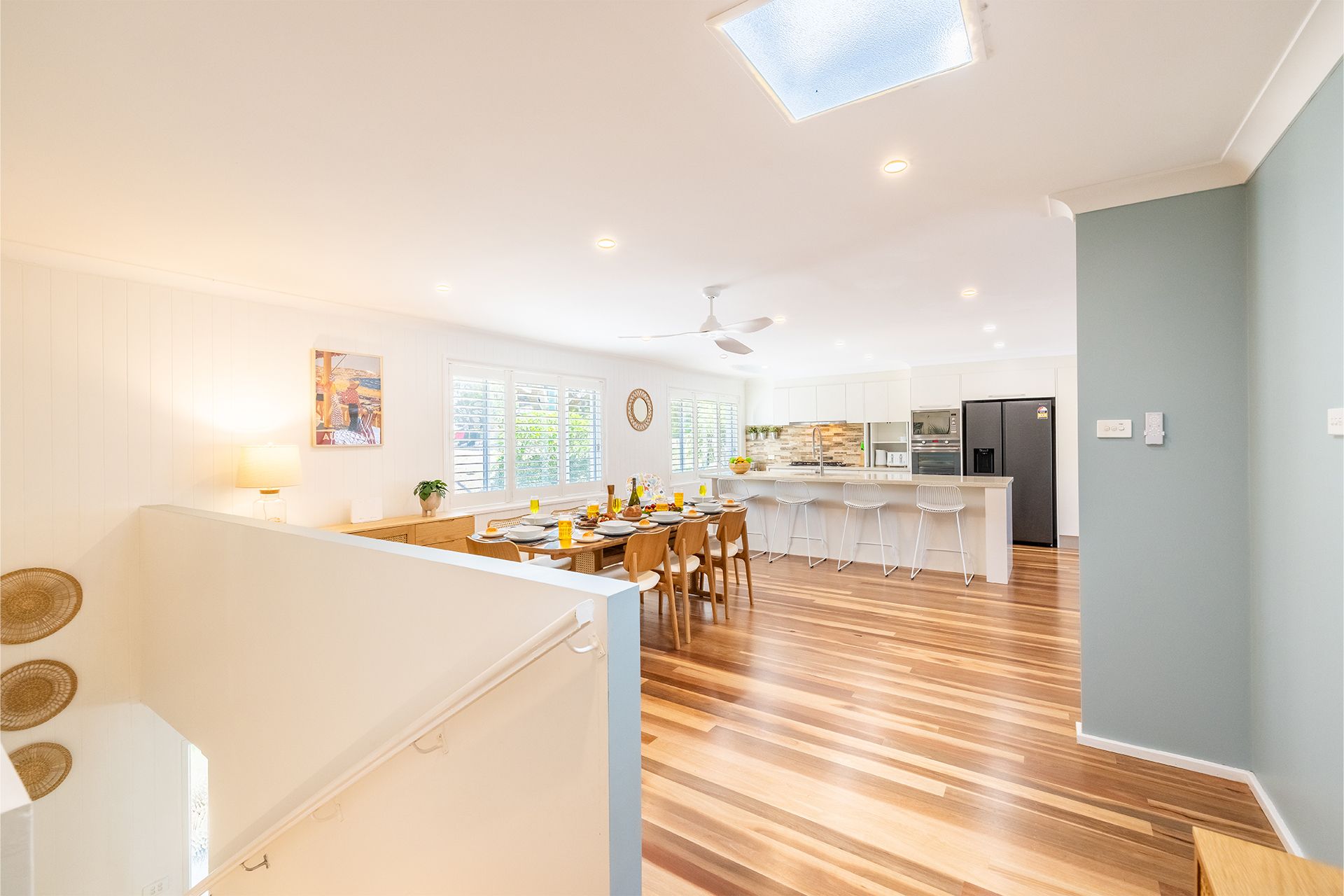 Flooded in natural light and stunning timber floors, the upper level features an air-conditioned open plan living area with a Smart TV (free access to Netflix and Paramount+ provided), ceiling fans, and a study nook for two persons. There is also a large fully equipped kitchen with complete cooking facilities including gas cooktop, wall electric oven and grill, microwave, dishwasher, family size fridge/ freezer with cold water dispenser and ice maker, a Sunbeam Mini Barista coffee machine with coffee provided, and a large pantry with all the cooking essentials provided – making it a beautiful space to prepare meals.