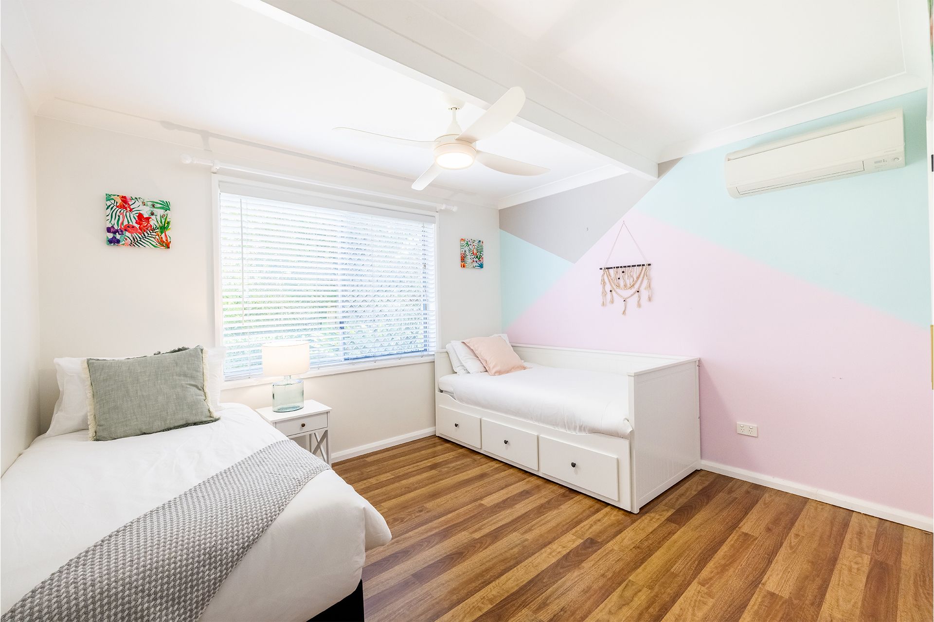 Bedroom 4 (downstairs) – Single Bed + Single Divan Bed which converts to a King Bed + Split System Air Conditioner + Ceiling Fan.